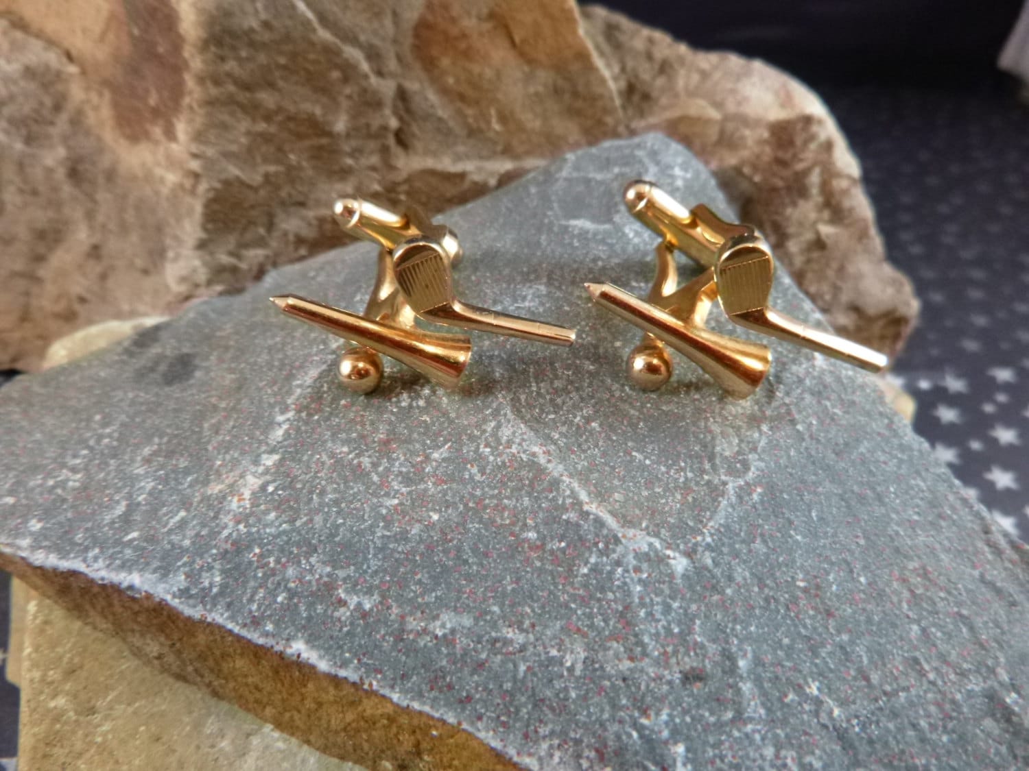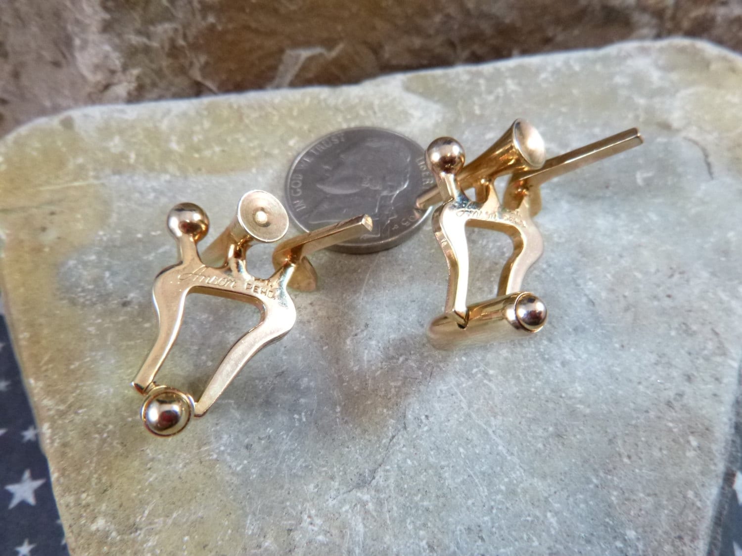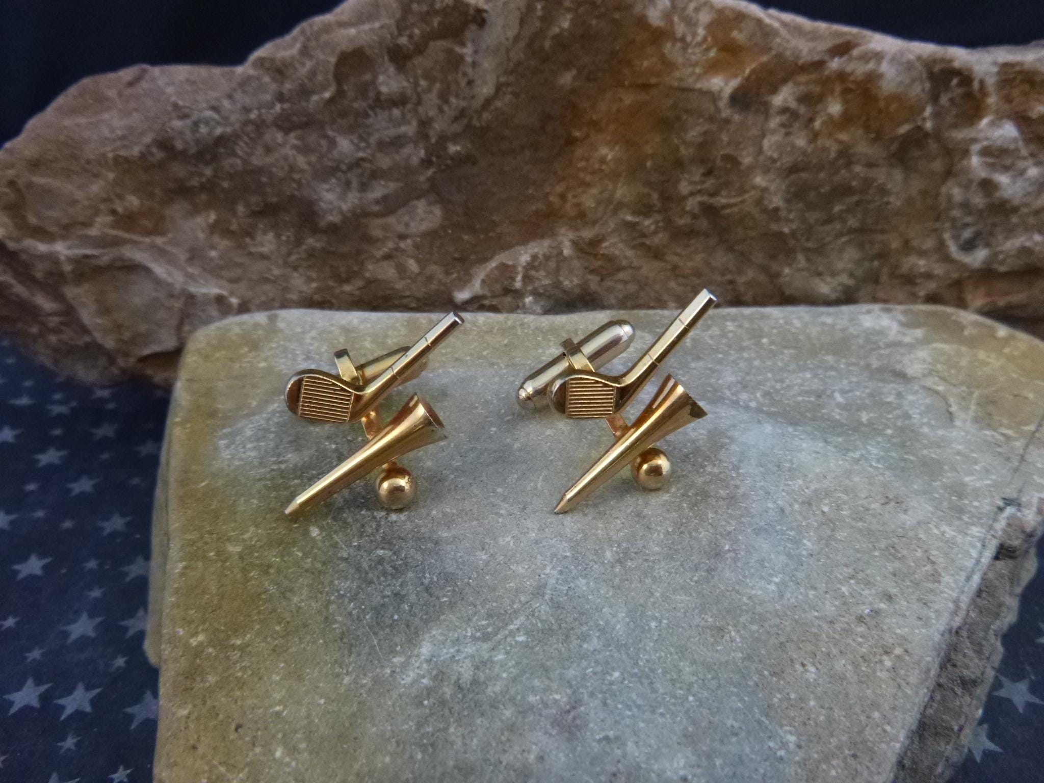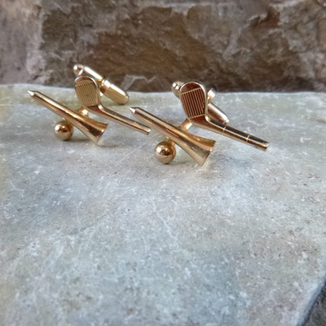These gold tone cufflinks are likely from the l980s when, according to GQ, “cuff links made a roaring comeback.” The golf themed fronts measure just 1” in length and .75” in width. The back design is unusual and adds interests to the cuff links.