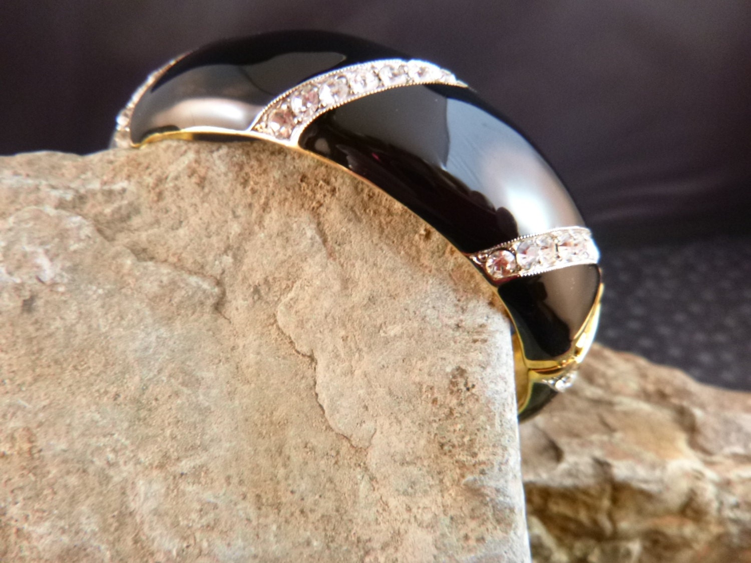 The exterior of the black enamel bracelet has eight channel set angled lines with seven sparkling rhinestones in each. All the rhinestones are intact and bright. The interior of the bracelet is a textured gold tone metal. It is an oval shaped bangle which fits perfectly along the wrist-arm connection area and very comfortable to wear. One side of the bracelet is hinged; the other has a slide-fastener.
