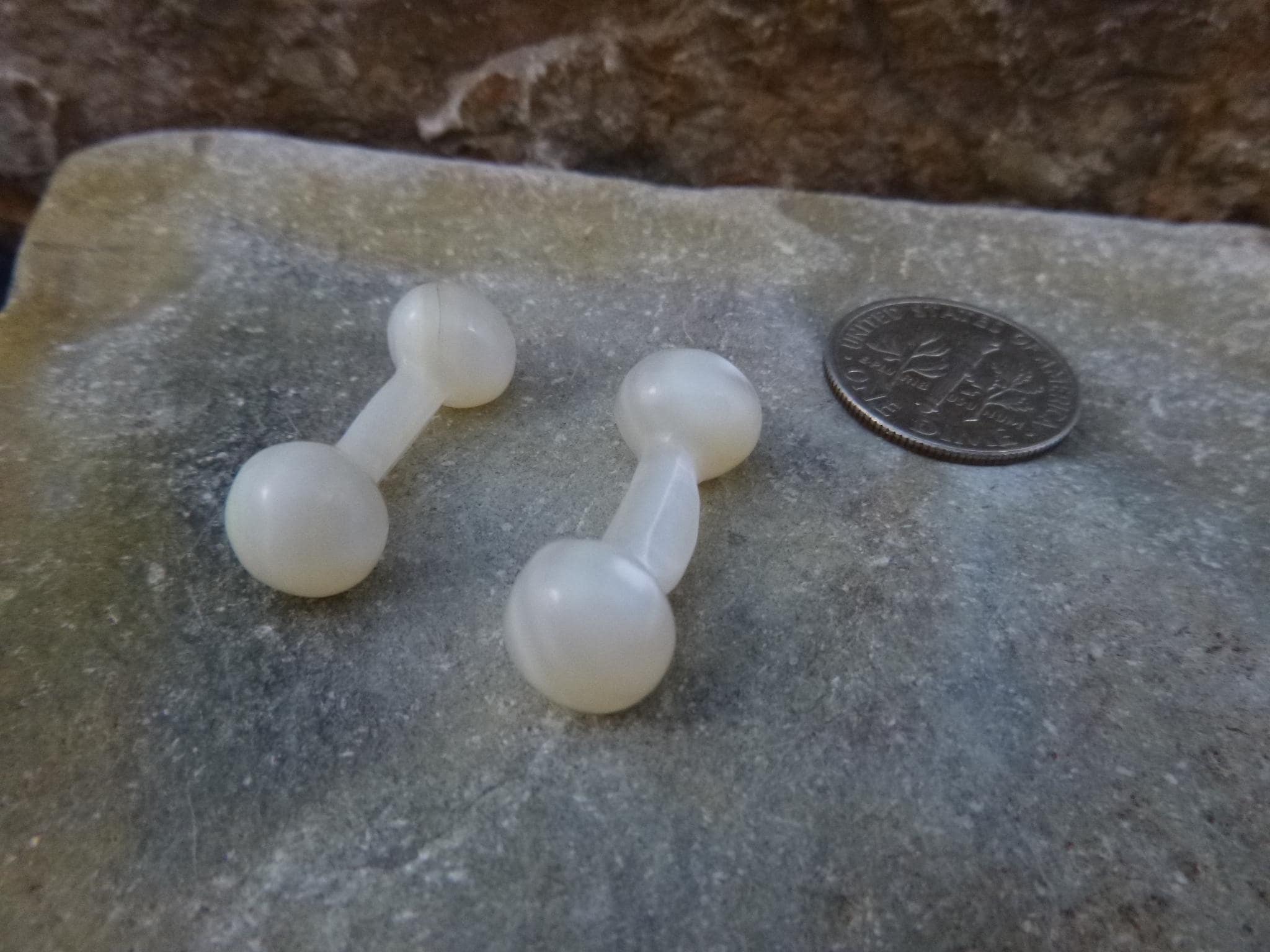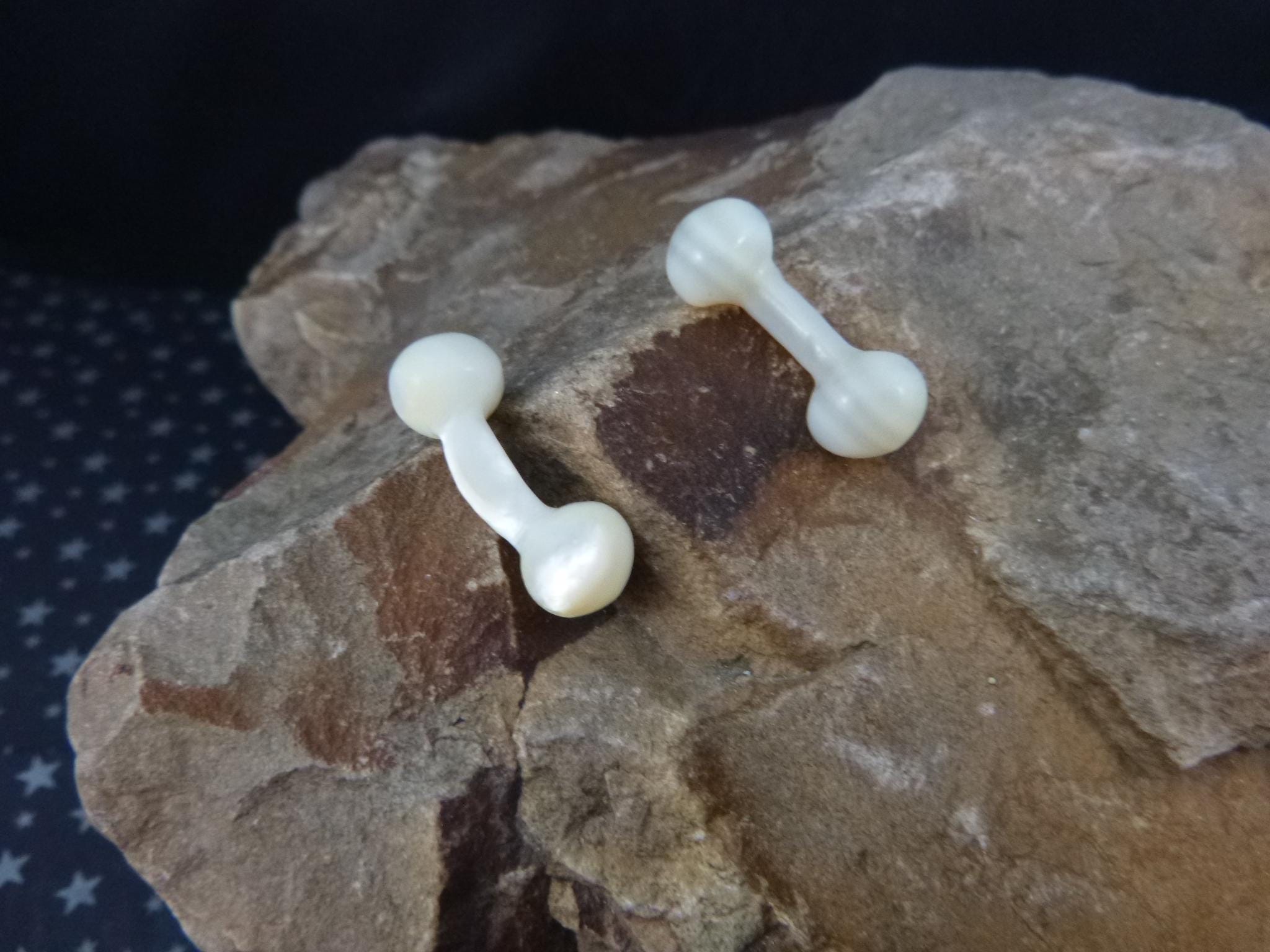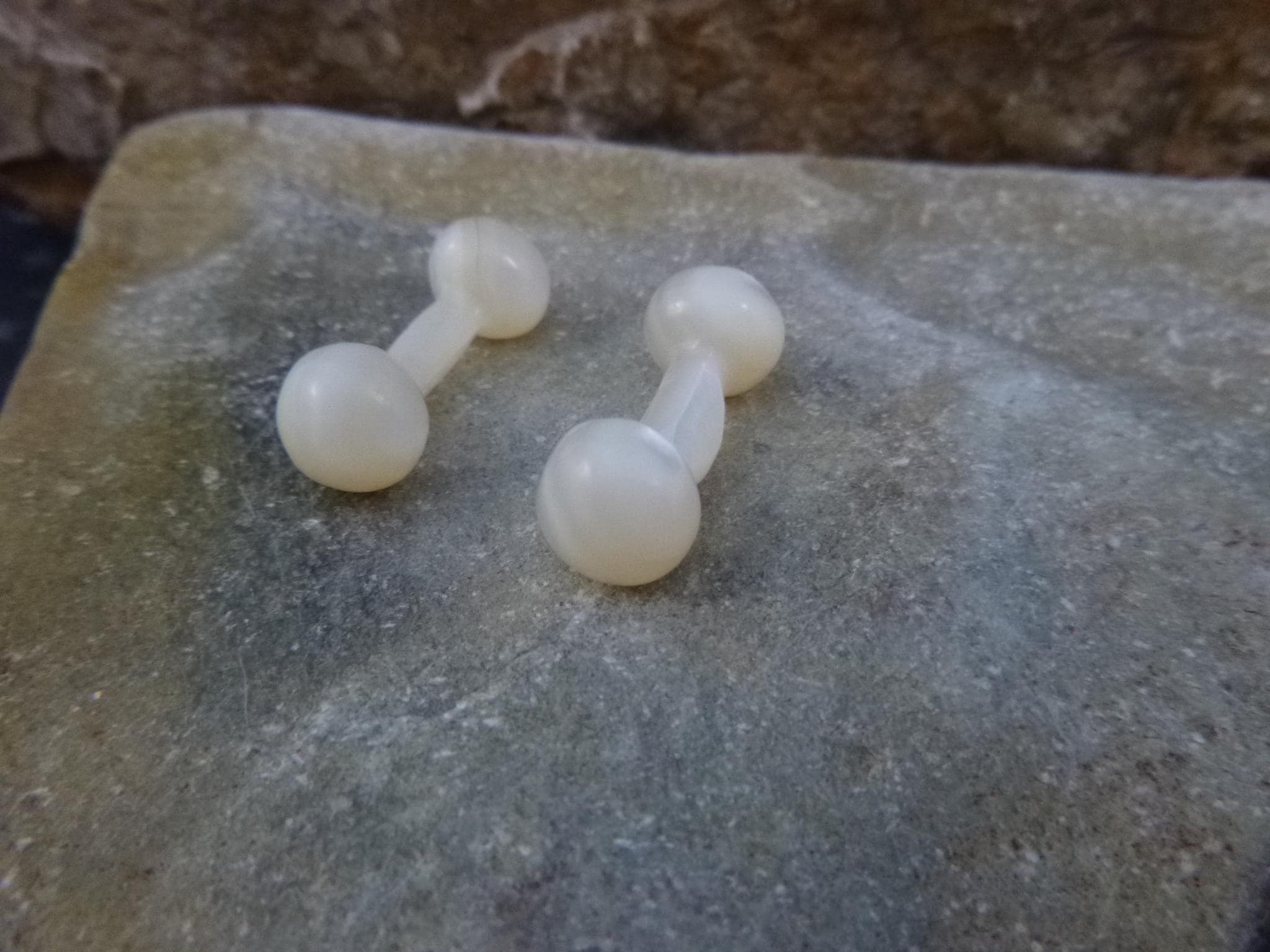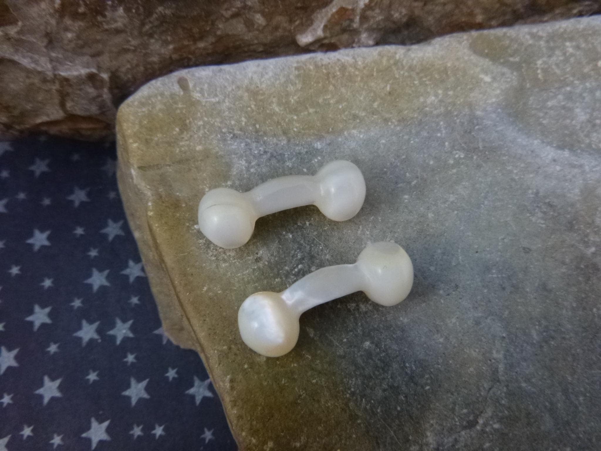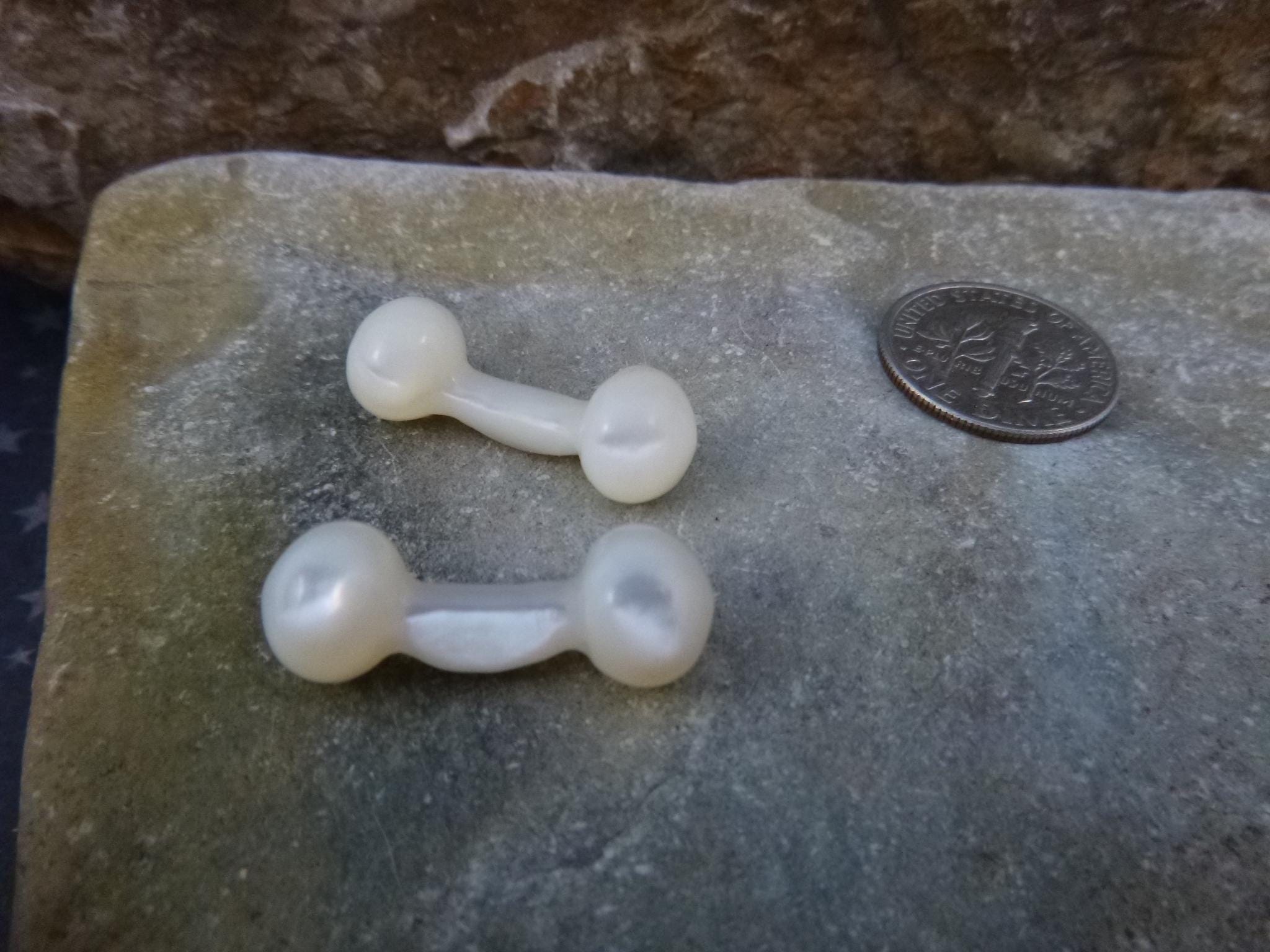 These two-sided l850s cufflinks have been handcrafted from a solid piece of mother of pearl. Their style is called a “ball motif.” They are distinctive, iridescent, and quite wonderful, especially if you are a lover of antiques or interesting and unique old jewelry. They measure 1” in length. The pictures offer greater perspective on the antique condition and elegant nature of these charming cuff adornments