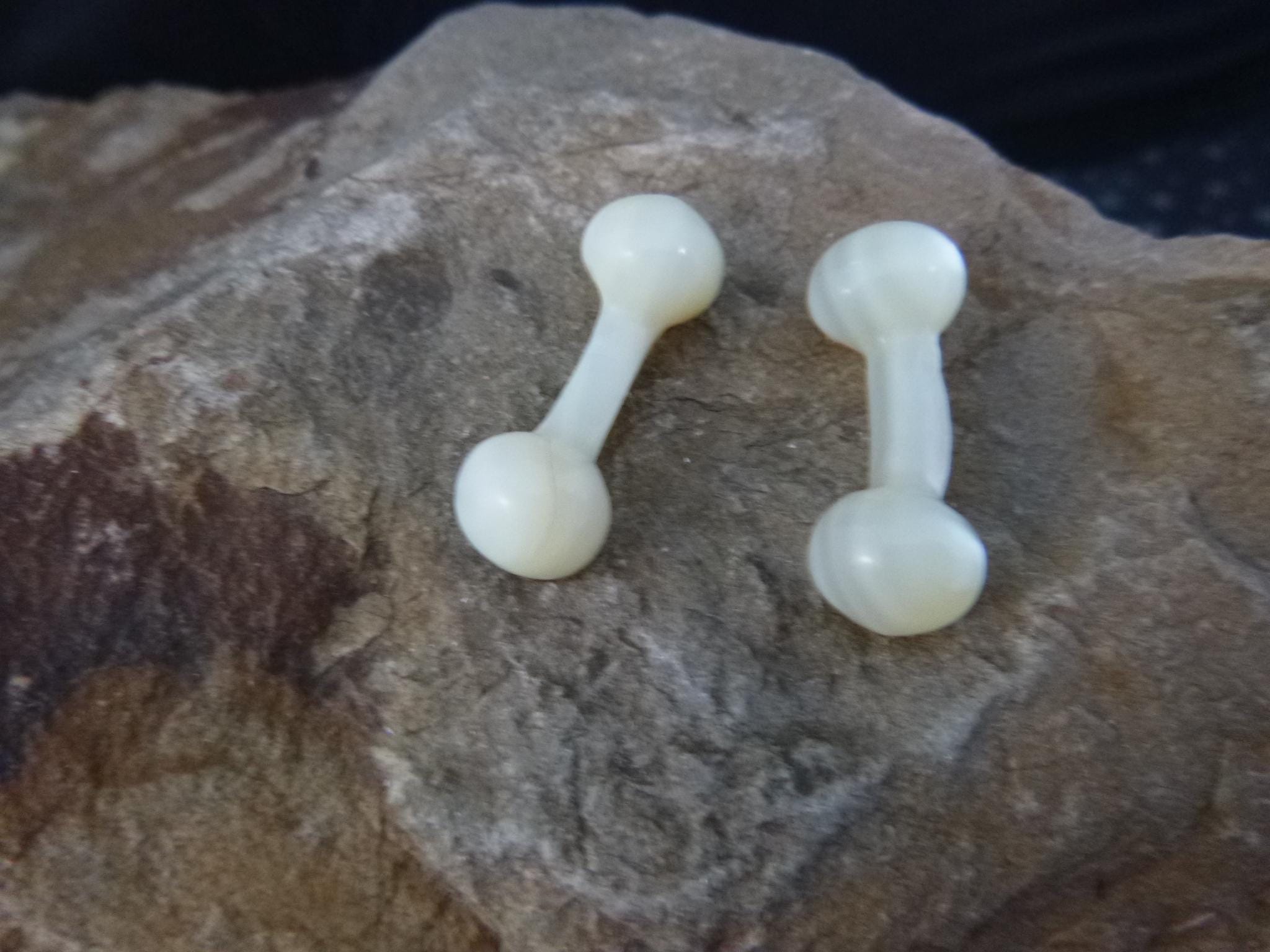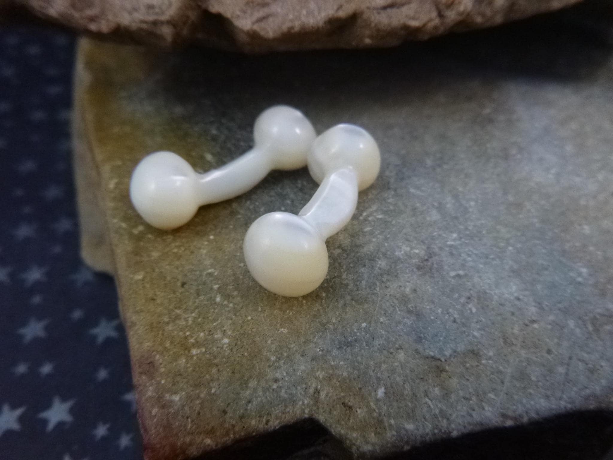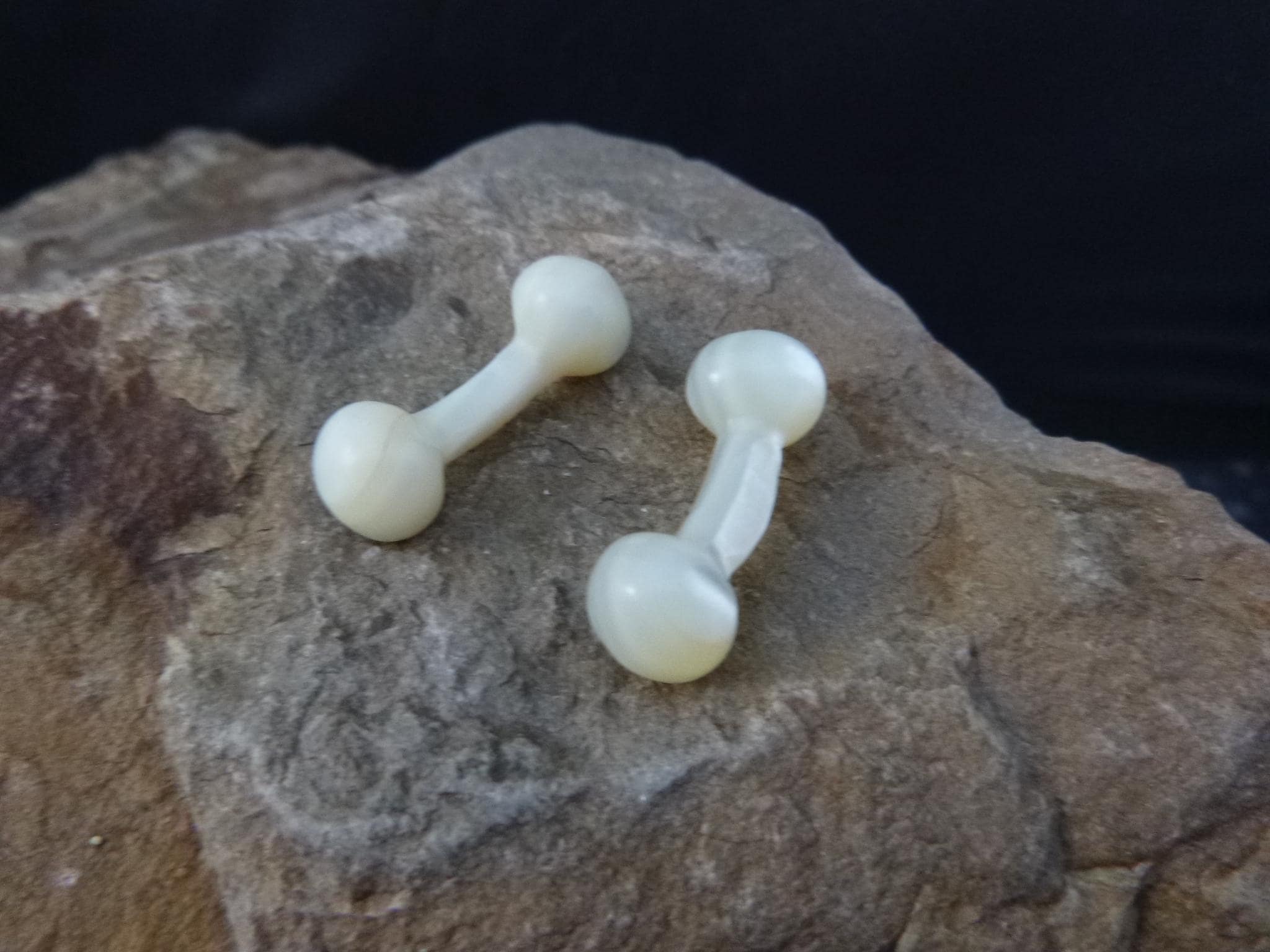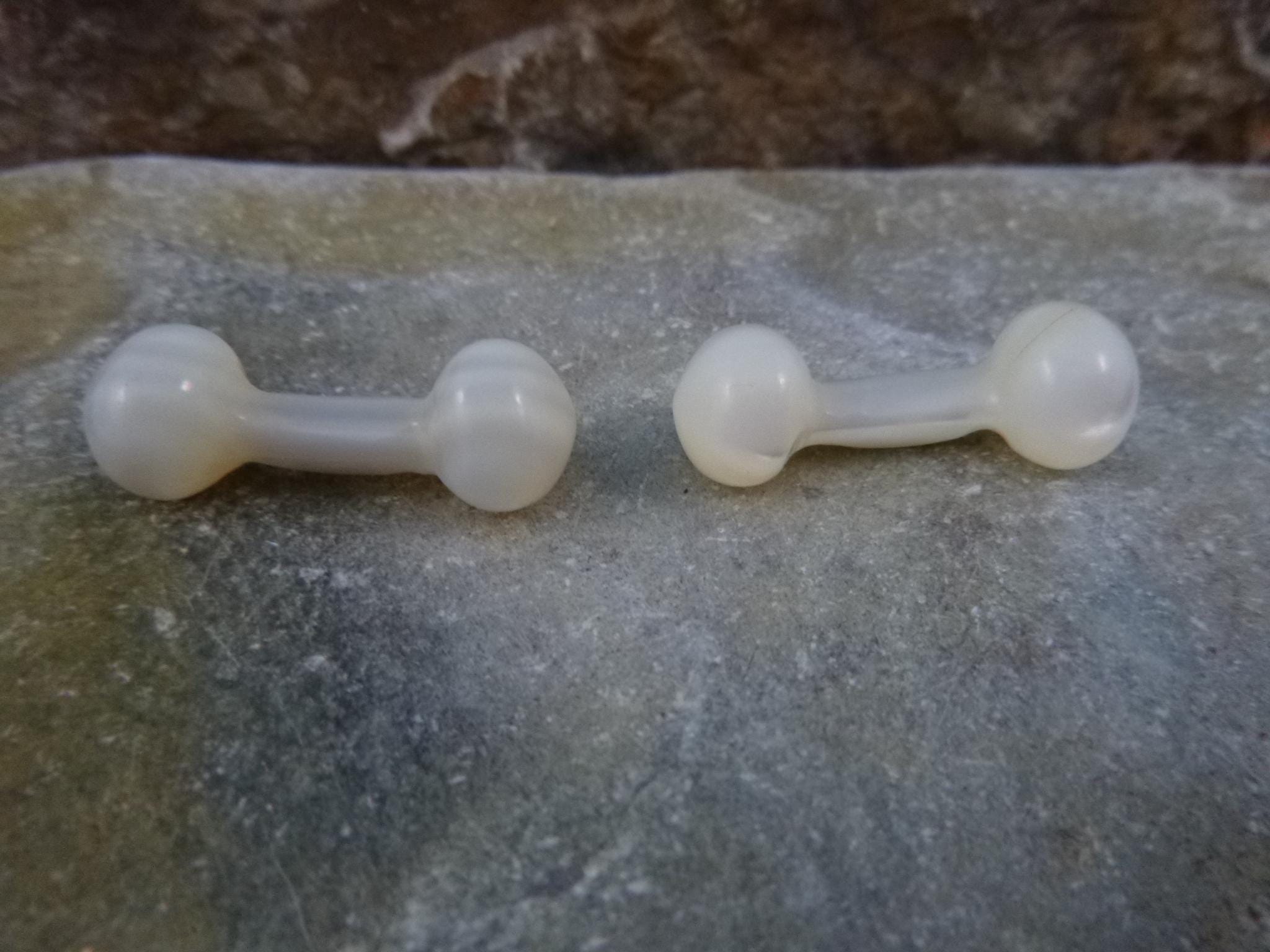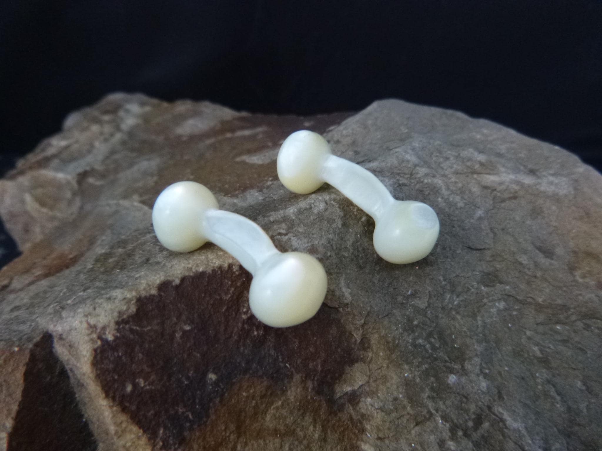 These two-sided l850s cufflinks have been handcrafted from a solid piece of mother of pearl. Their style is called a “ball motif.” They are distinctive, iridescent, and quite wonderful, especially if you are a lover of antiques or interesting and unique old jewelry. They measure 1” in length. The pictures offer greater perspective on the antique condition and elegant nature of these charming cuff adornments