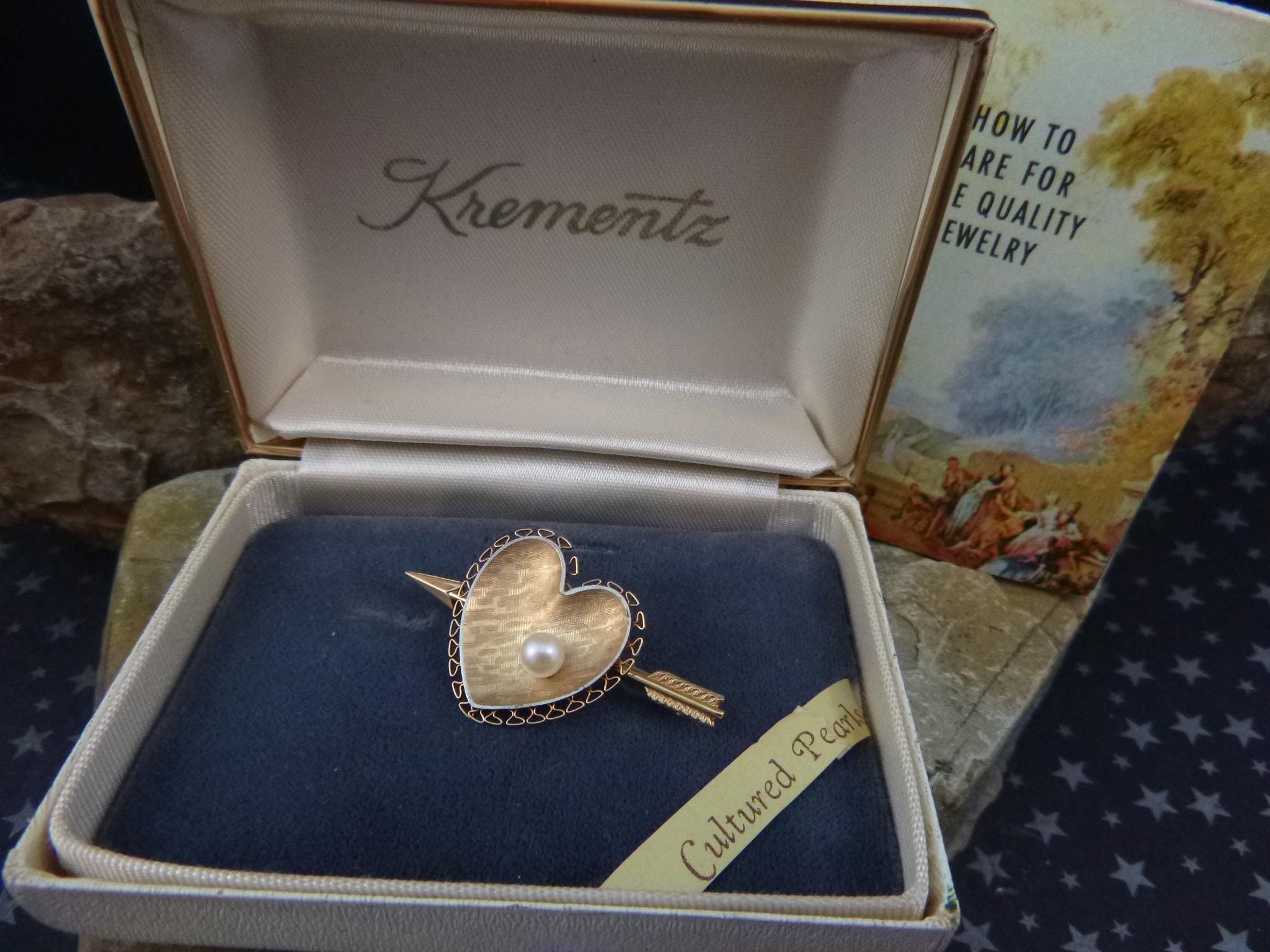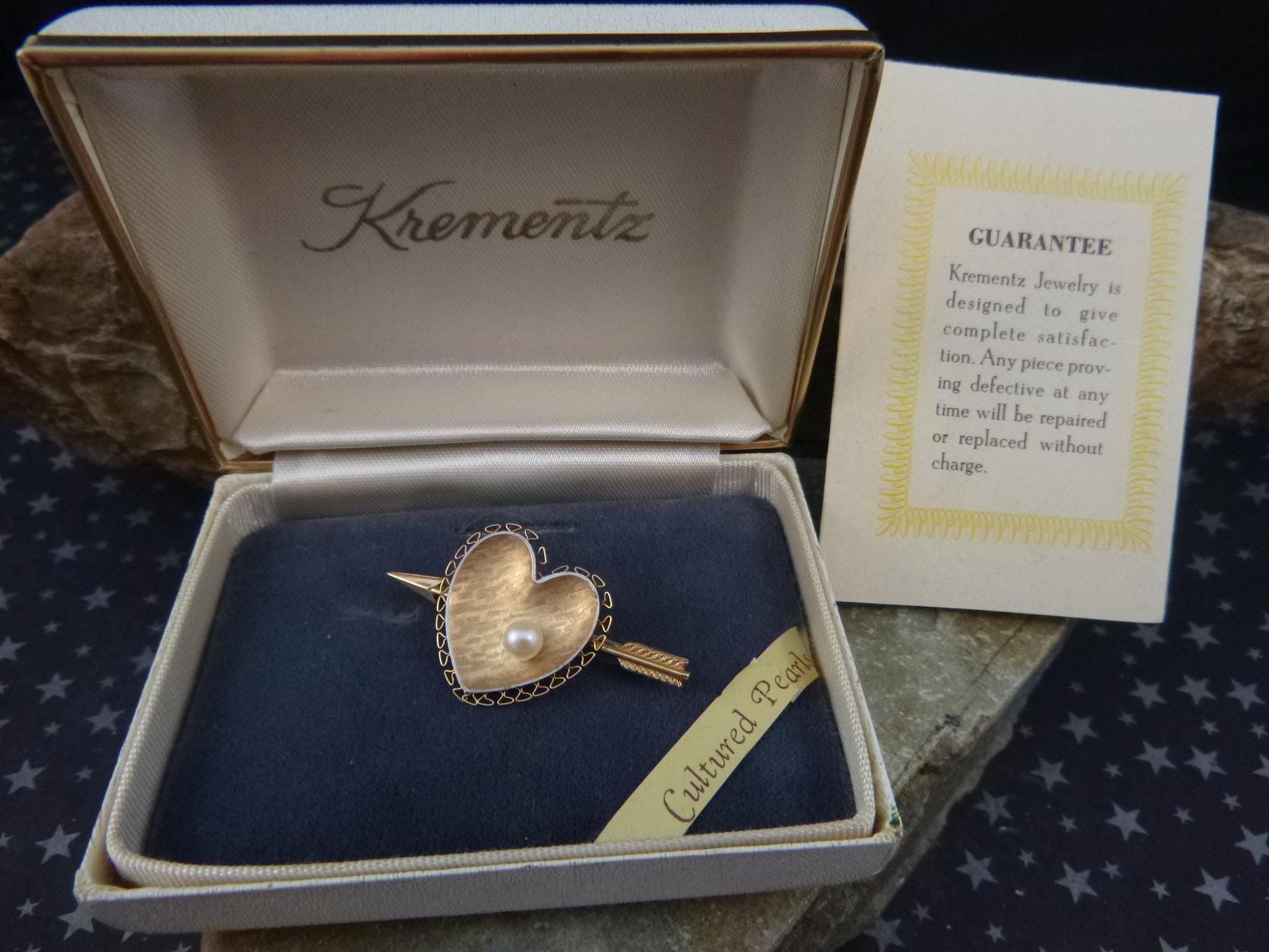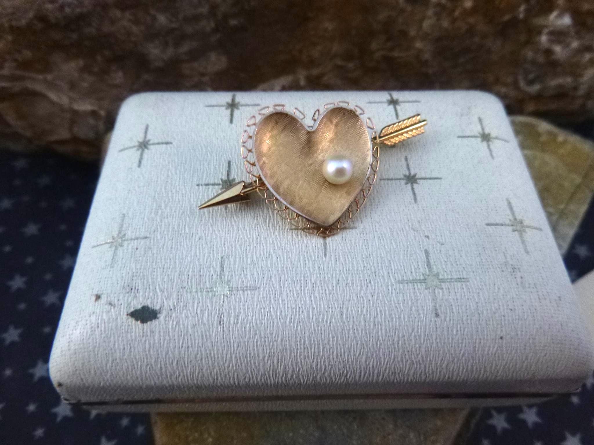 Likely from the l970s, this cultured pearl heart with an arrow is in its original presentation box with its original insert. On the back closure pin is “Krementz” in block letters which is hard to see without a magnifier.