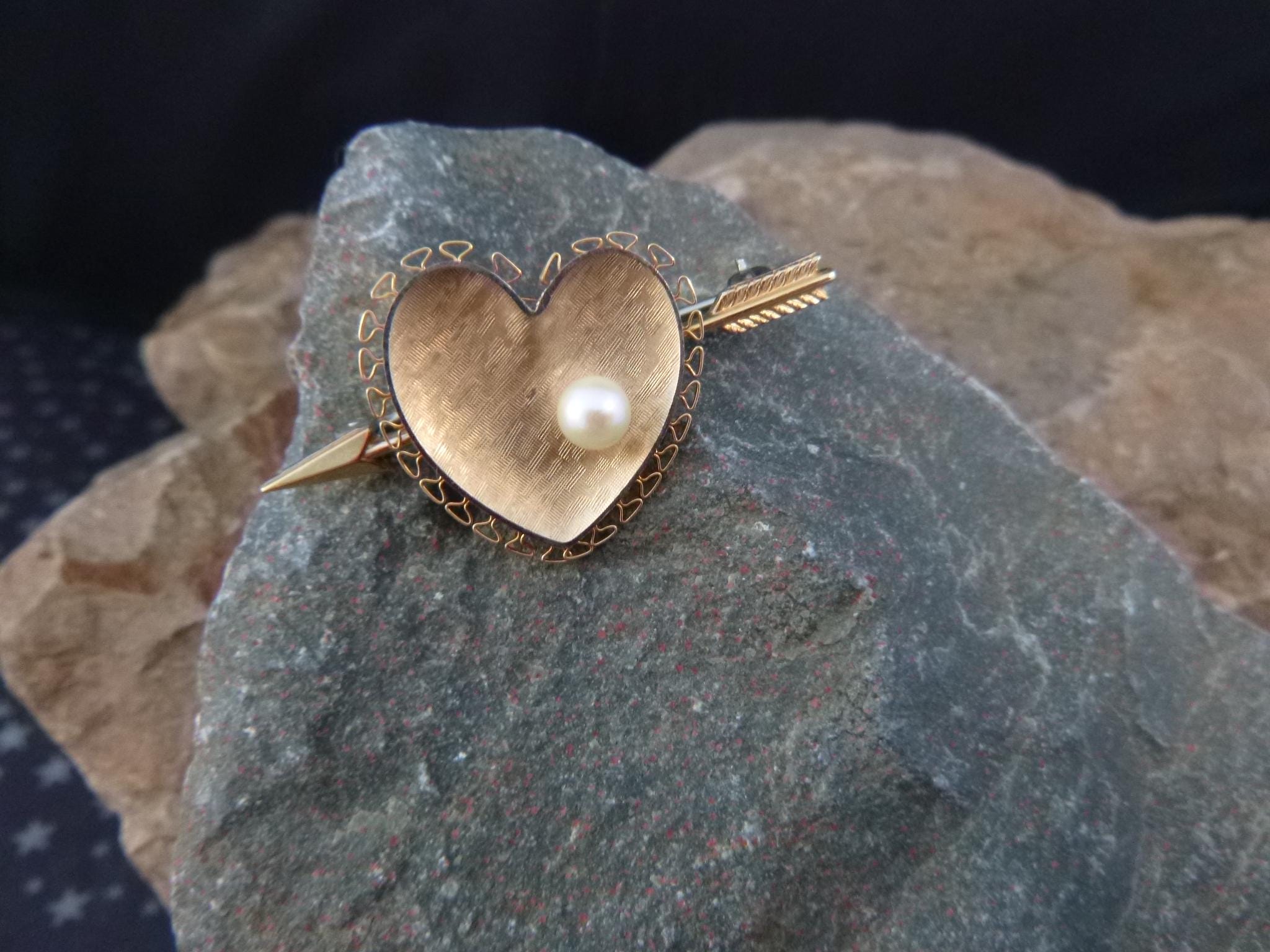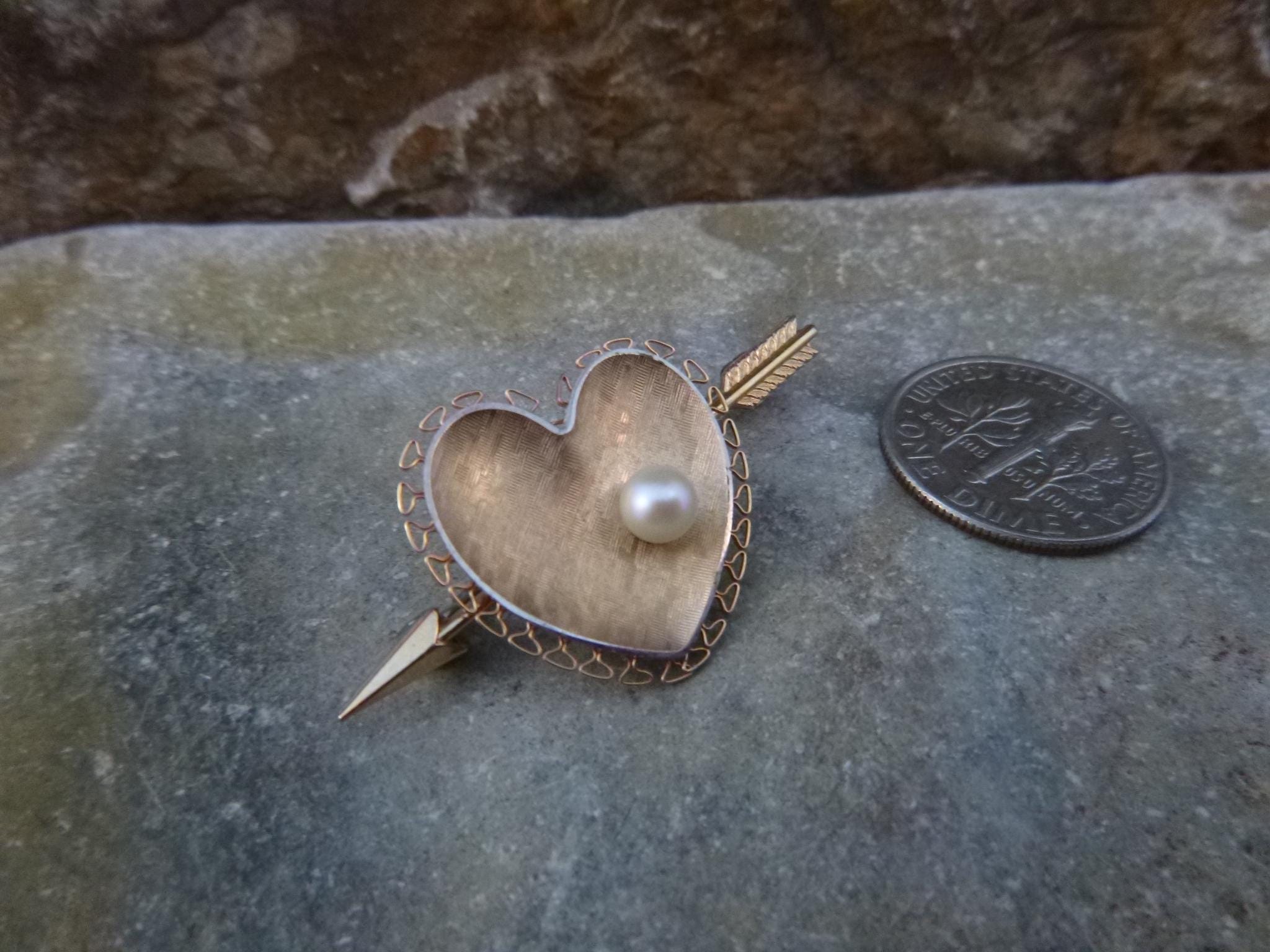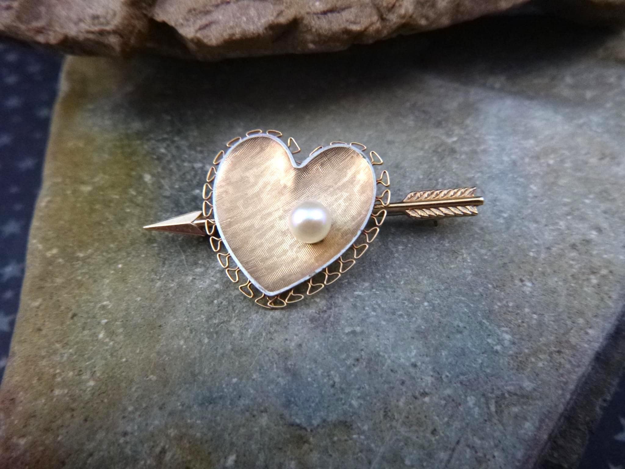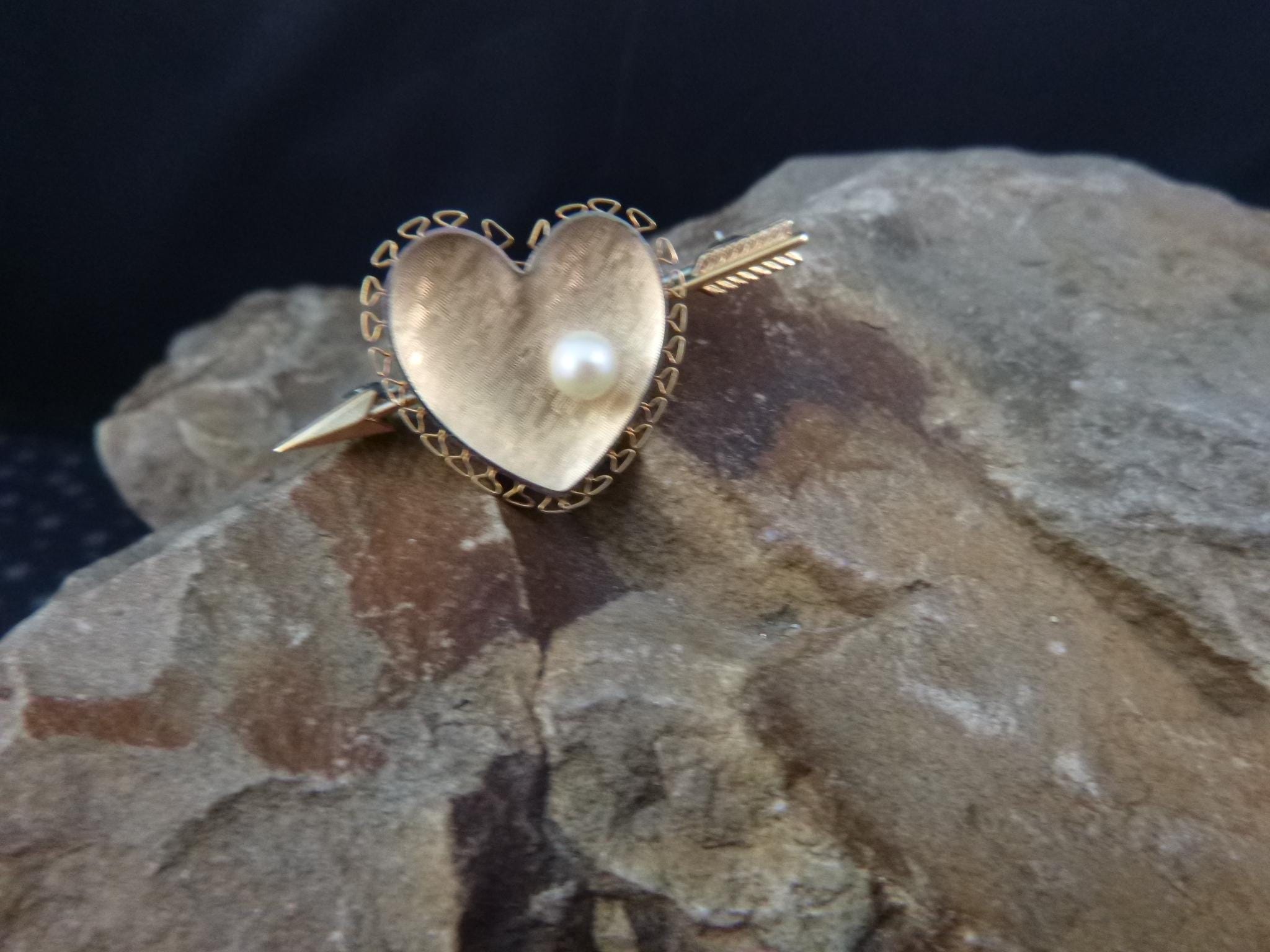 Likely from the l970s, this cultured pearl heart with an arrow is in its original presentation box with its original insert. On the back closure pin is “Krementz” in block letters which is hard to see without a magnifier.