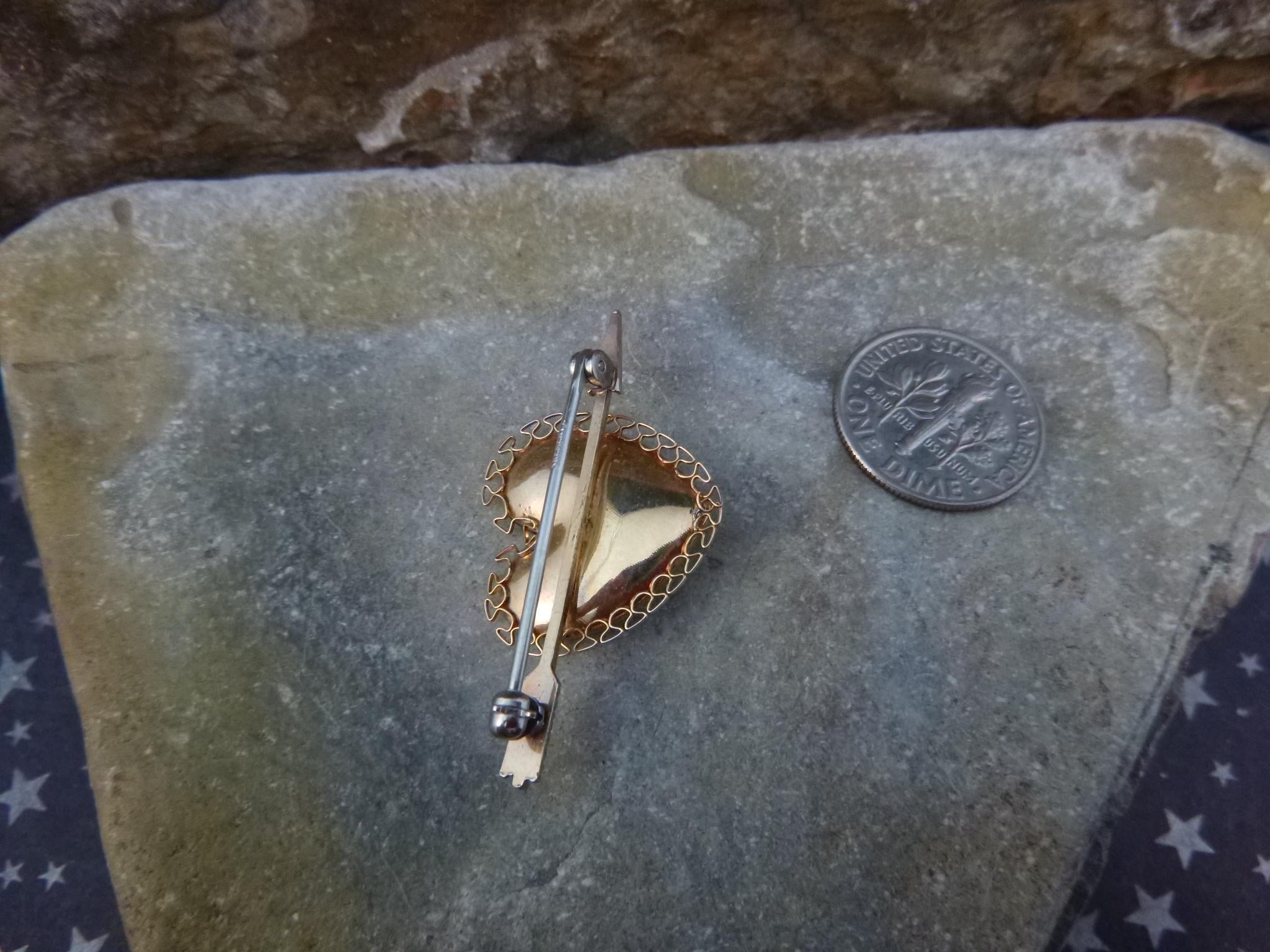 The heart brooch is small, measuring 1.5” in length and .75” in width, and its pin and clasp hold well. The pictures offer greater perspective on the quality, design, and vintage condition of this lovely heart brooch.