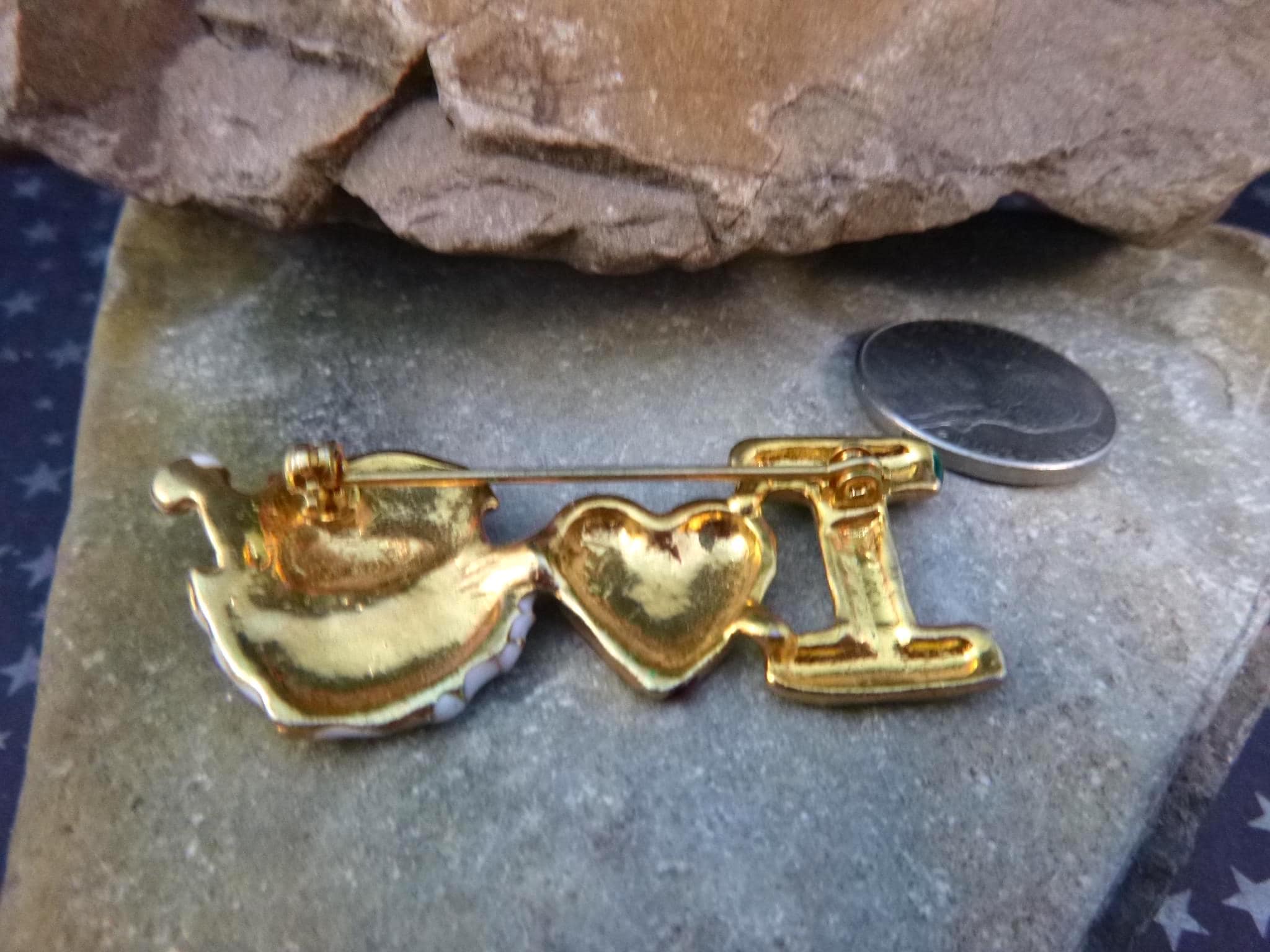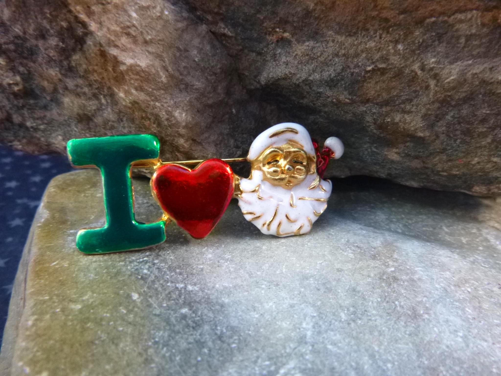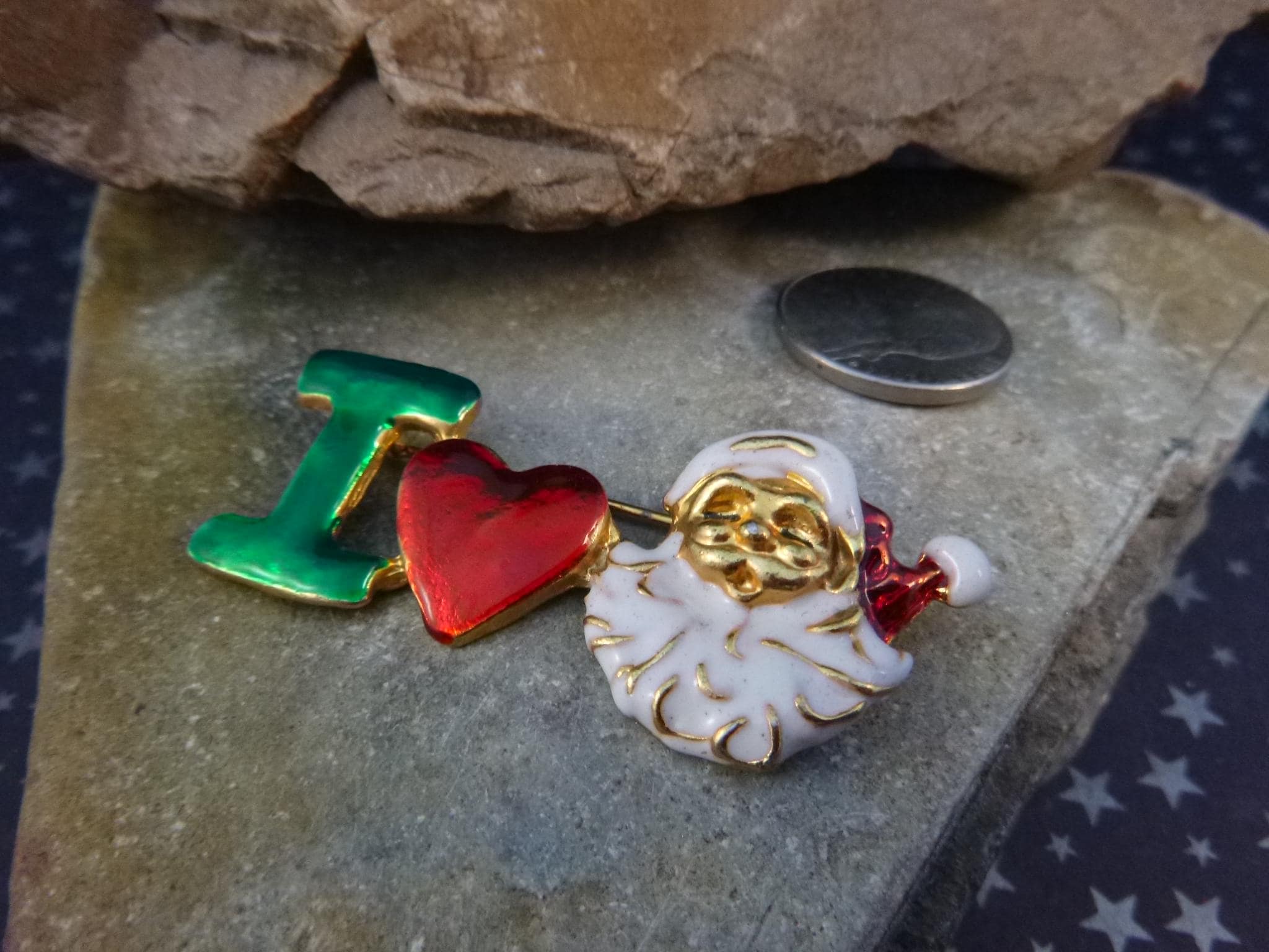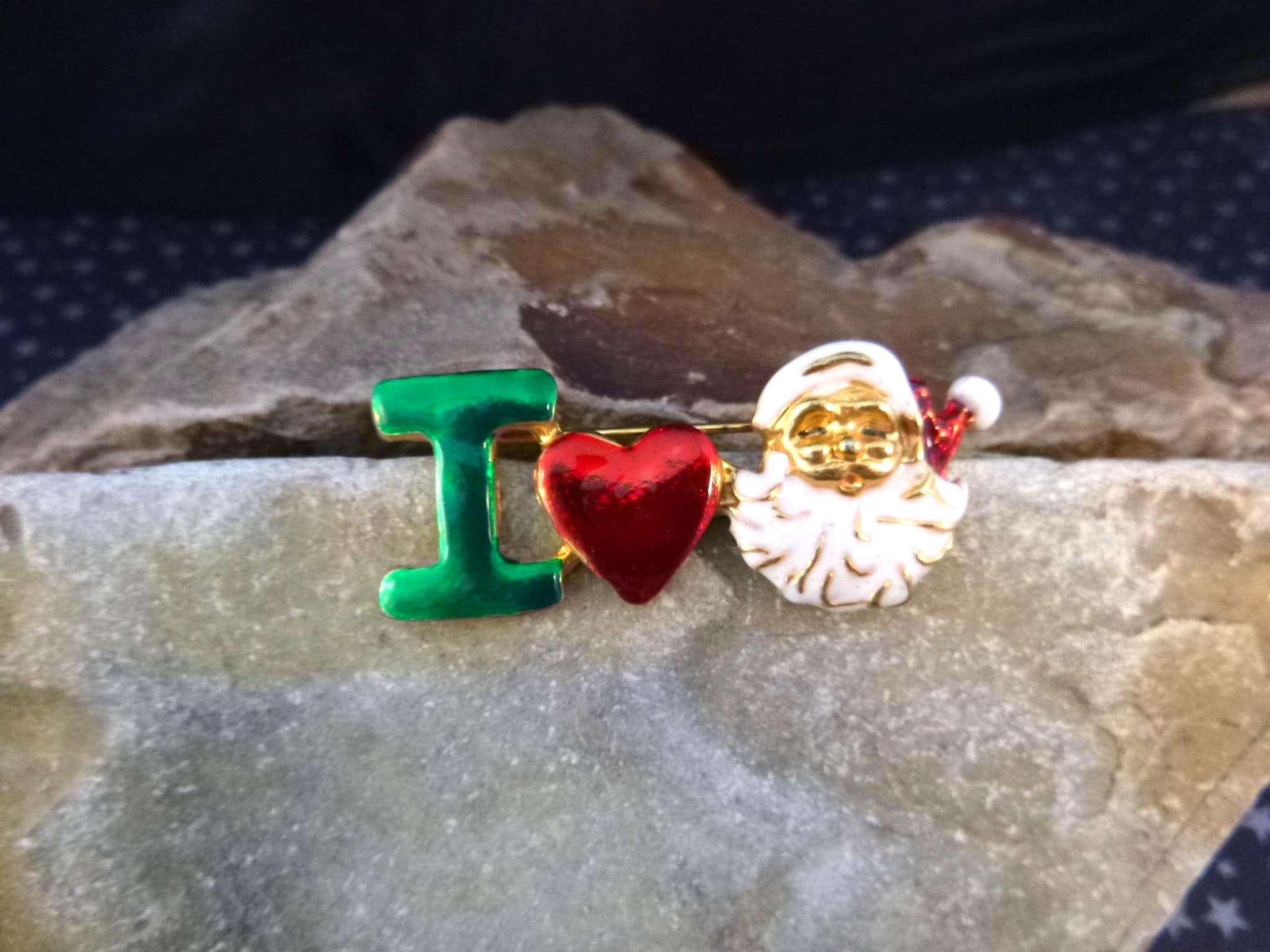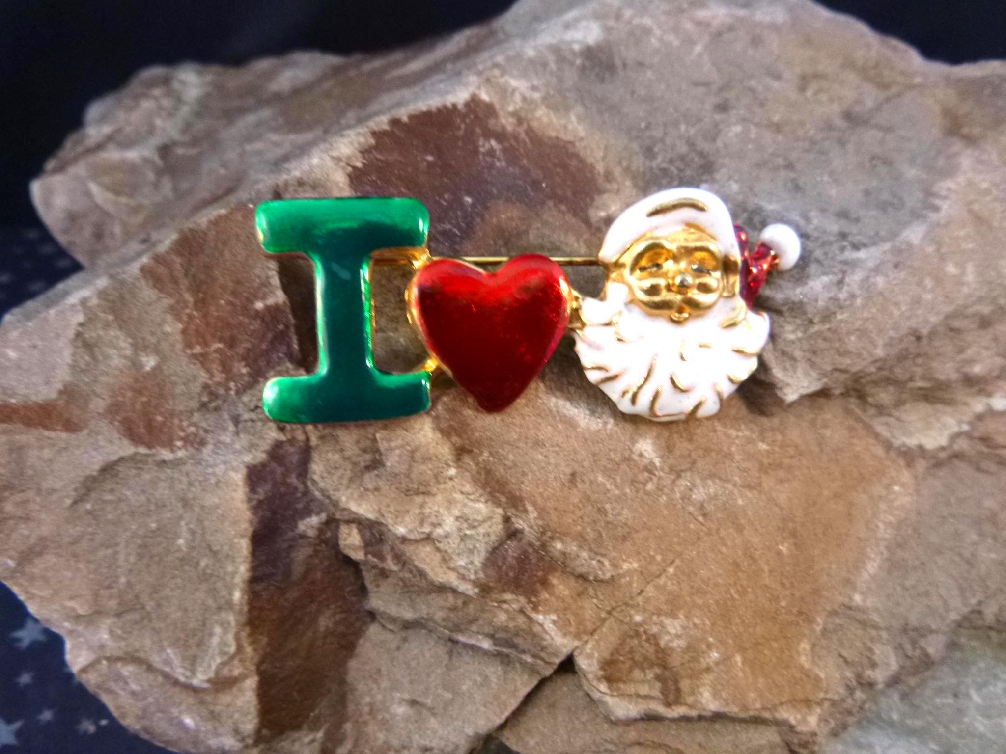 I bought this whimsical Santa Claus pin at a community yard from a woman who collected Christmas pins for decades. I immediately liked the pin’s message “I Love Santa.” If you love Christmas or Santa Claus brooches this may be the pin for you.