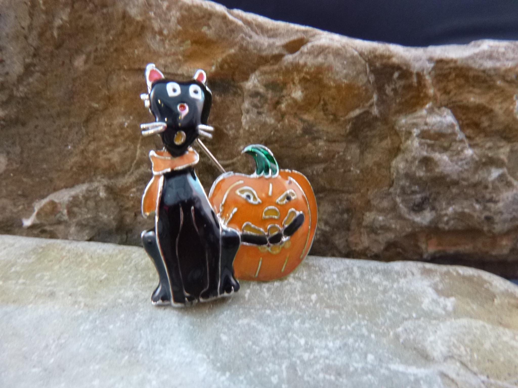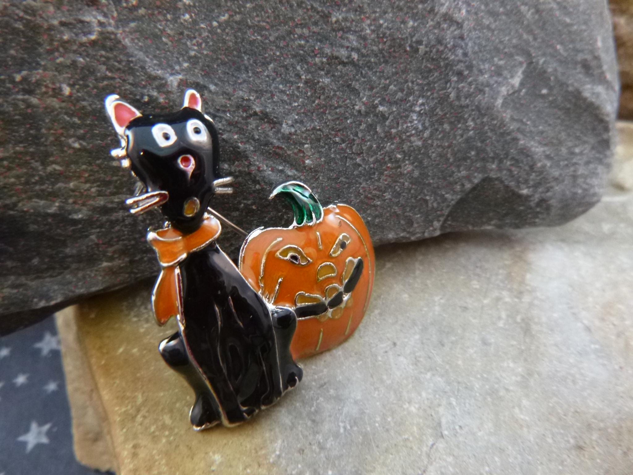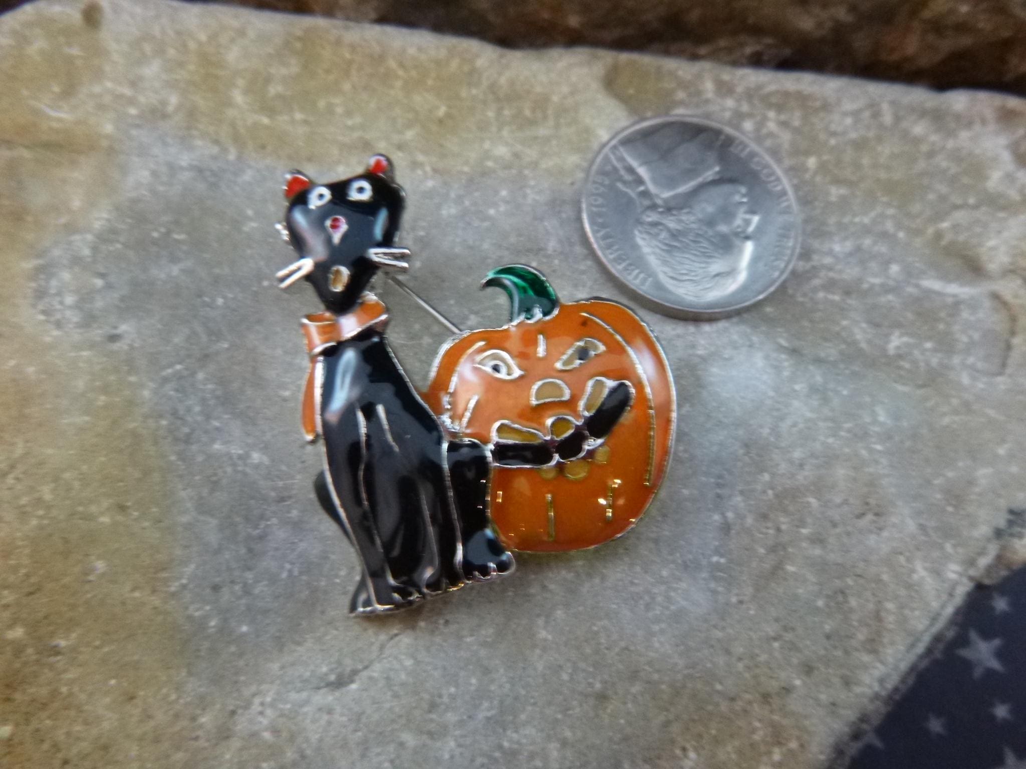 Made of a silver tone metal the cat and pumpkin have black, orange, and green enamel highlights, adding a touch of Halloween fun to any outfit.