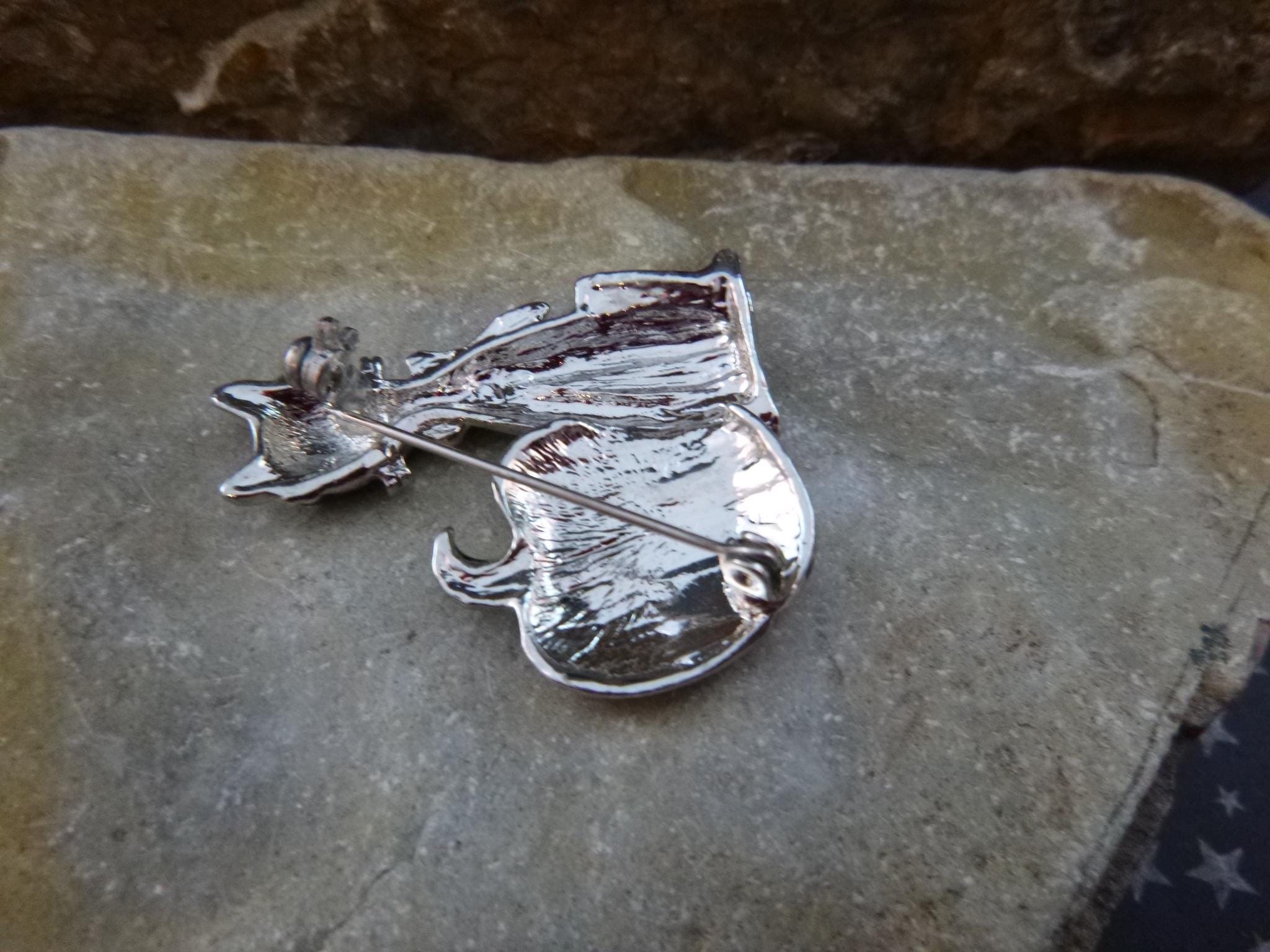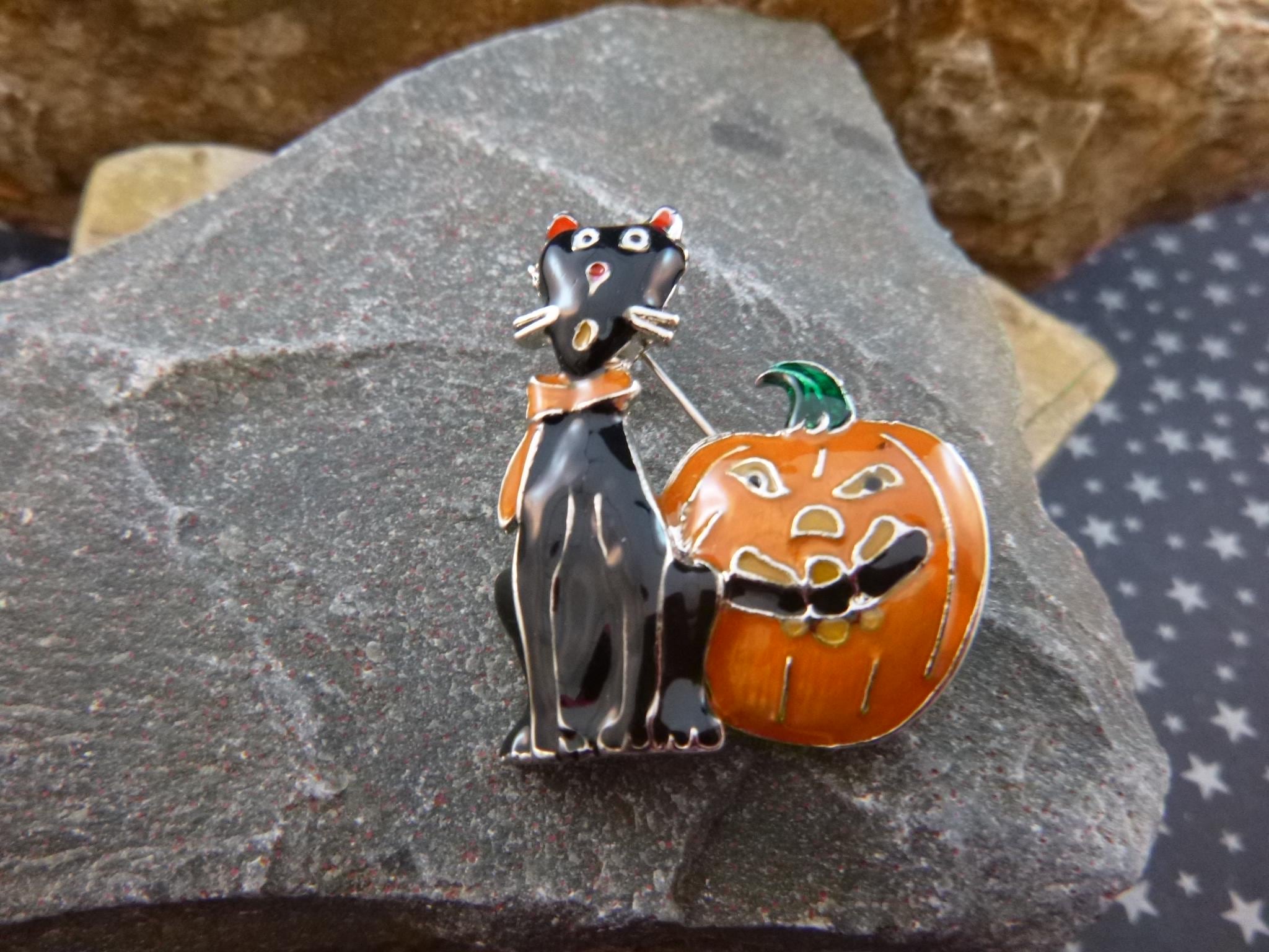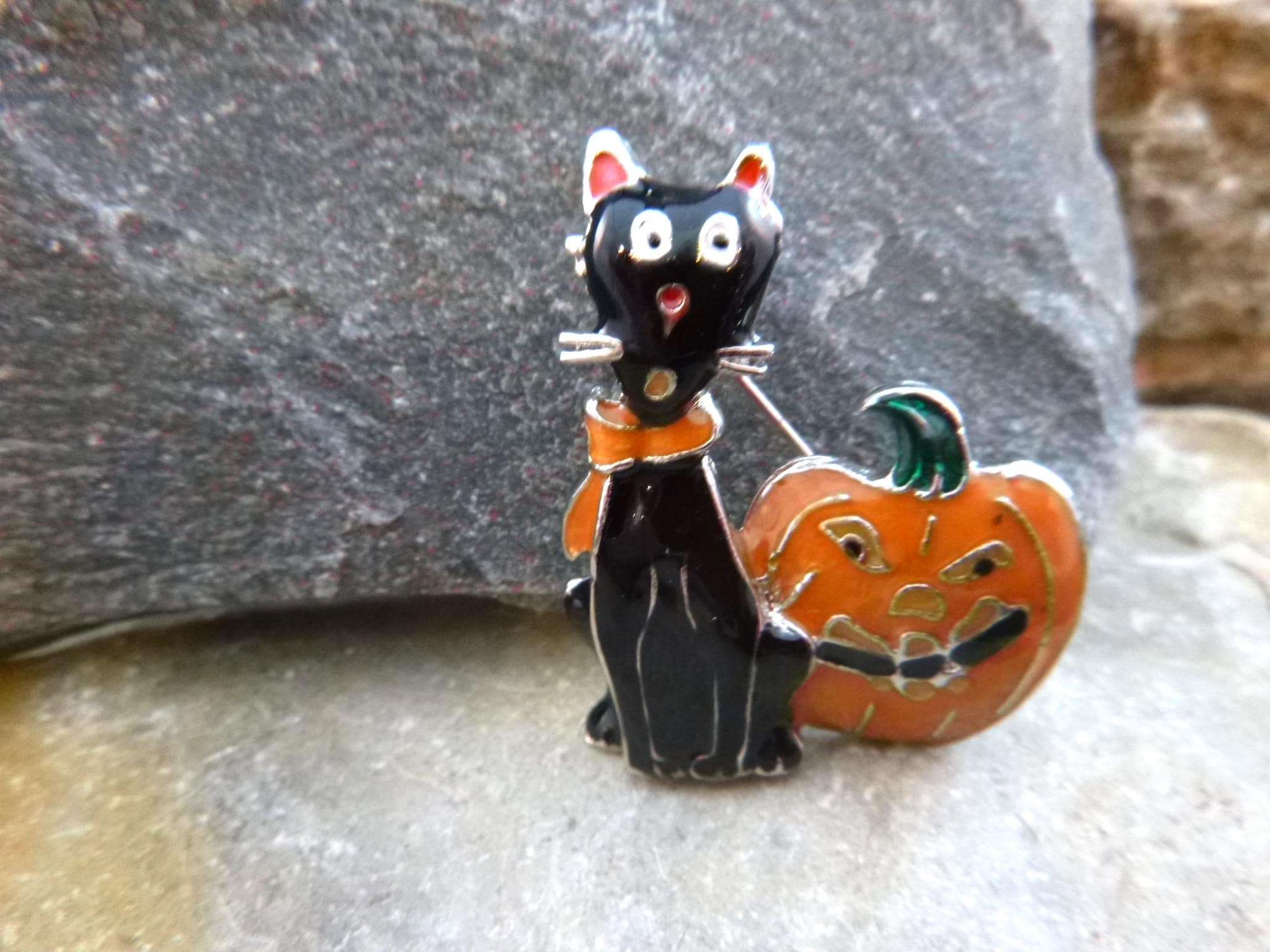 Made of a silver tone metal the cat and pumpkin have black, orange, and green enamel highlights, adding a touch of Halloween fun to any outfit.