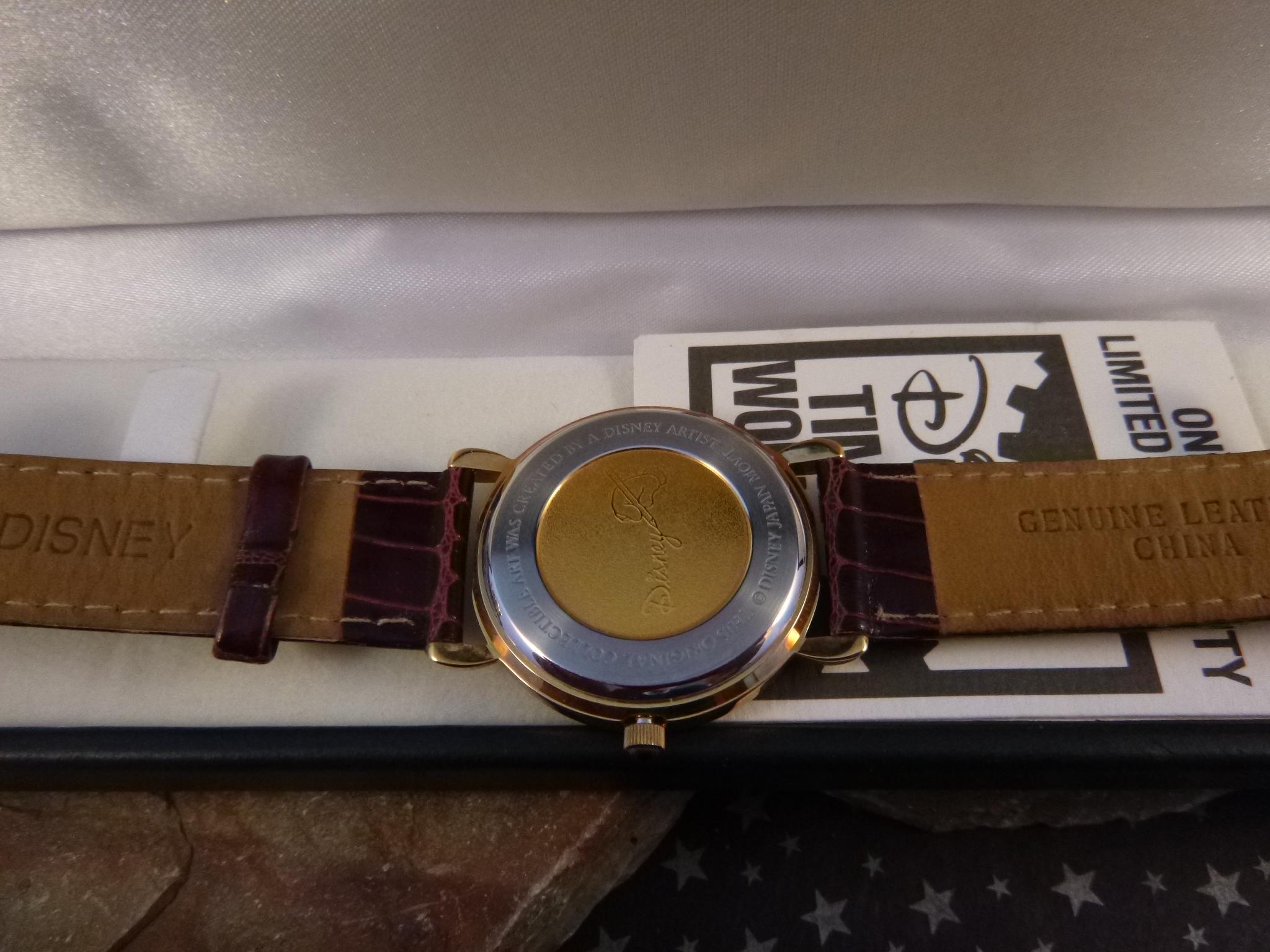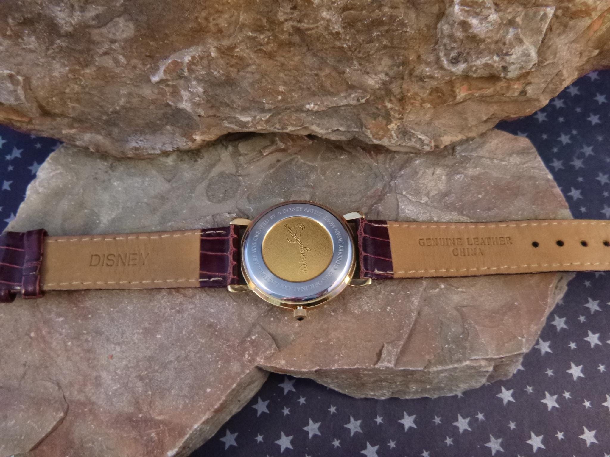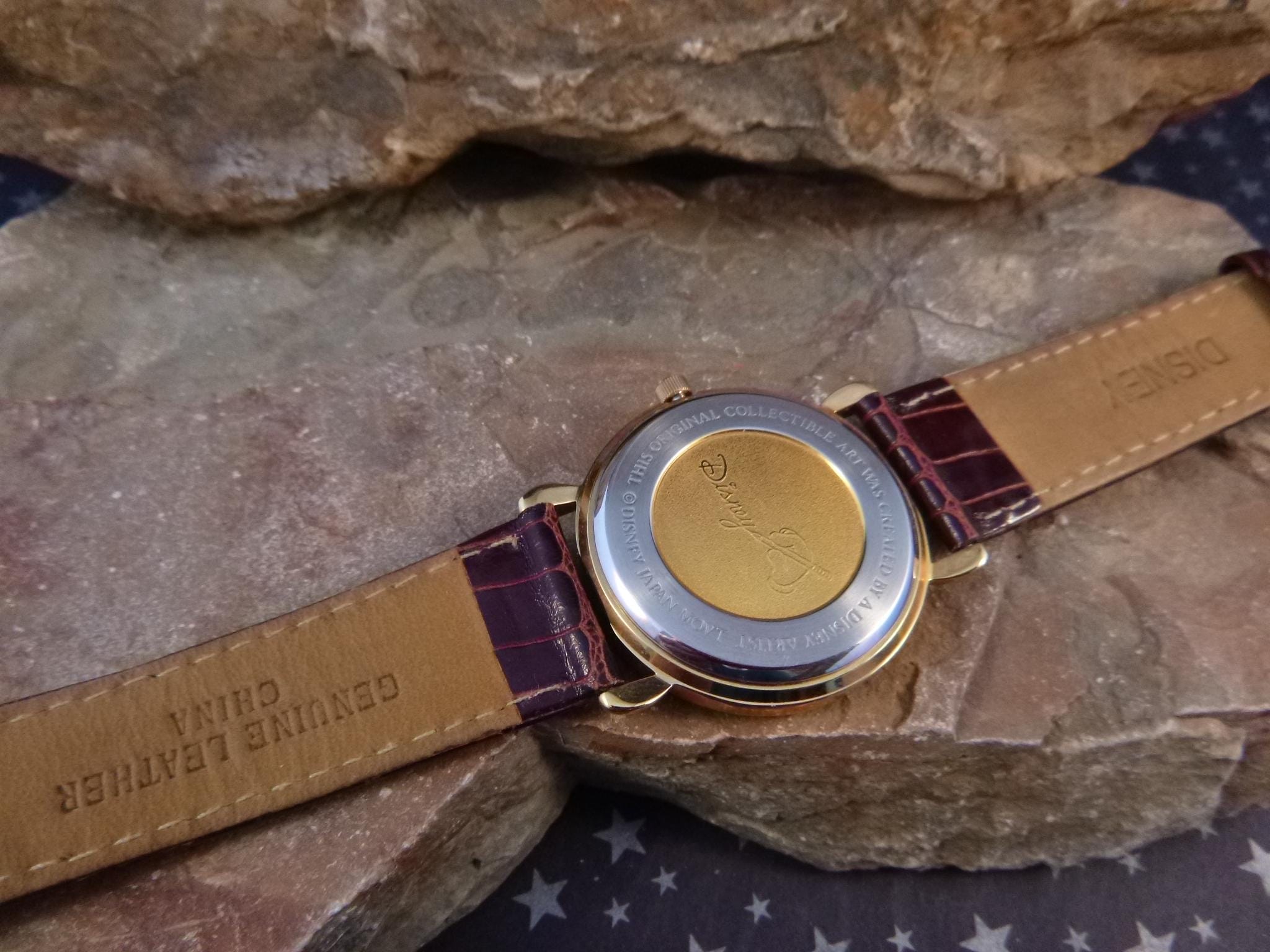 The watch is in excellent vintage condition. It has never been worn and has only been out of its case to be photographed and to receive a new battery. It has the one-year limited warranty card (expired, of course), and the original presentation box. The brown leather band is marked “Disney” and “Genuine Leather China.” It has a gold-tone metal Mickey on the band end.
