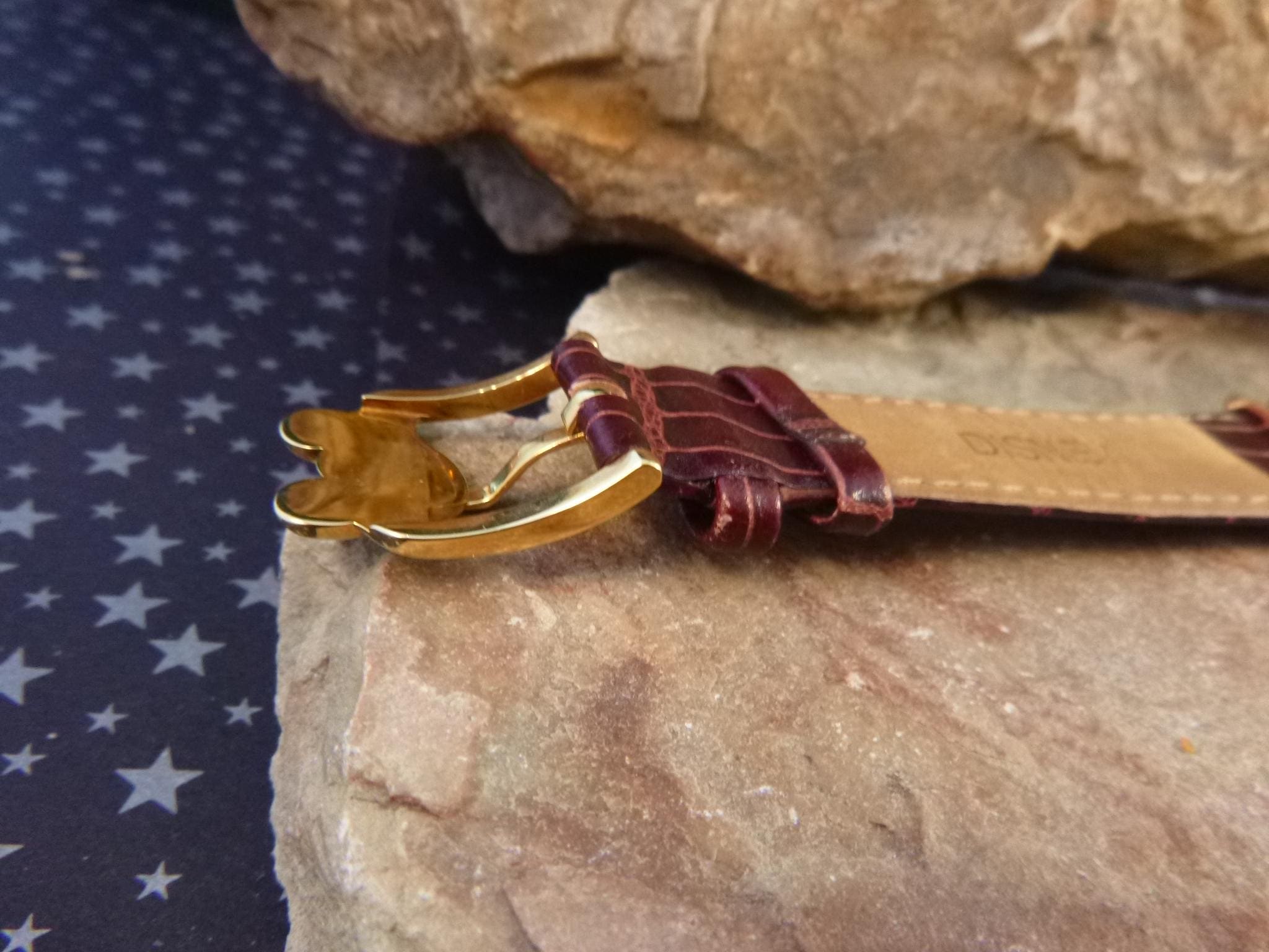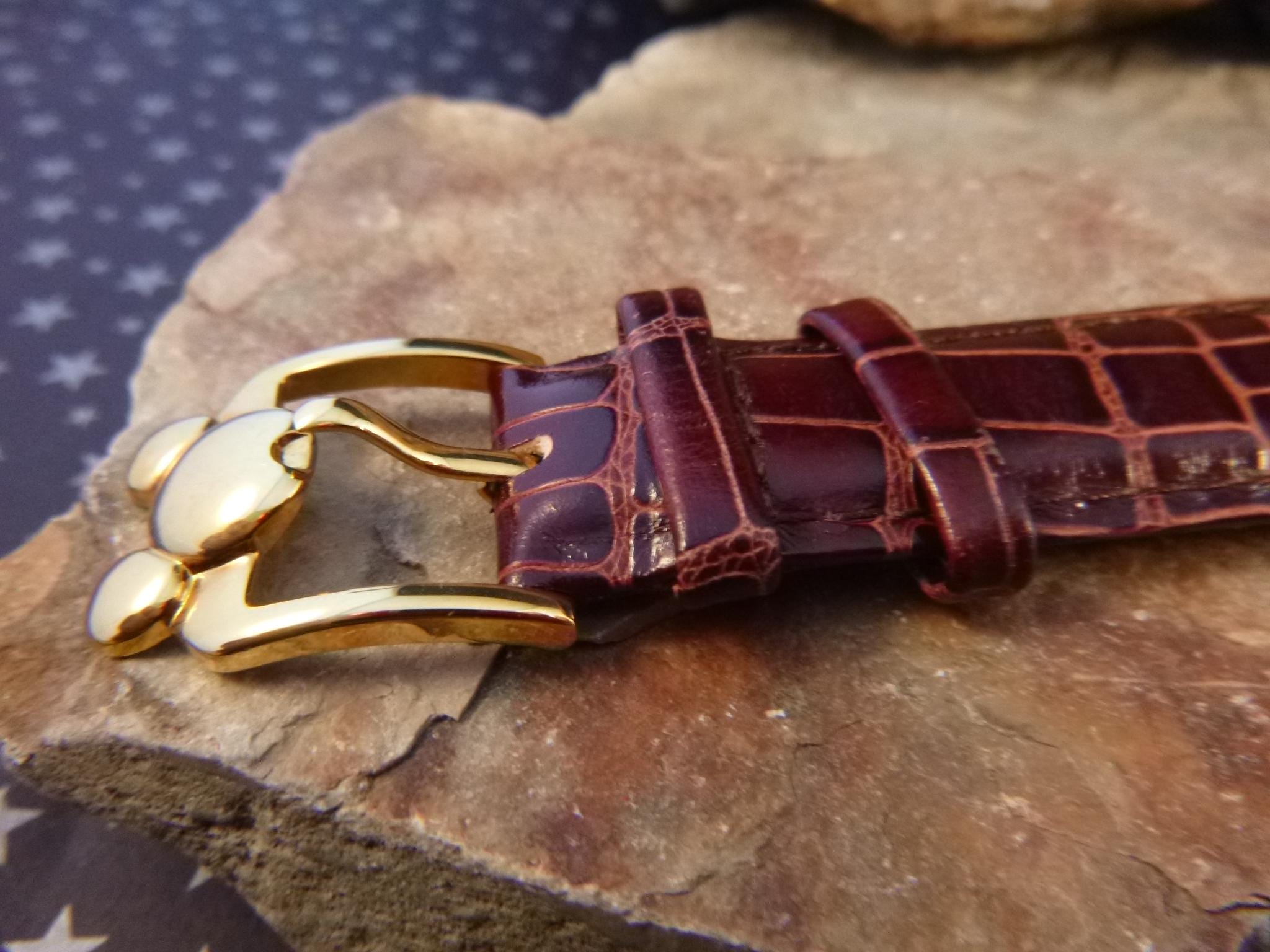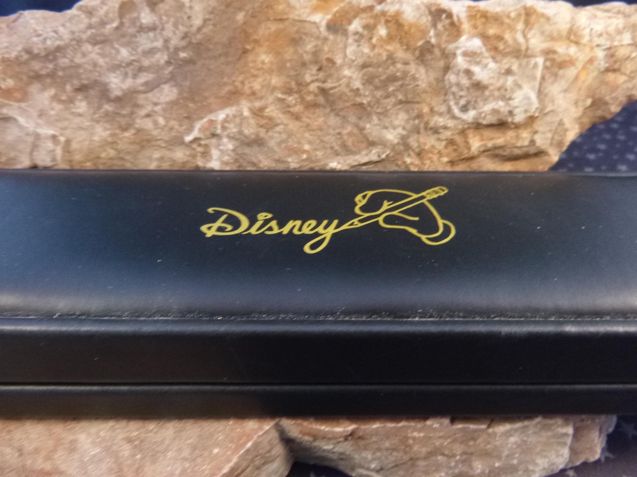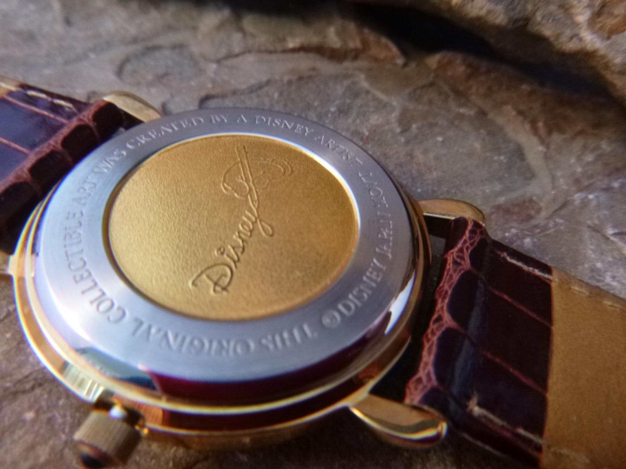 The watch is in excellent vintage condition. It has never been worn and has only been out of its case to be photographed and to receive a new battery. It has the one-year limited warranty card (expired, of course), and the original presentation box. The brown leather band is marked “Disney” and “Genuine Leather China.” It has a gold-tone metal Mickey on the band end.
