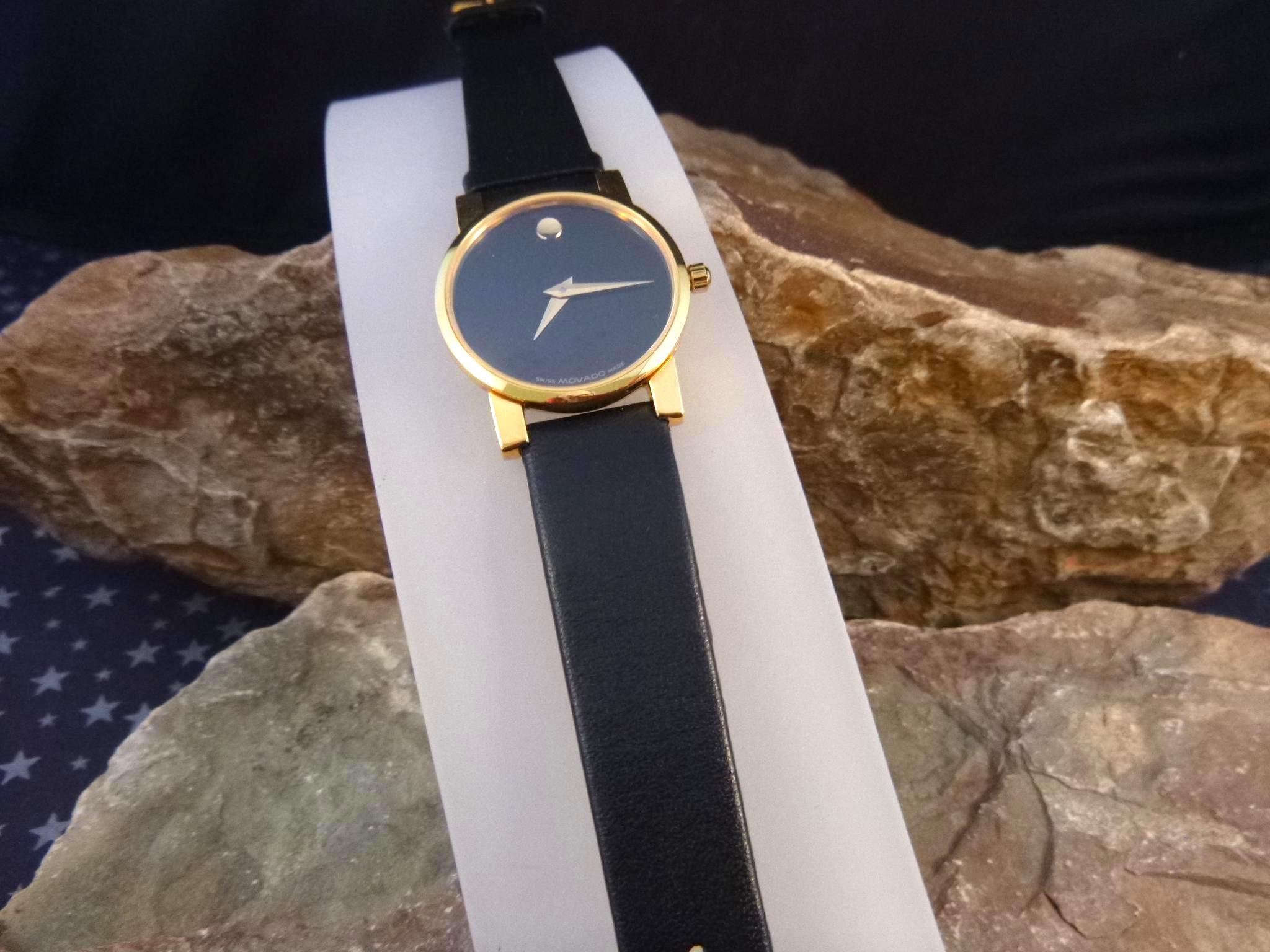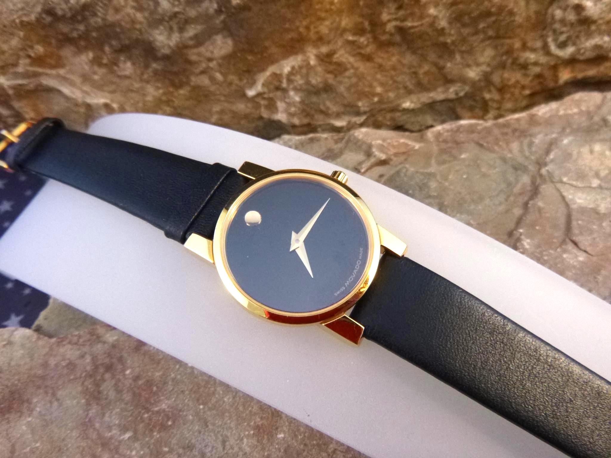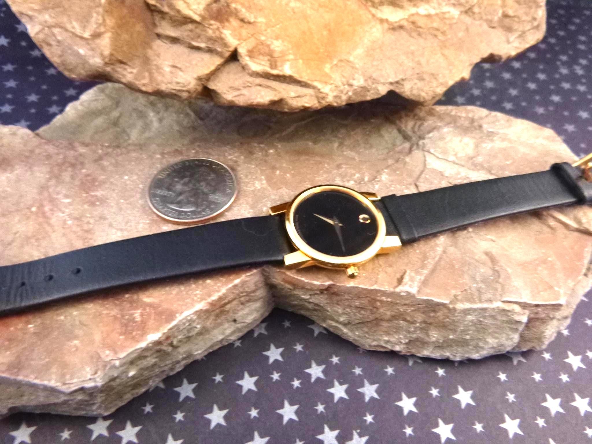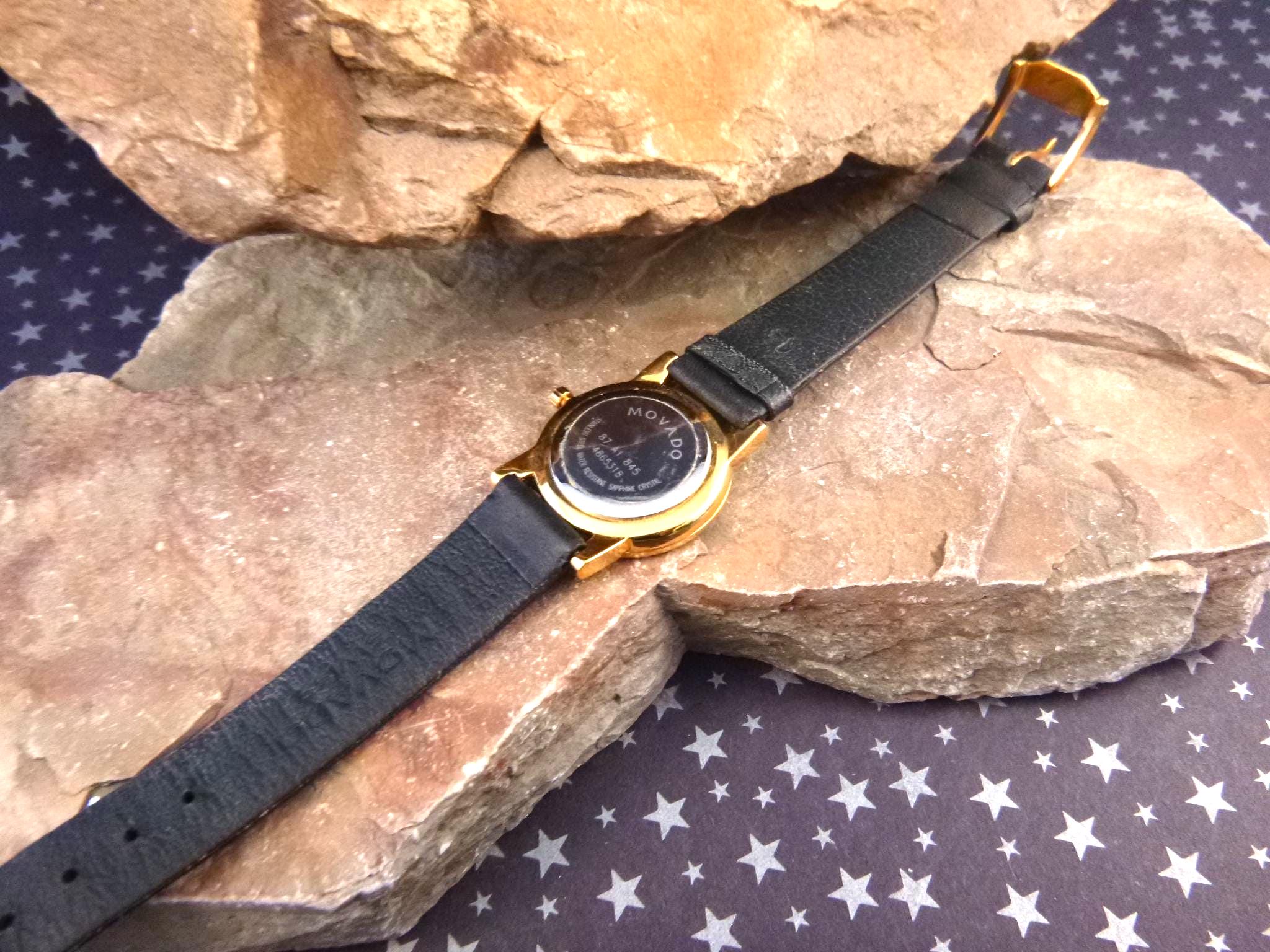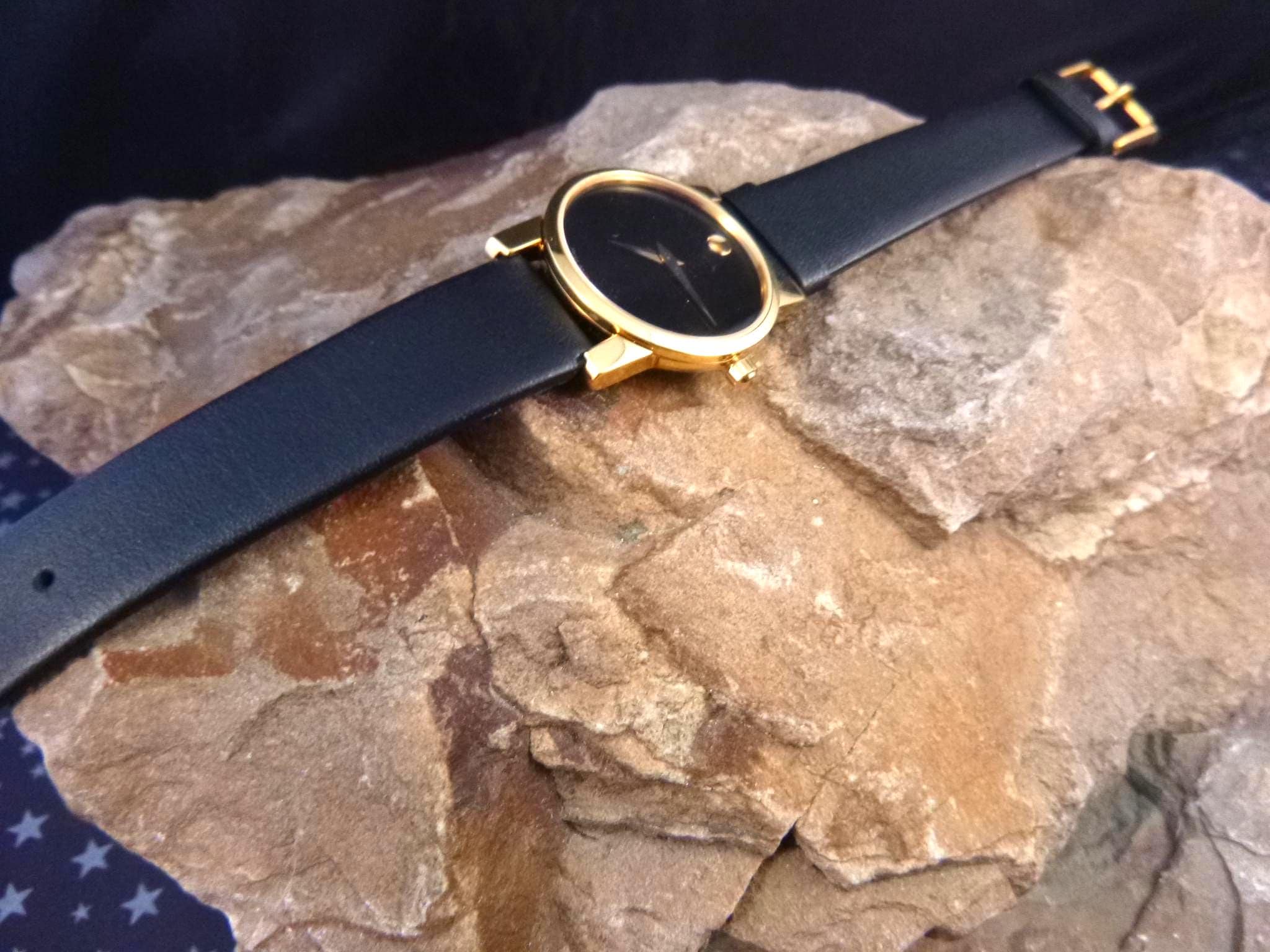 This Swiss made watch, features a black dial with yellow gold tone hands and the classic dot at 12 o’clock, part of the Movado modern design, featured in art institutions around the world according to the Movado website. The black leather band is marked “Movado Swiss” on the back. The entire watch with band measures 8” with the watch face 1” in diameter. It has a new battery which is activated by pushing in the watch stem.