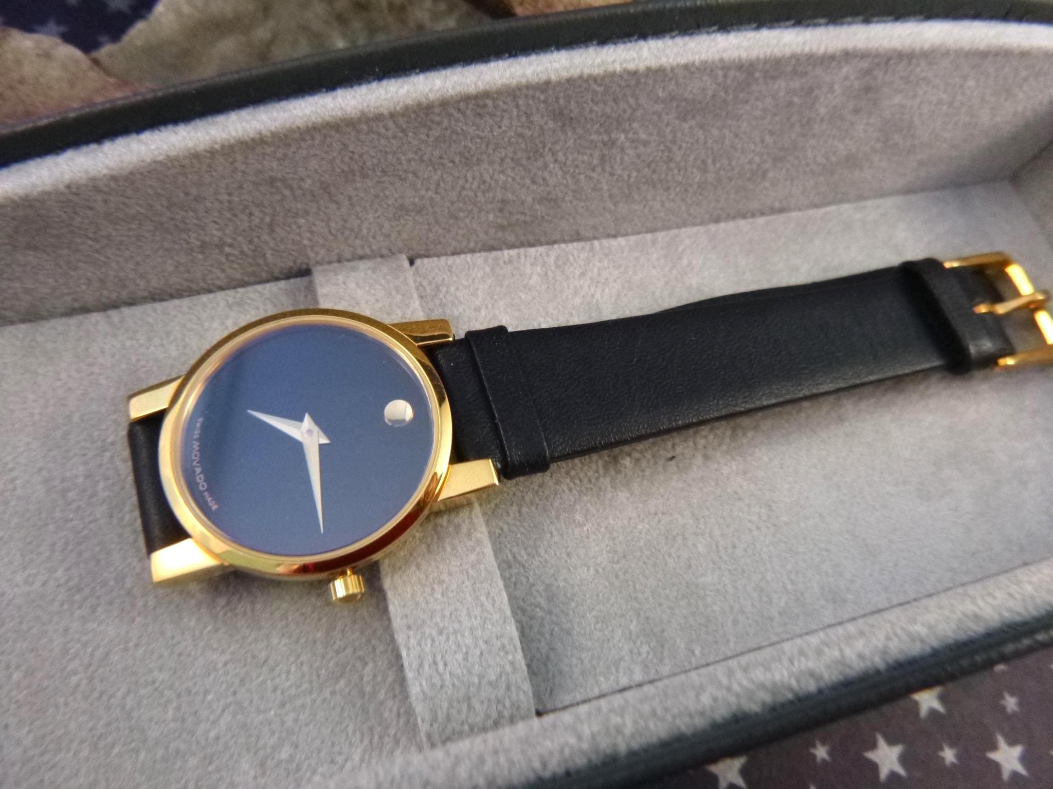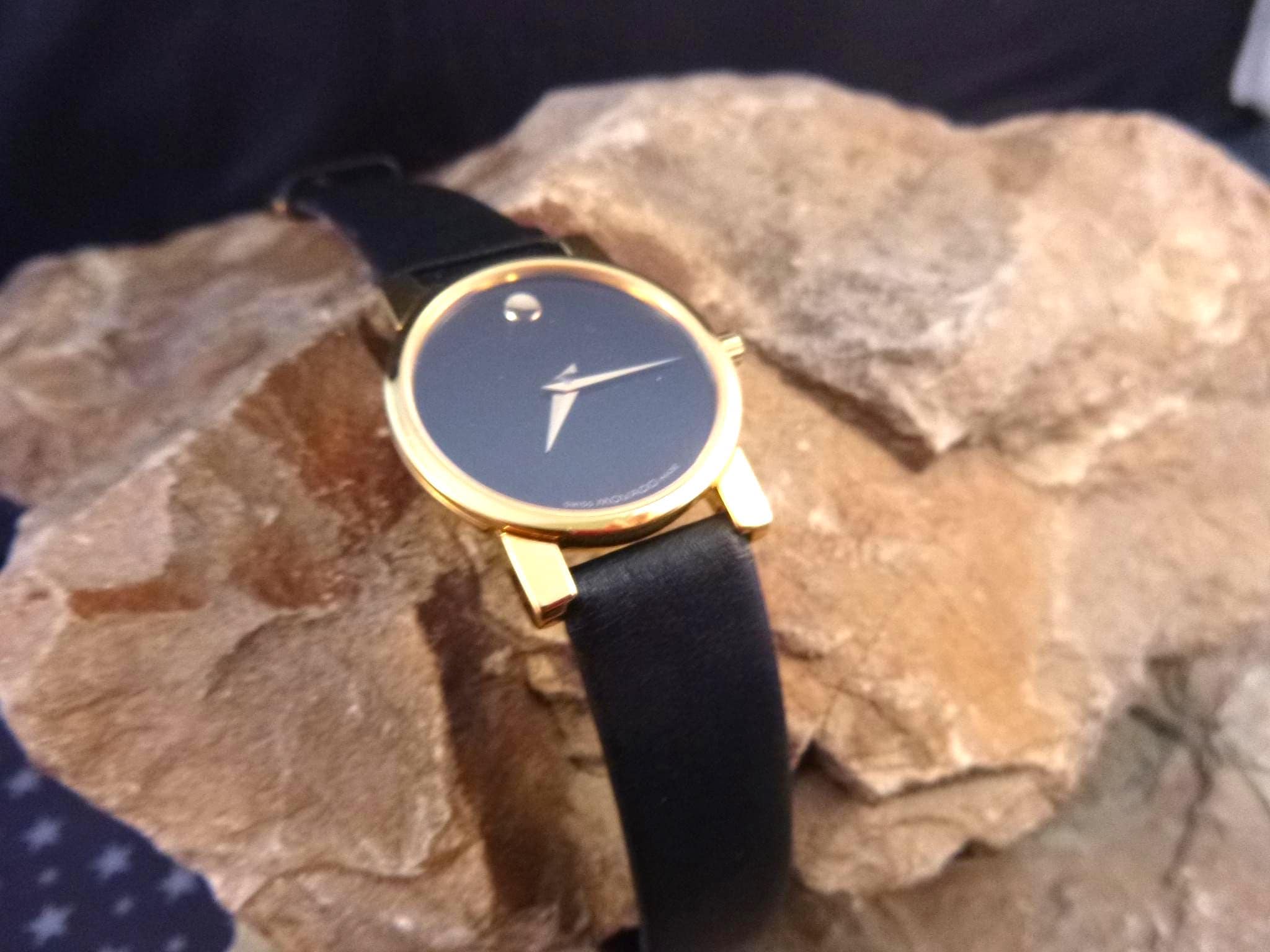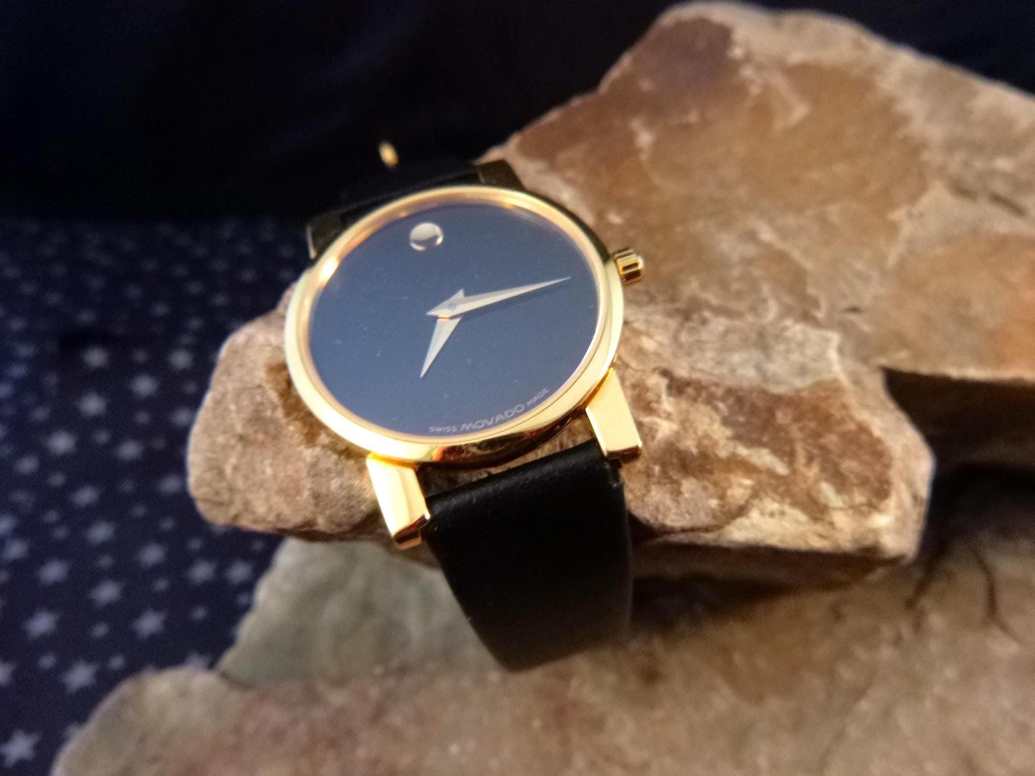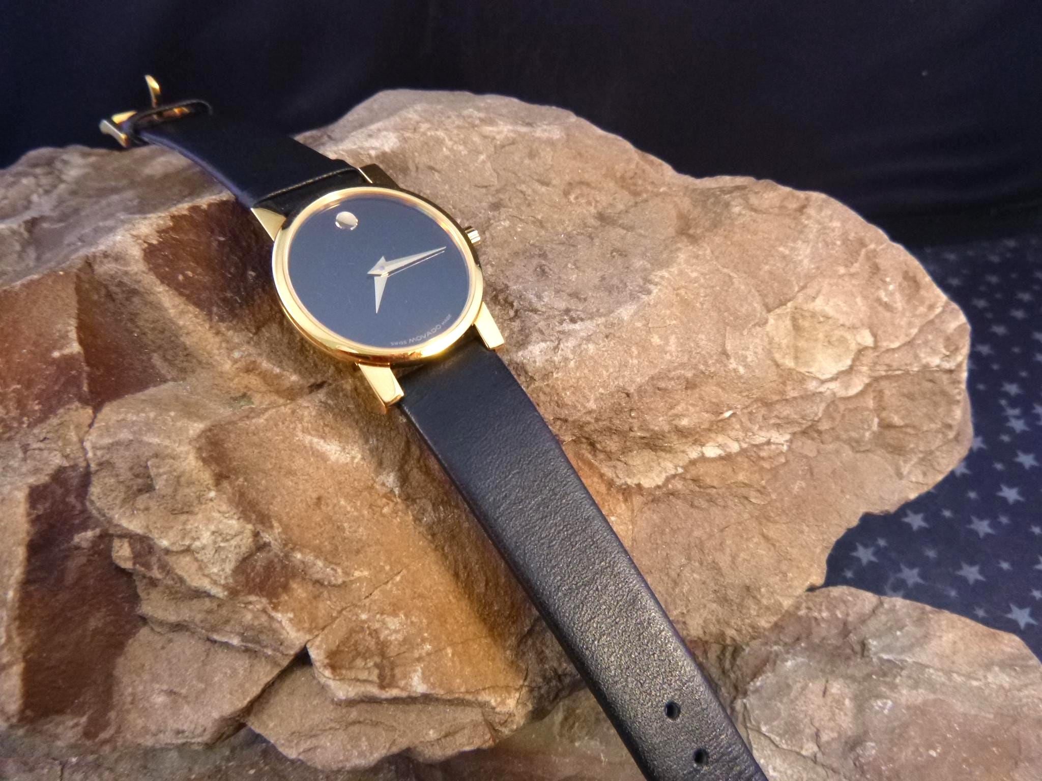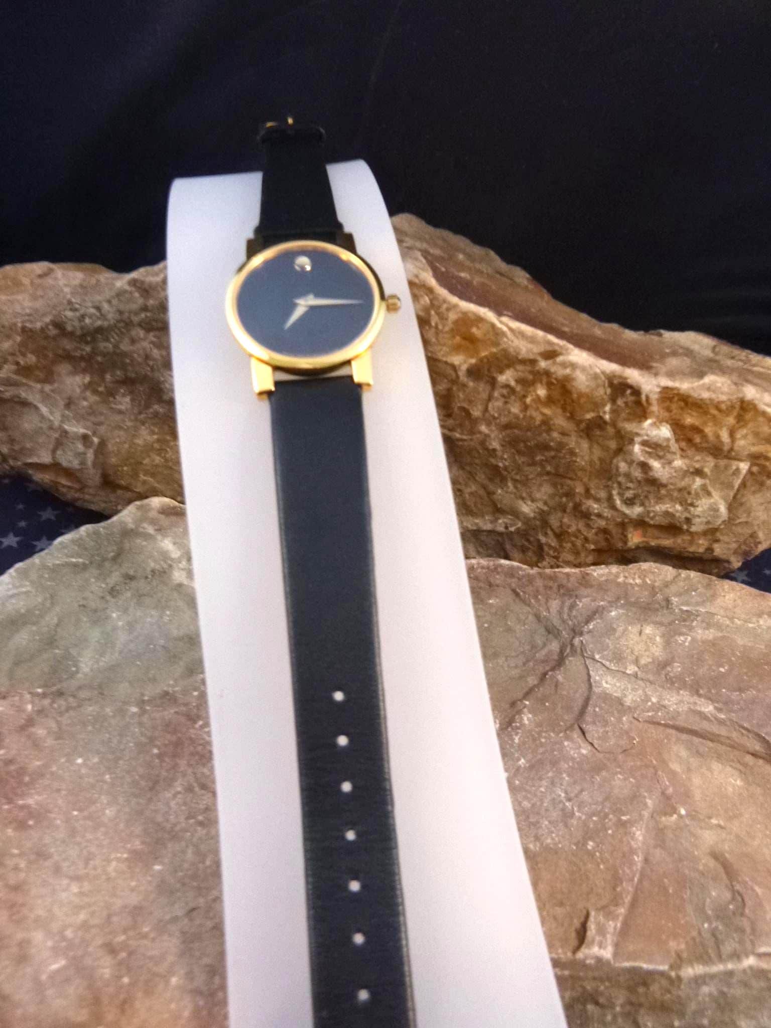 This Swiss made watch, features a black dial with yellow gold tone hands and the classic dot at 12 o’clock, part of the Movado modern design, featured in art institutions around the world according to the Movado website. The black leather band is marked “Movado Swiss” on the back. The entire watch with band measures 8” with the watch face 1” in diameter. It has a new battery which is activated by pushing in the watch stem.