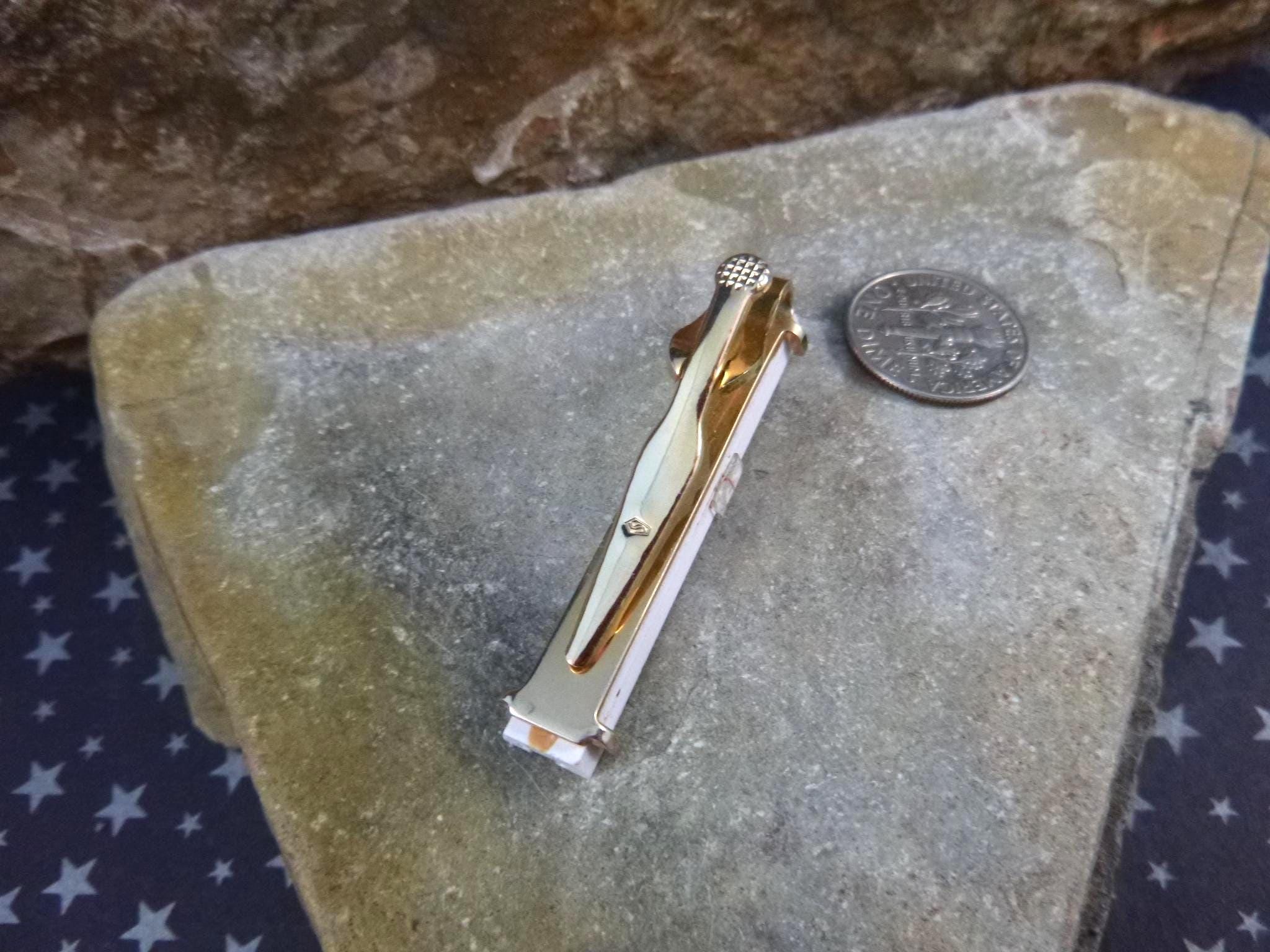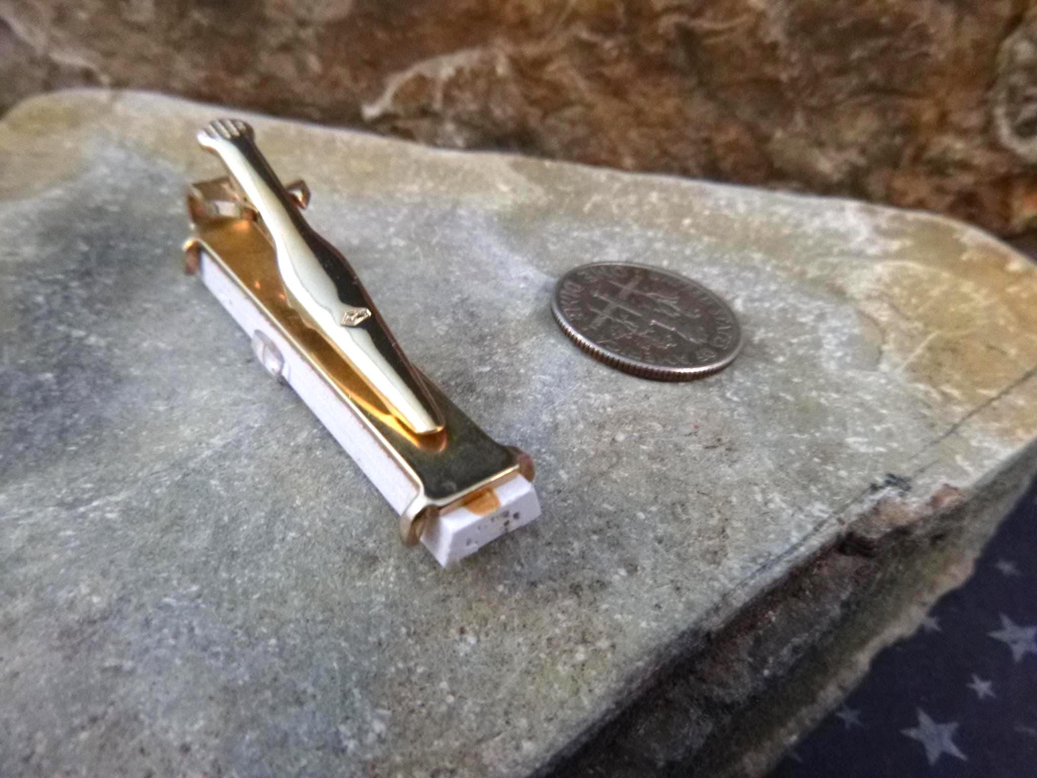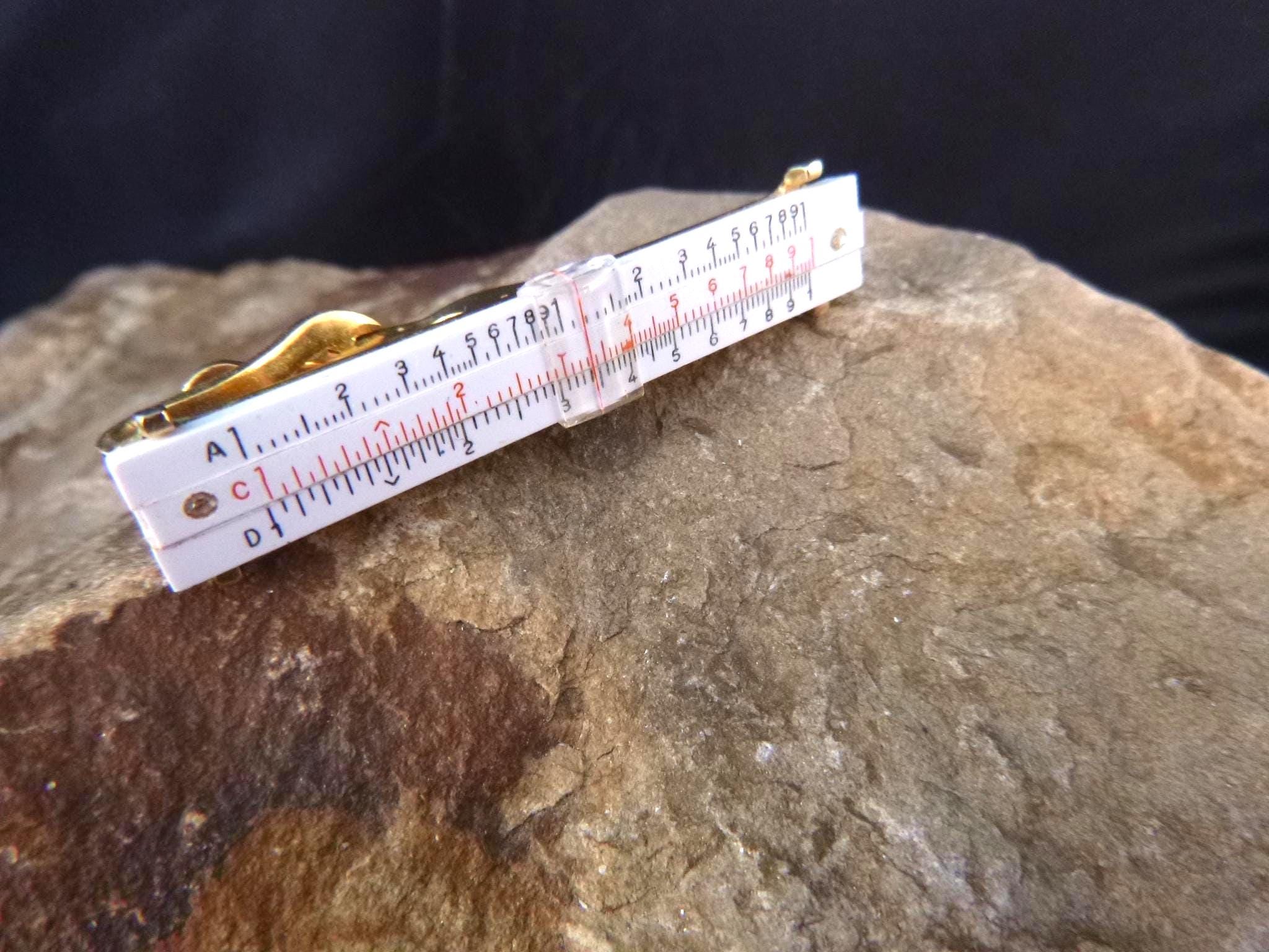 This 20th-century slide rule tie bar clasp is perfect for any 21st-century engineer, software developer, tech enthusiast, or mid-century vintage lover. This miniature slide rule works and has a sliding middle bar which has two small rhinestones, one at each edge. It is quality crafted in gold tone metal with a well detailed plastic ruler that sits on top and is attached to the metal.