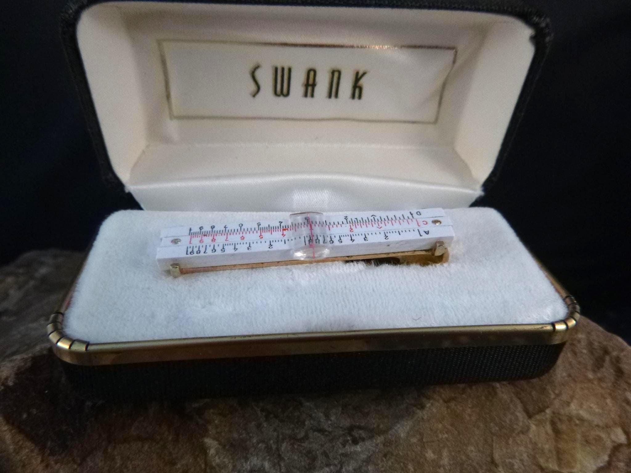 This slide rule tie bar is in its original Swank box. In addition to the box marked “Swank” in block letters, the marker’s mark, an “S” inside a design block is on the black of the clip. In l936 what was the Attleboro Manufacturing Company became Swank Products, Inc. They continued to offer men’s jewelry under the “Swank” name which began as a men’s jewelry brand in the 1920s.