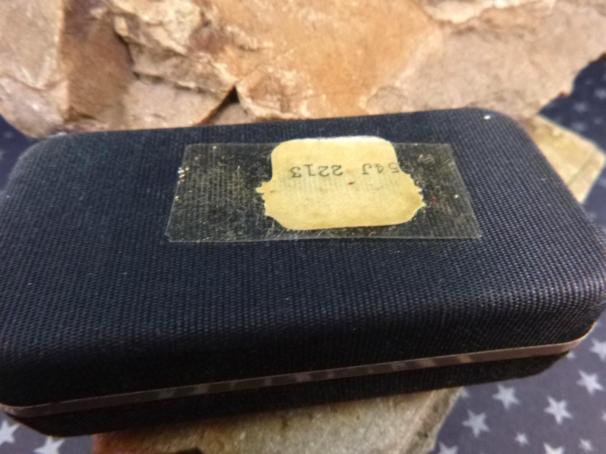 Measuring 1.75” in length and 3/8” wide, this tie bar clasp is in very good vintage for its 50 plus years of existence with light scratches here and there. The clasp apparatus works fine. The box is in good vintage condition, meaning it shows average wear for its age including a sicker on the bottom and wear on the inside insert (see pictures) where there is a cut opening below the clasp.