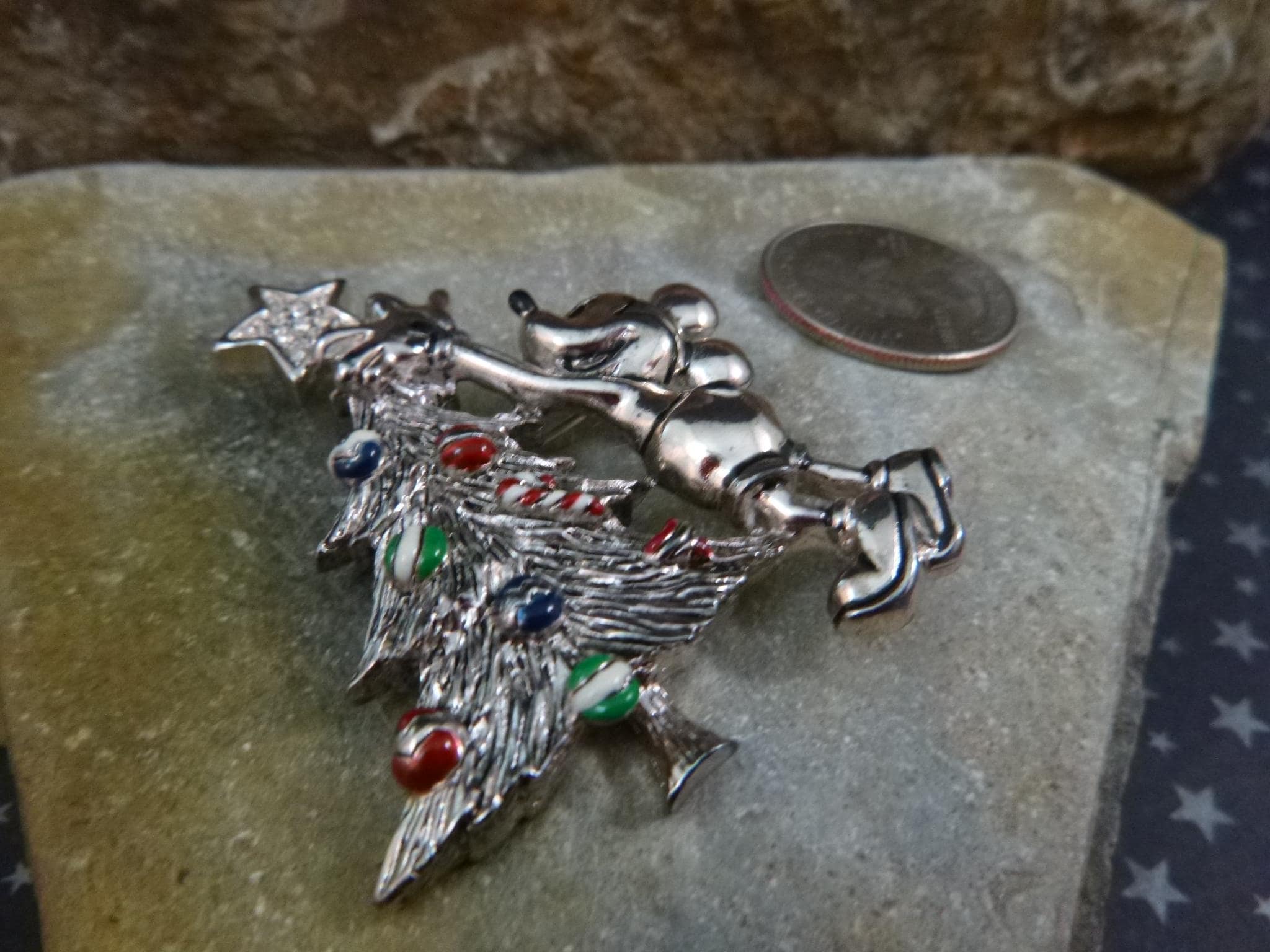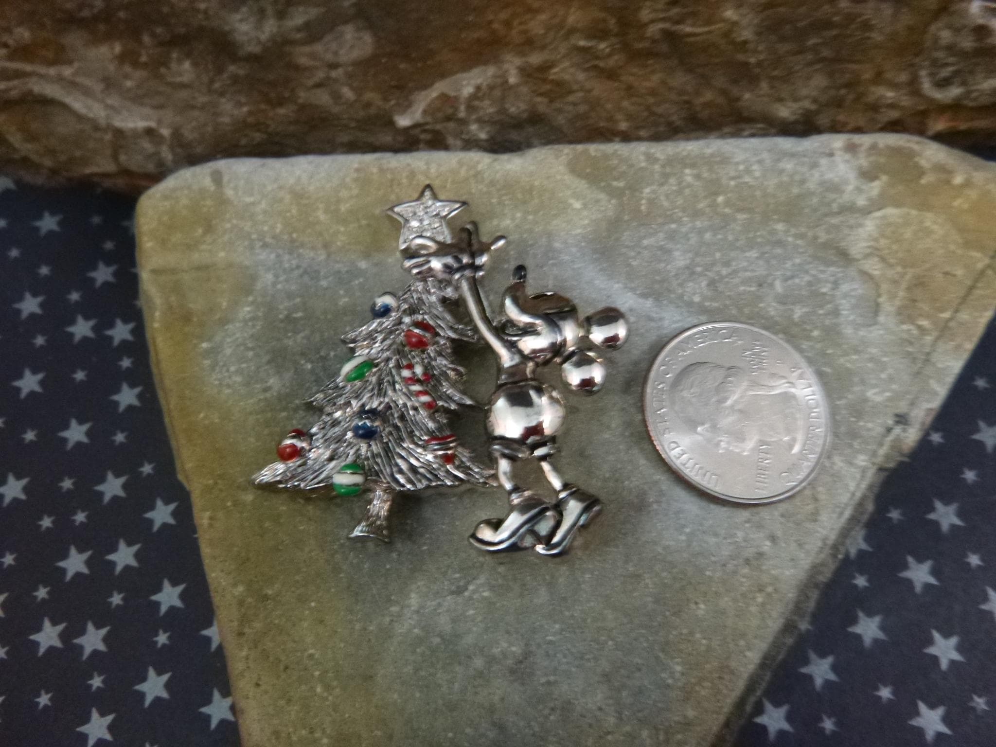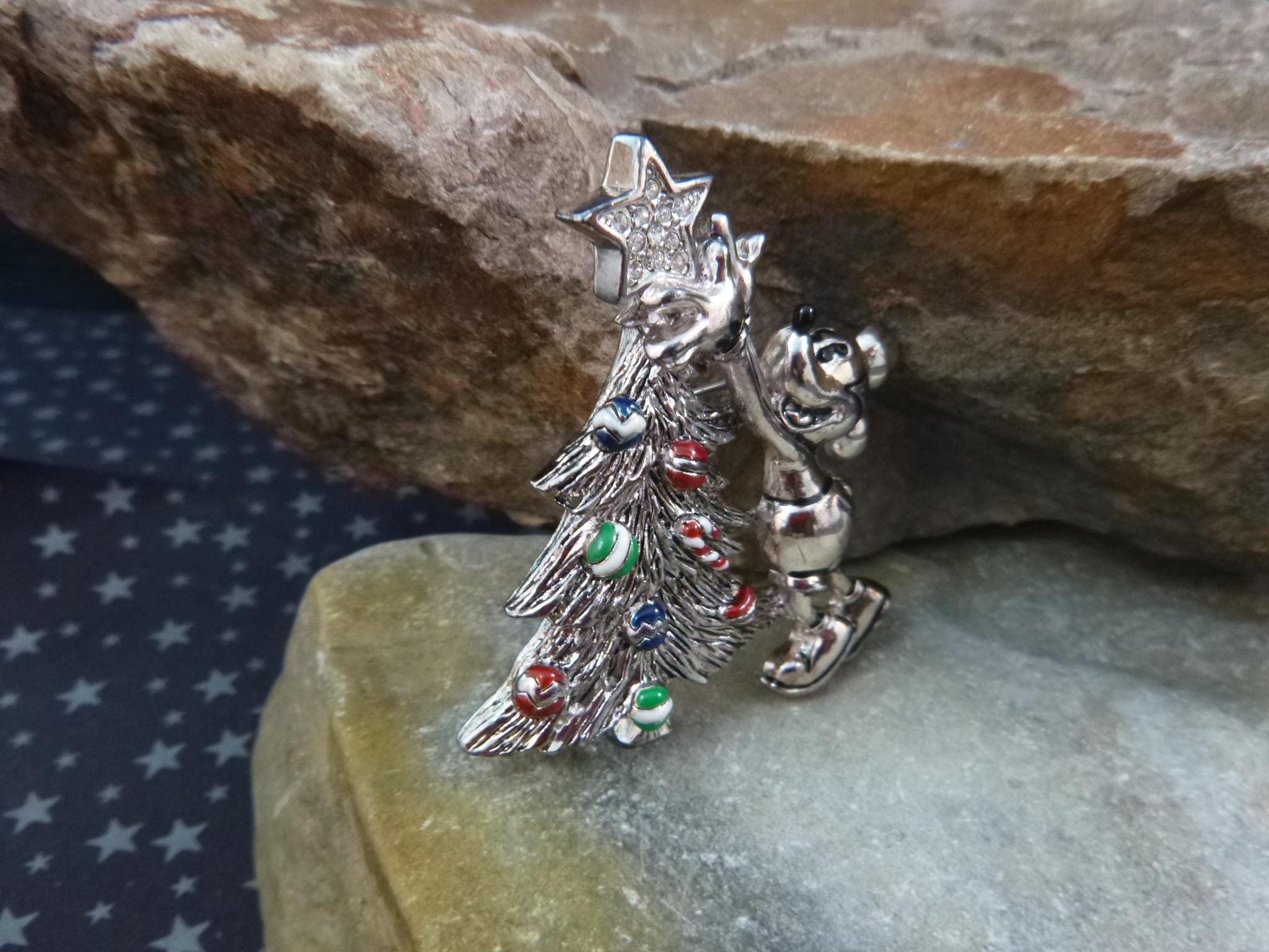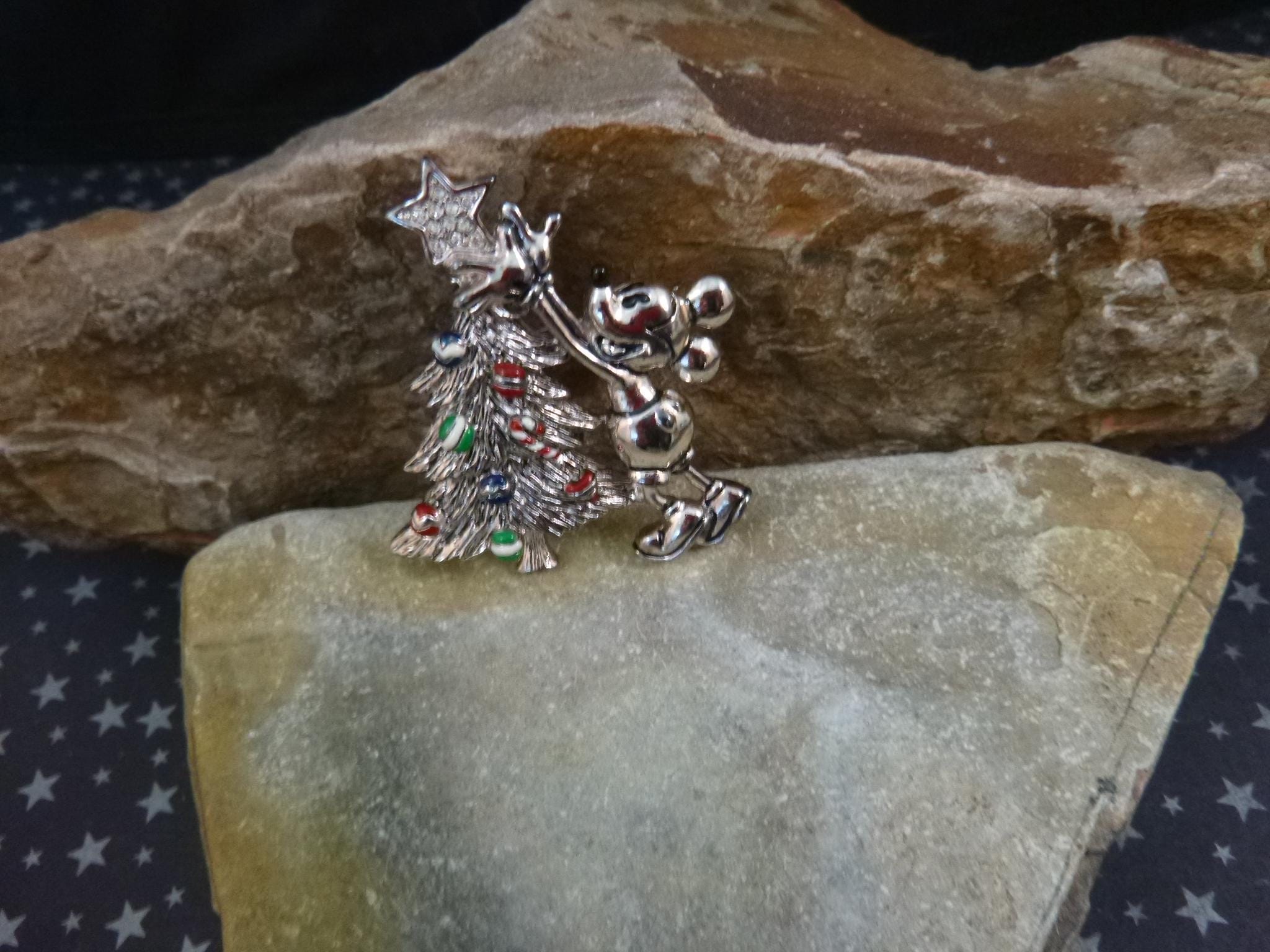 This rarely found Christmas tree pin is most likely from the late 1980s. This well-made piece set in silver tone metal has a substantial feel. The star has tiny rhinestones, and the tree has 8 enamel ornaments, with Mickey Mouse highlight with black enamel. The metal and colors are bright; the pin and clasp work well, and the overall pin is in very good to excellent vintage condition, with limited signs of wear. The "very good" reference reflects the gentle patina which adds to its character..
