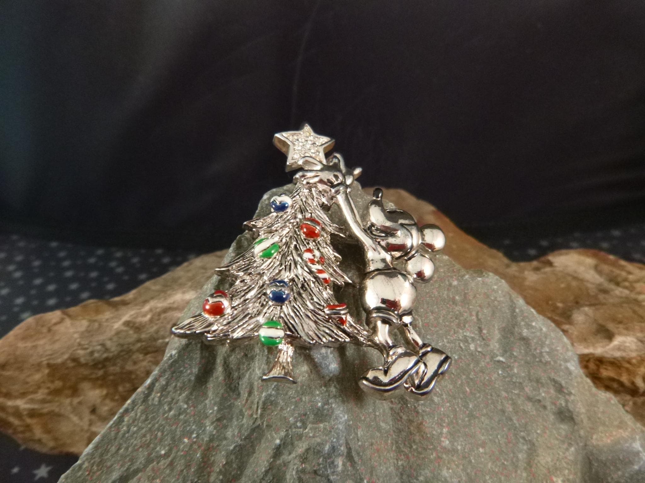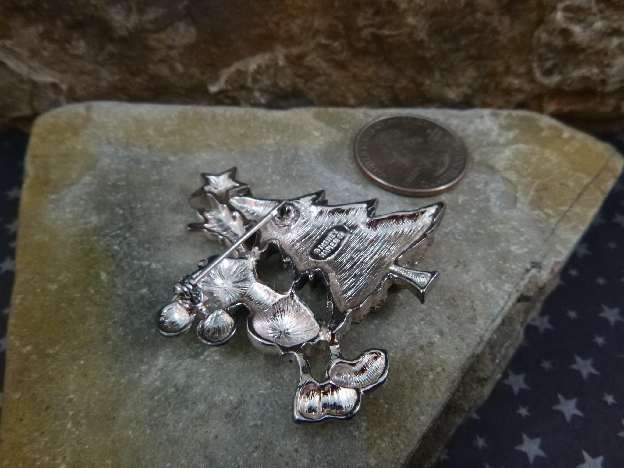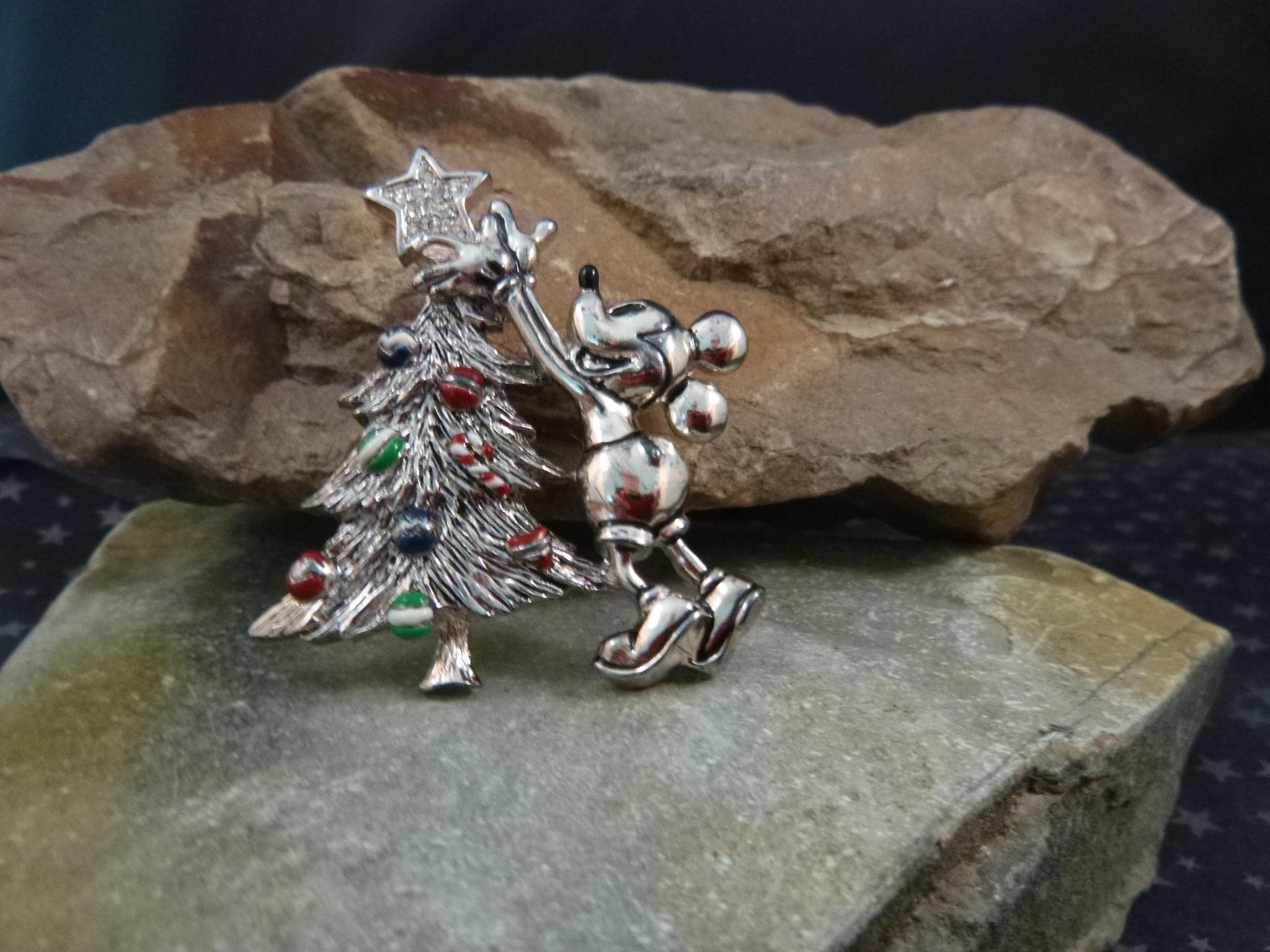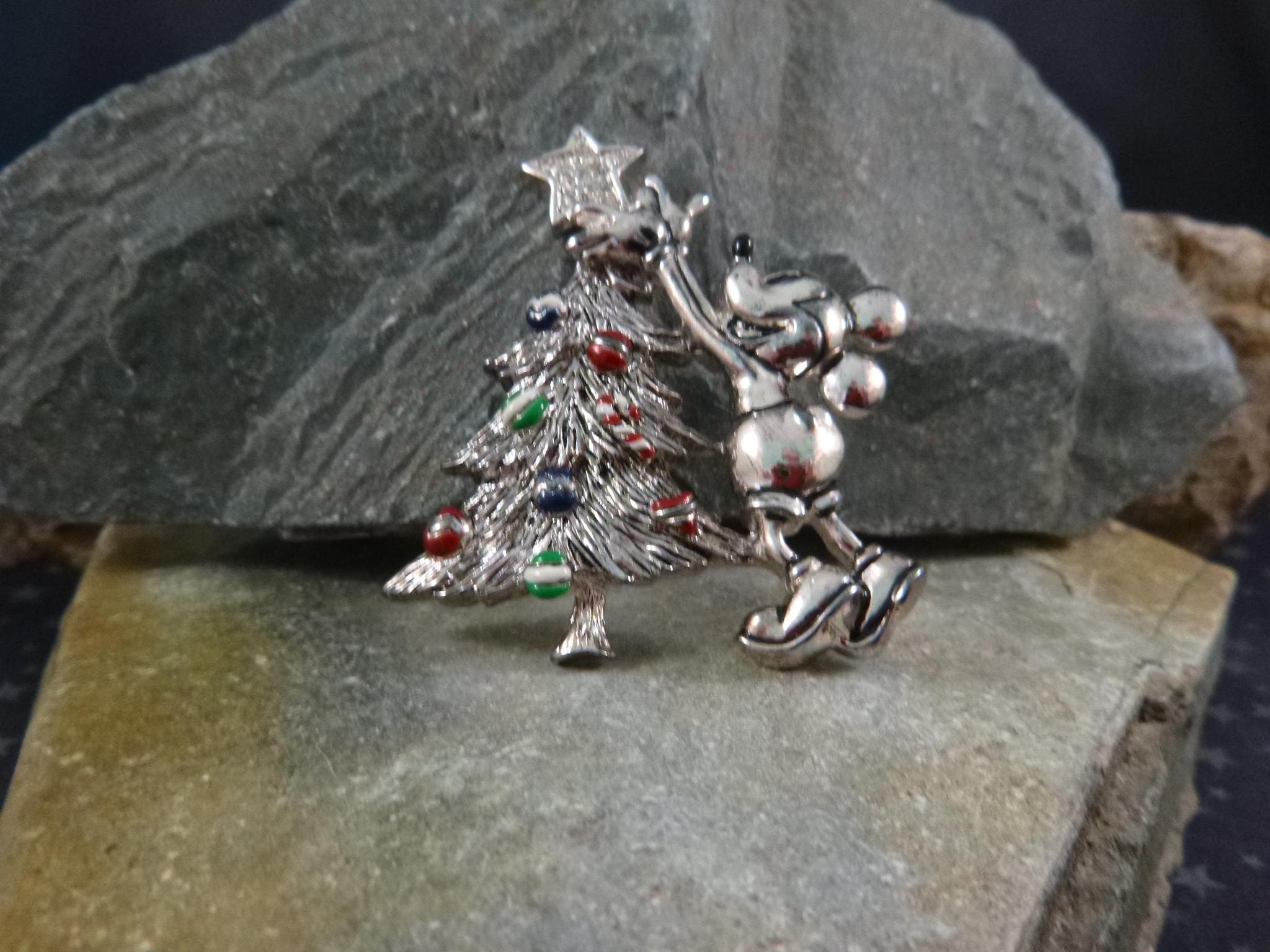 This rarely found Christmas tree pin is most likely from the late 1980s. This well-made piece set in silver tone metal has a substantial feel. The star has tiny rhinestones, and the tree has 8 enamel ornaments, with Mickey Mouse highlight with black enamel. The metal and colors are bright; the pin and clasp work well, and the overall pin is in very good to excellent vintage condition, with limited signs of wear. The "very good" reference reflects the gentle patina which adds to its character..