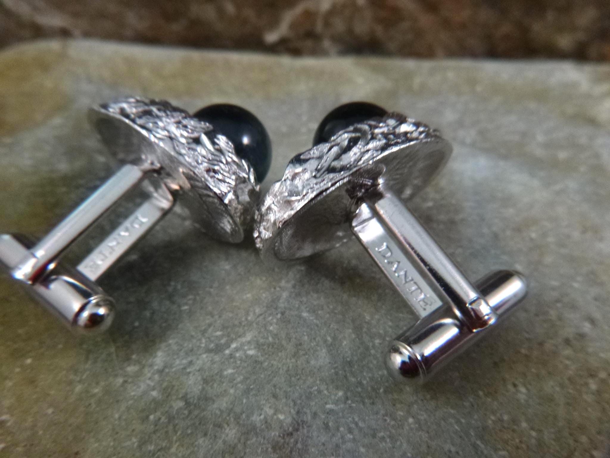 The maker’s mark, “Dante” is stamped in block letters on the inside shaft of each cuff link. Known for their high quality men’s jewelry and accessories during the l960s, Dante was a division of Shields, Inc. and stopped operations in the l970s. Their cuff links were often set with semi-precious stones such as jasper, agate, lapis, and onyx. These blue stone cufflinks are likely from the l960s.