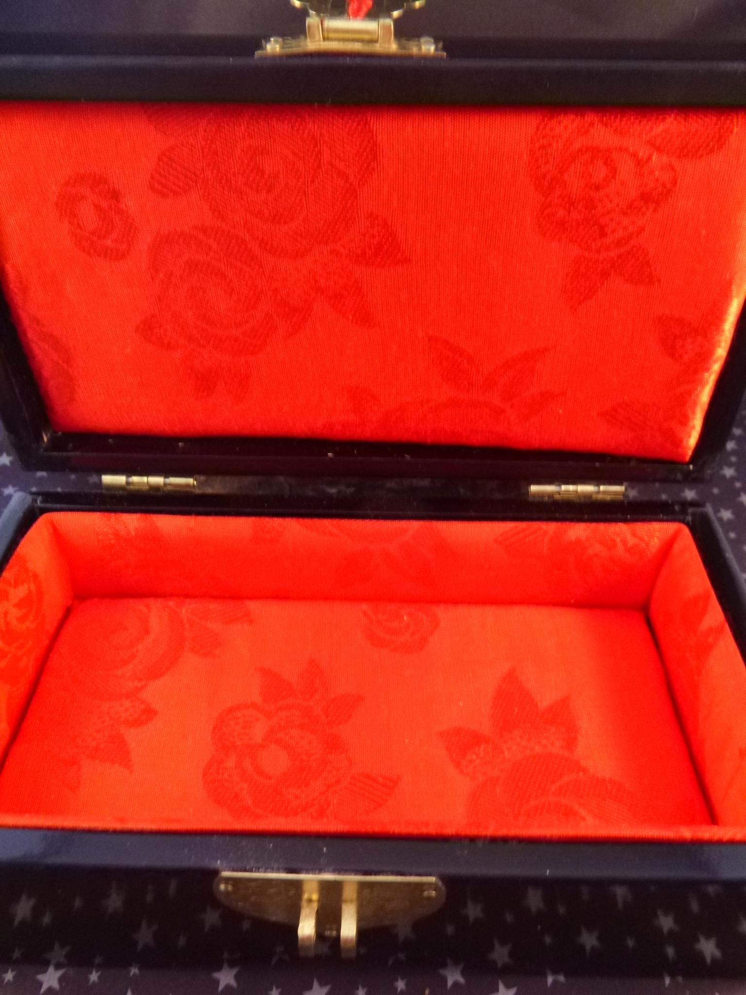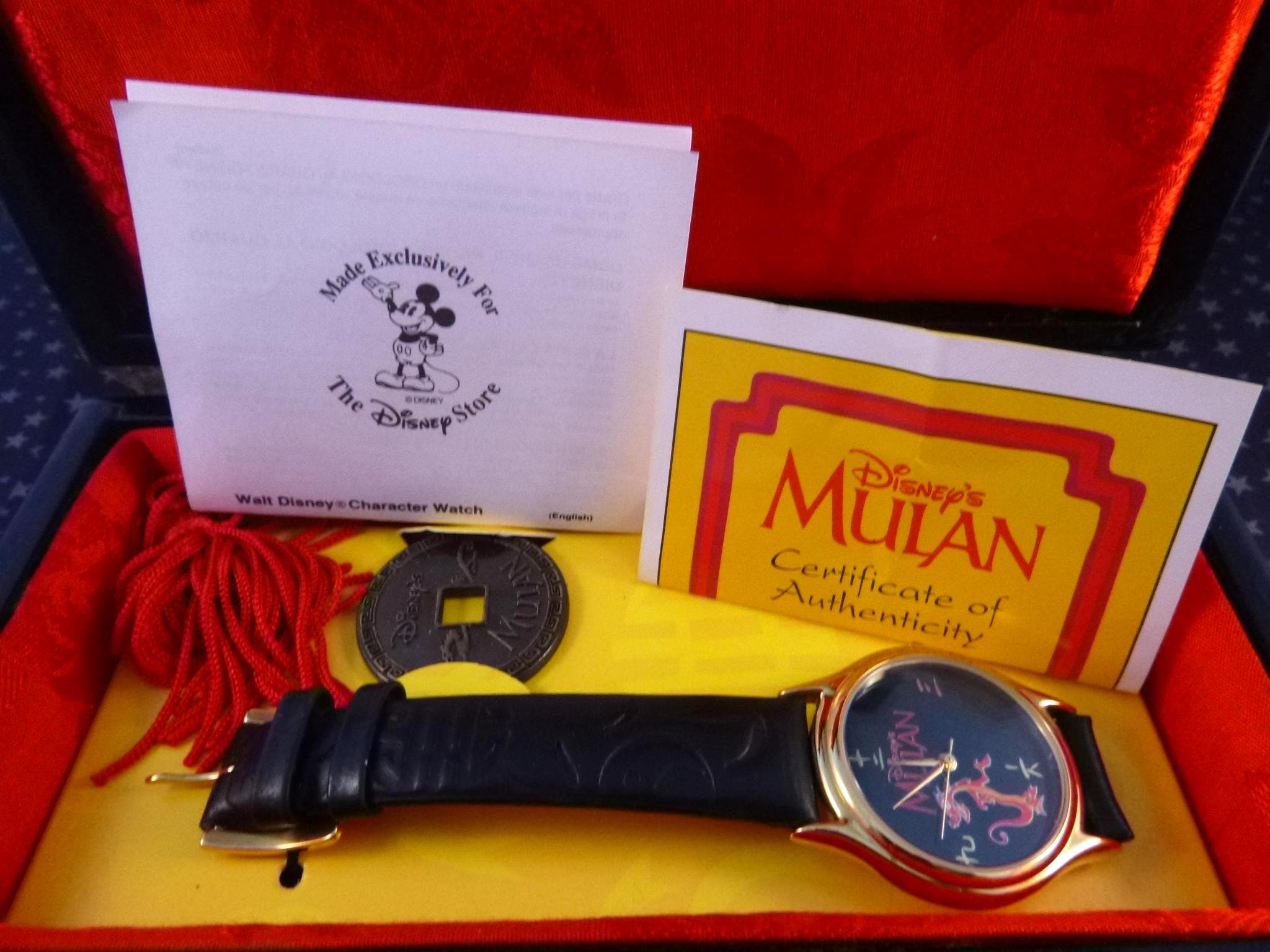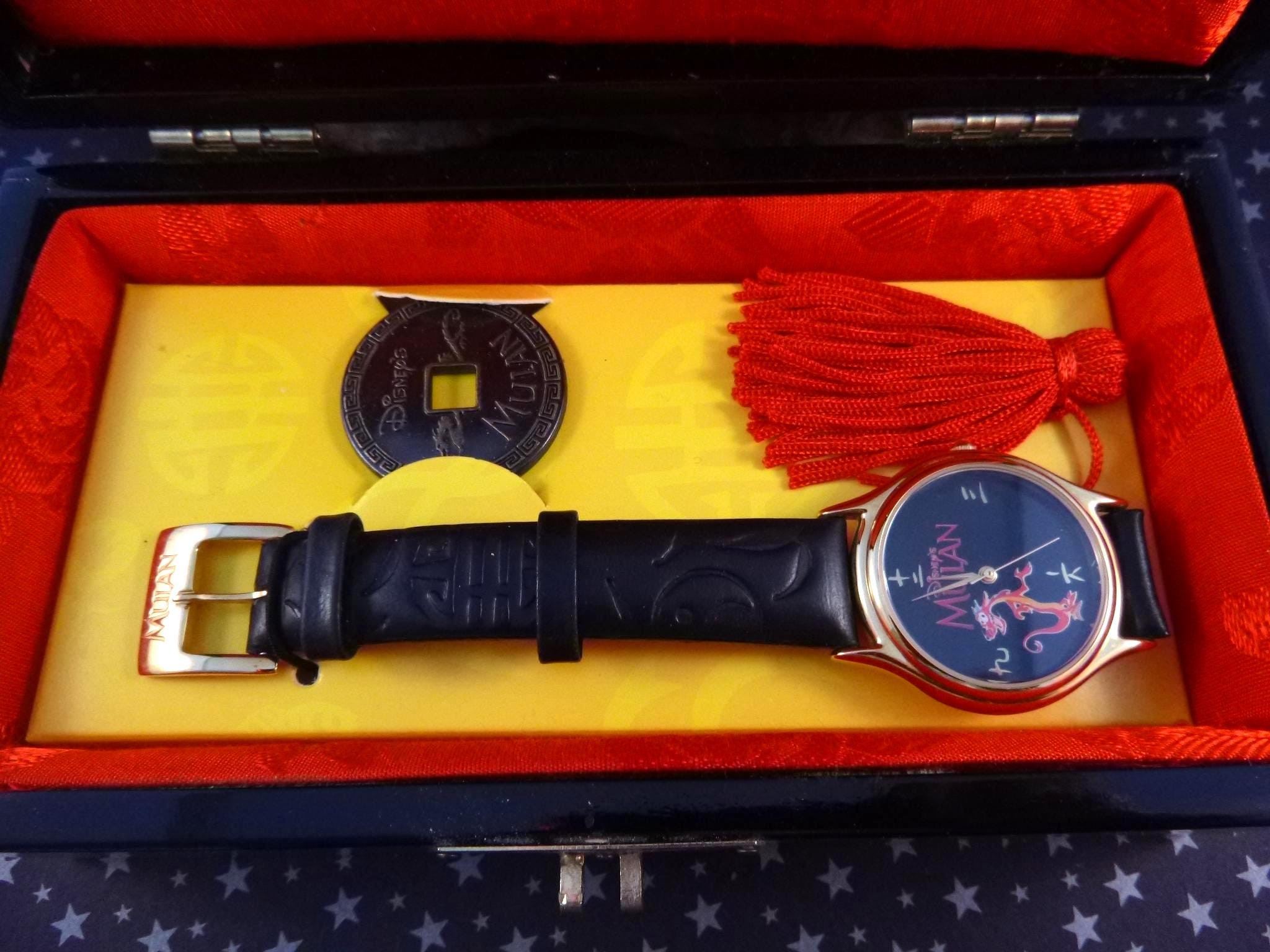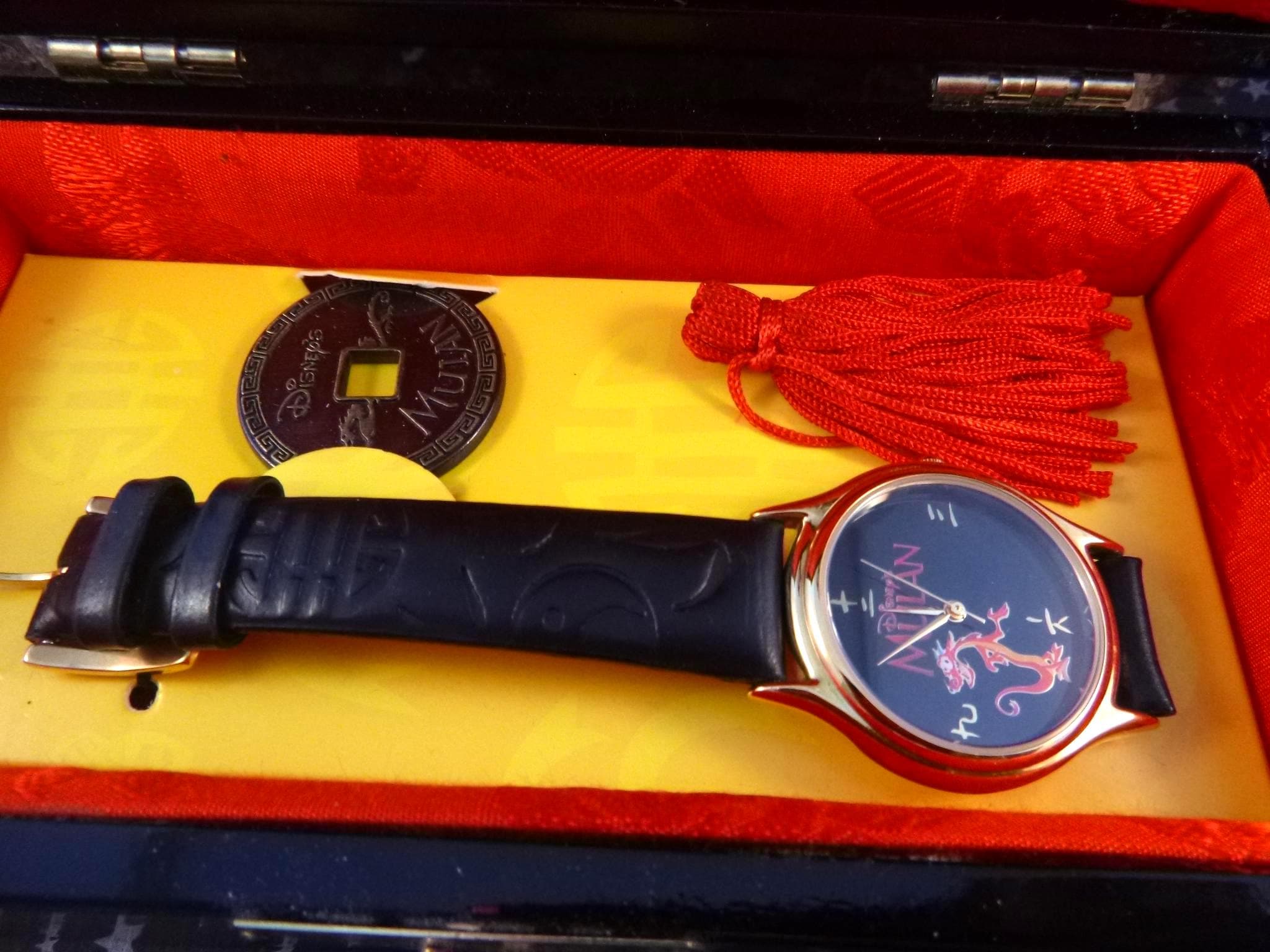 The watch is in its the original black lacquer box which measures 6.5” wide and 3.5” wide and is 3” tall. And is also in very good to excellent condition. Its red thread dangle is inside, and can be tied on the outside, The watch insert can be moved to make a lovely small jewelry box with red interior lining (see photo). The leather band is marked “Disney” and “Genuine Leather Hong Kong,” and its original price sticker is on the bottom.