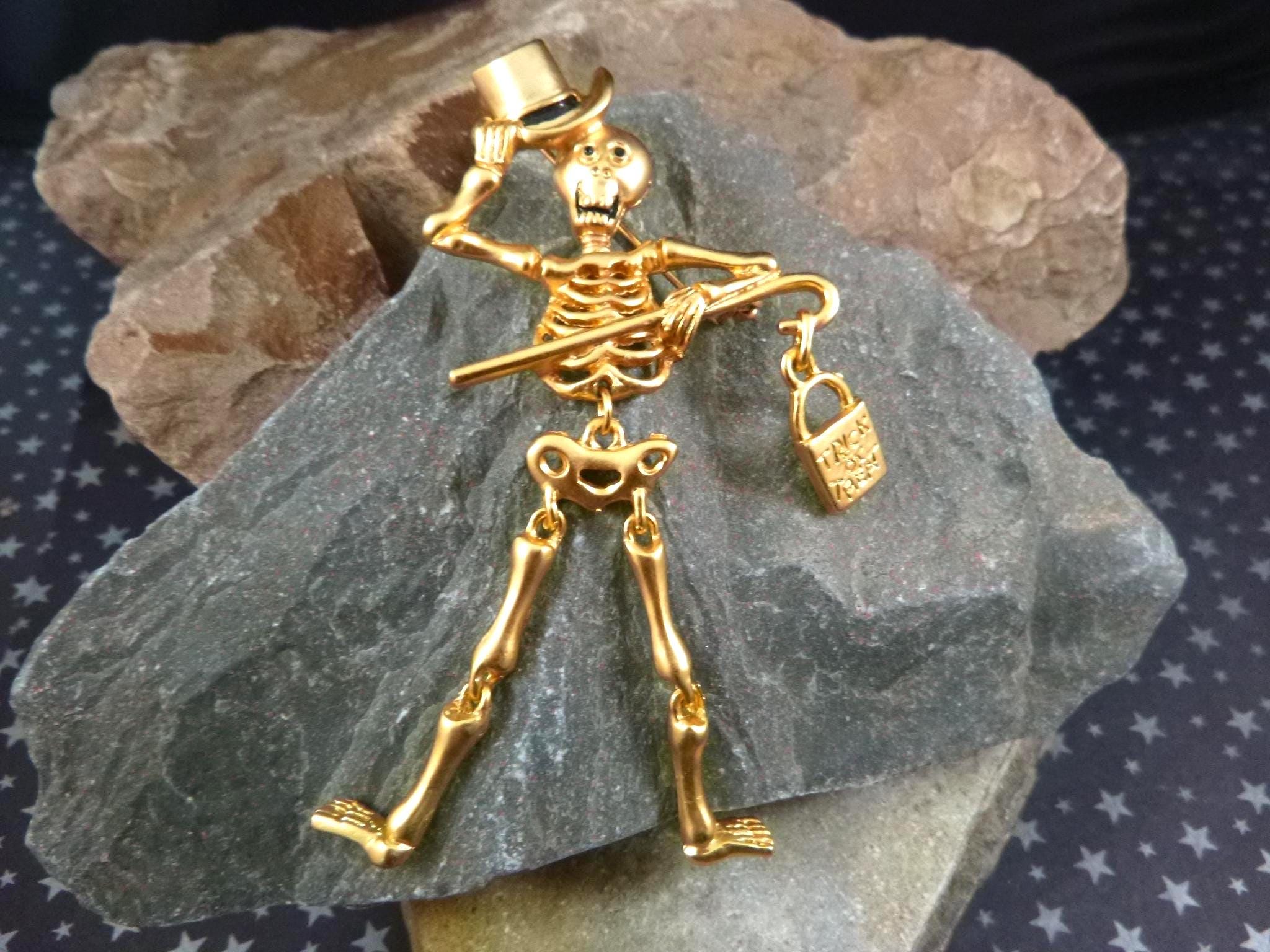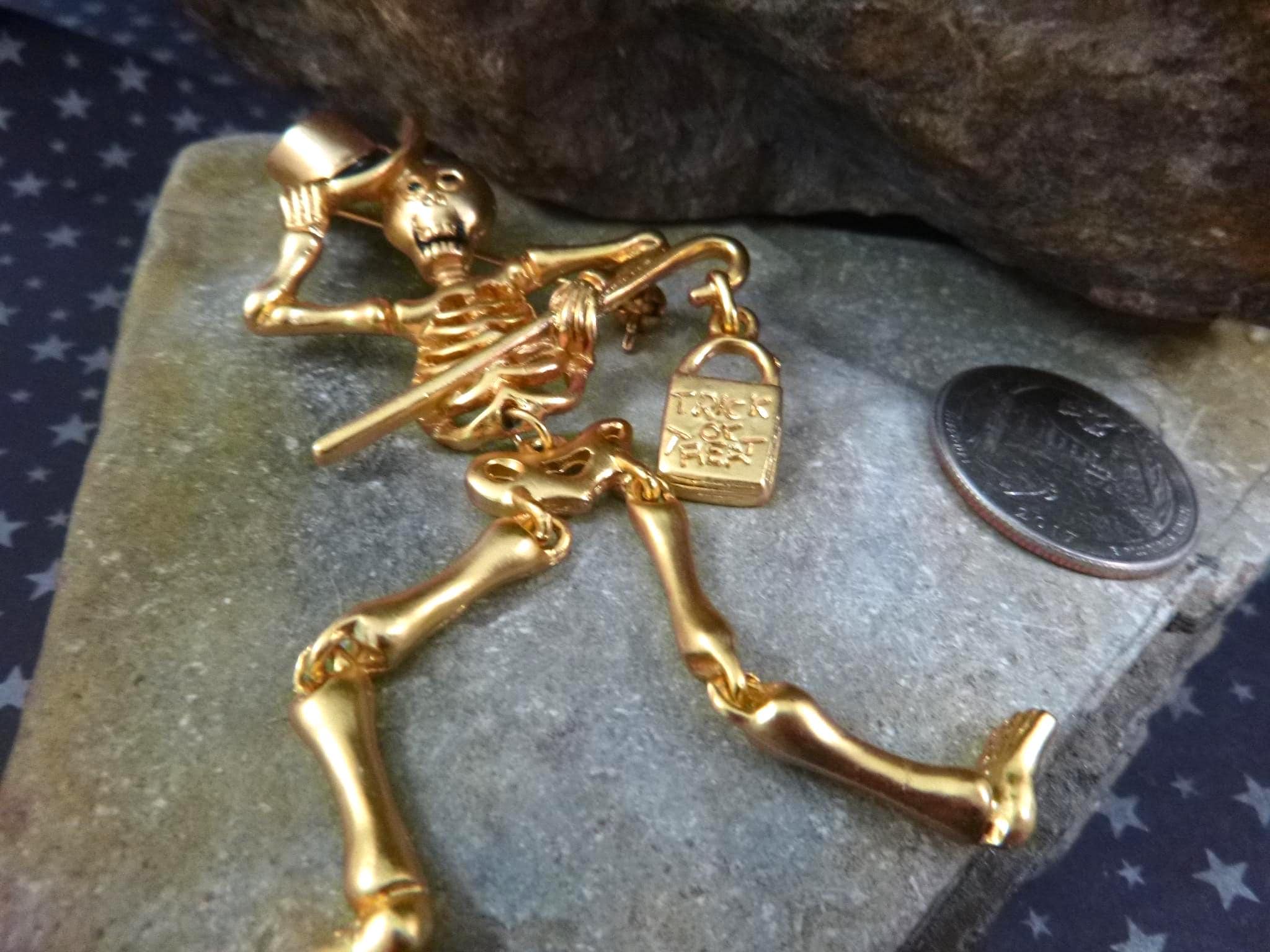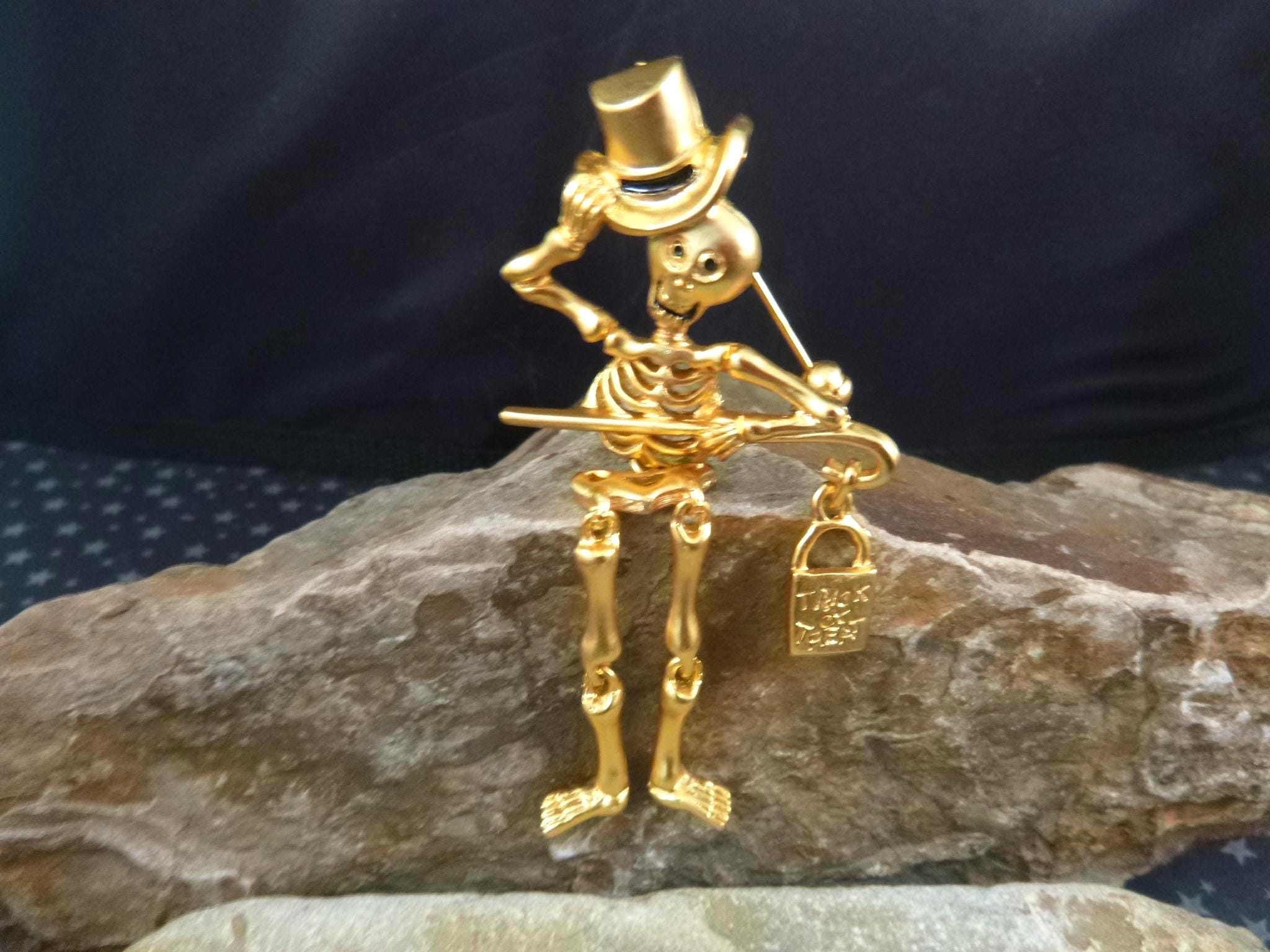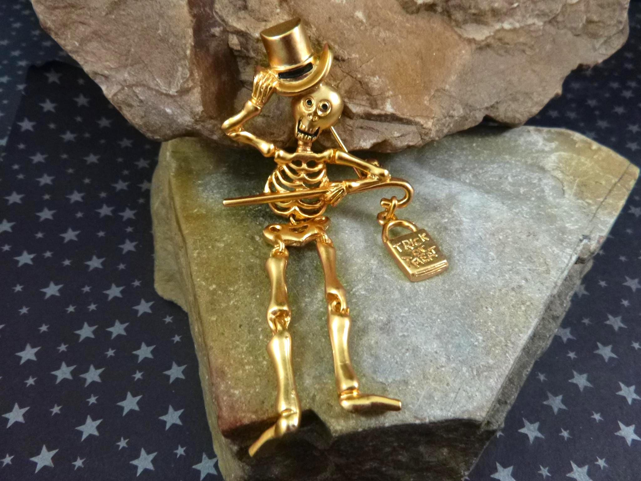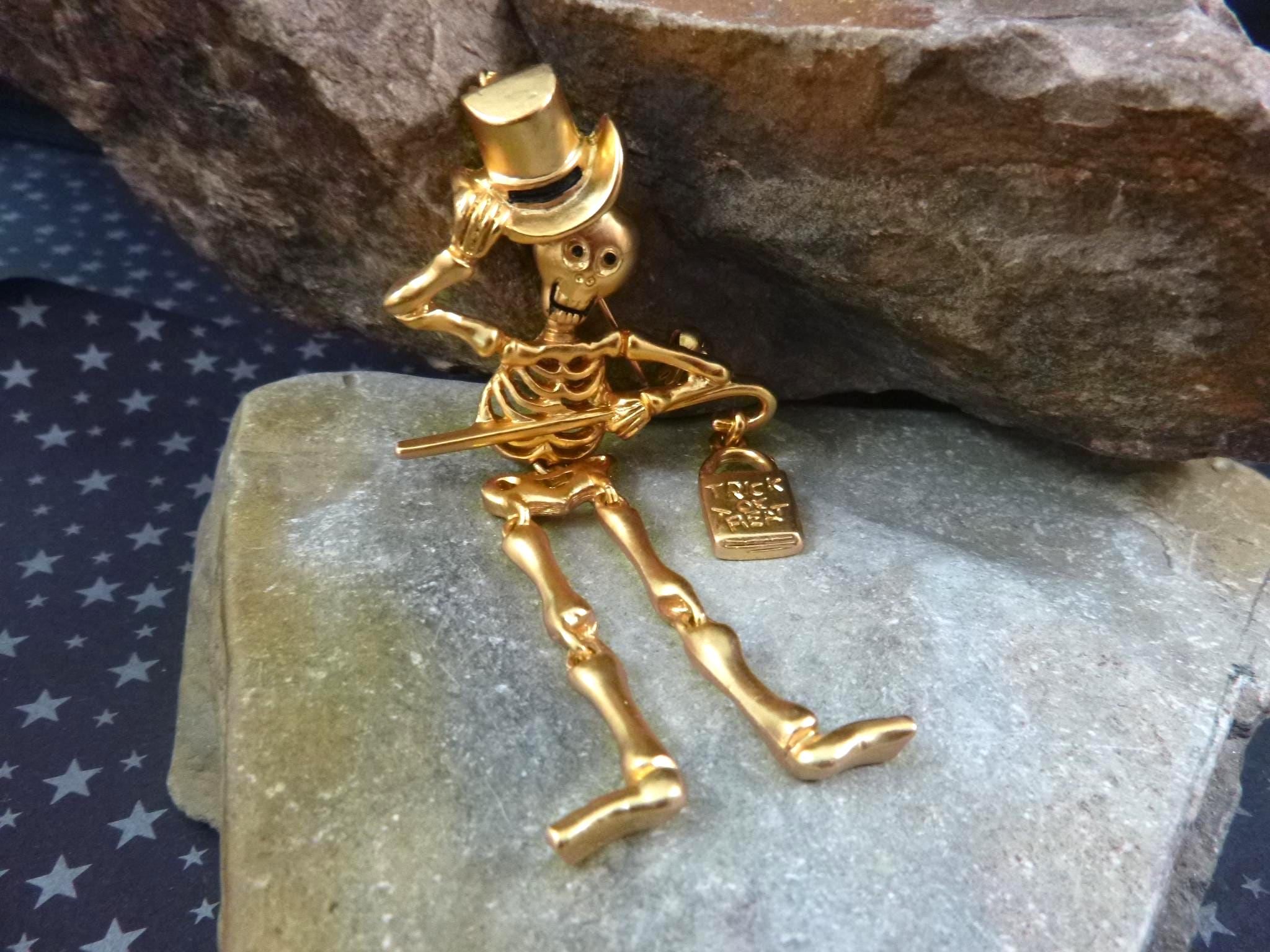 This articulated skeleton tipping his top hat and holding a bag which reads, “Trick or Treat” has great personality and presence. Set in a gold tone metal, he is a well-made, fun and a different kind of Halloween pin.