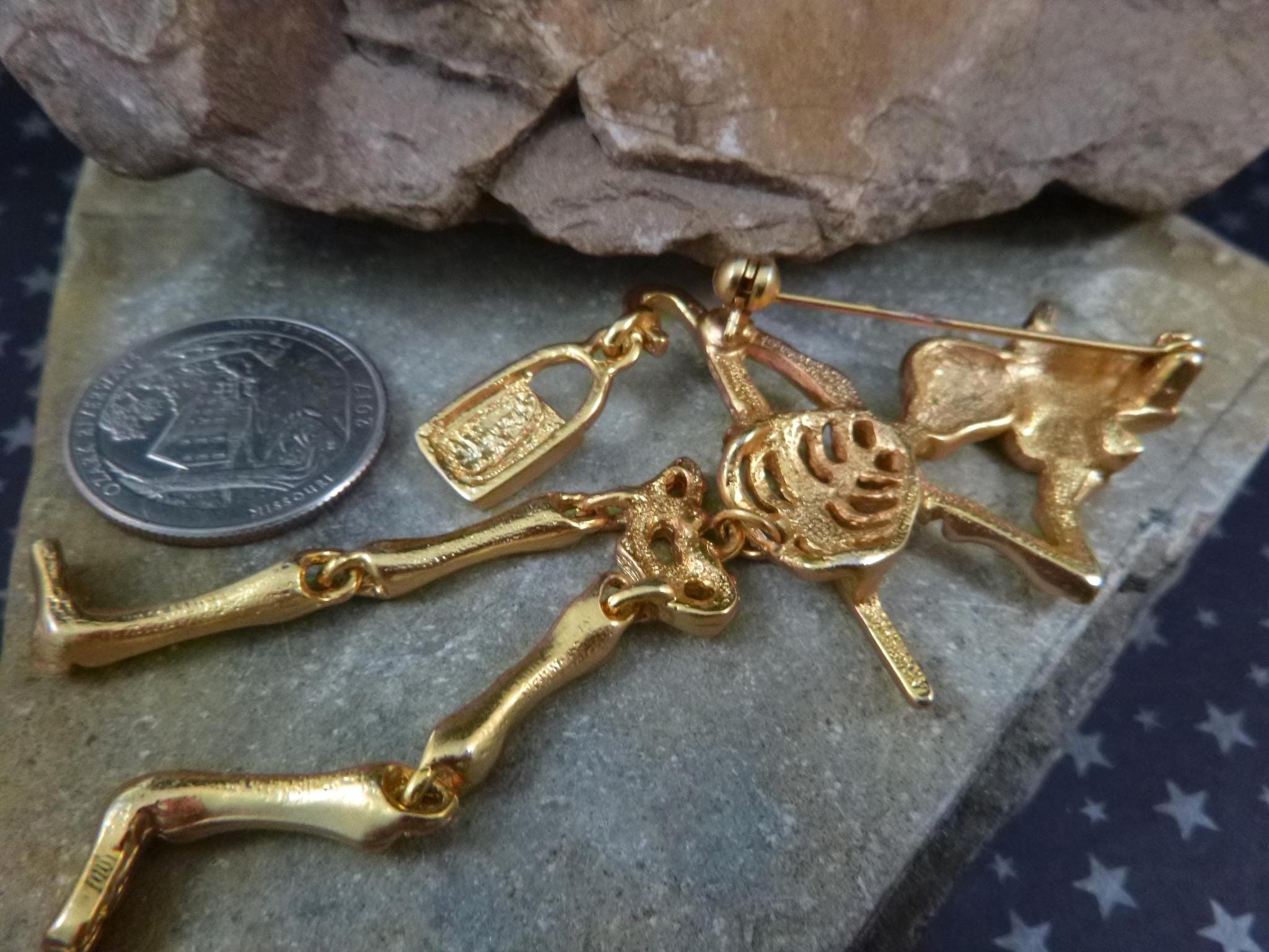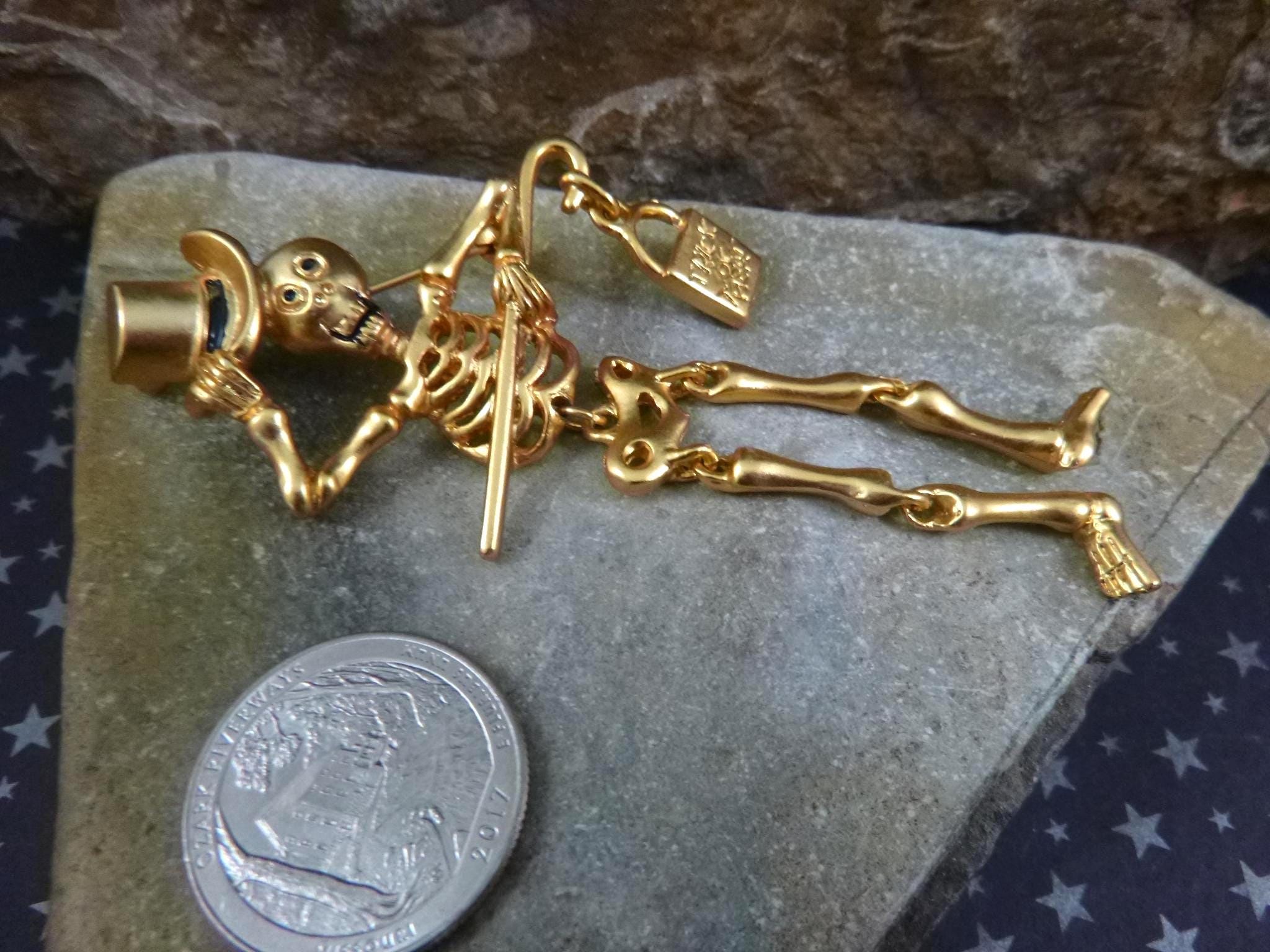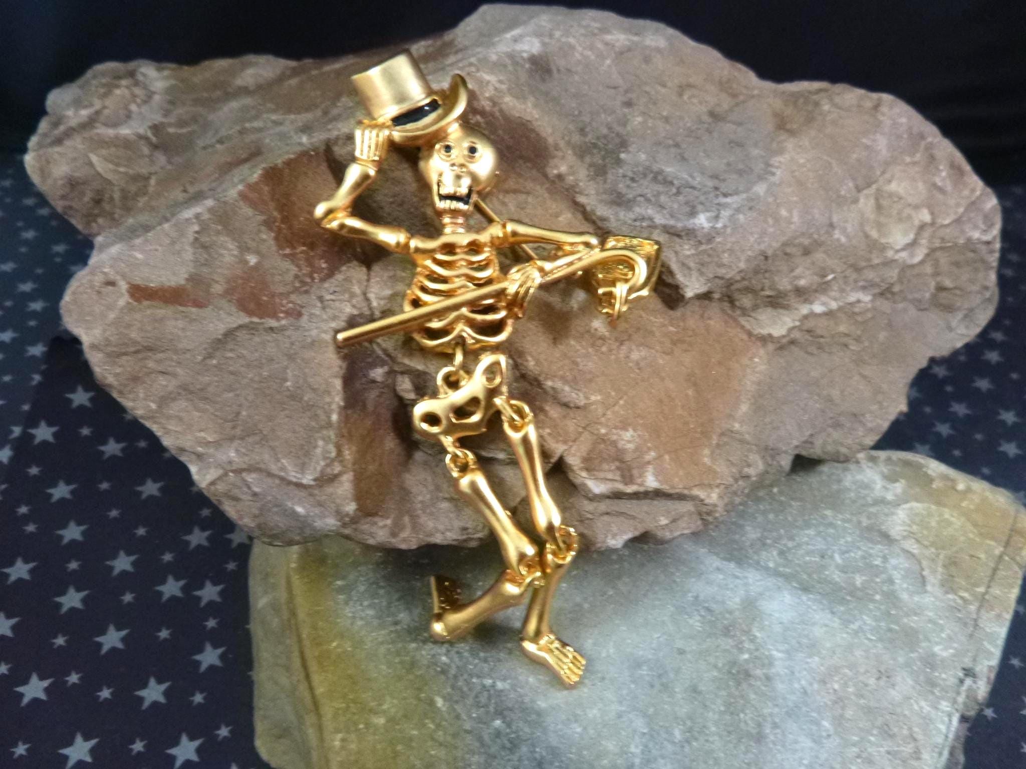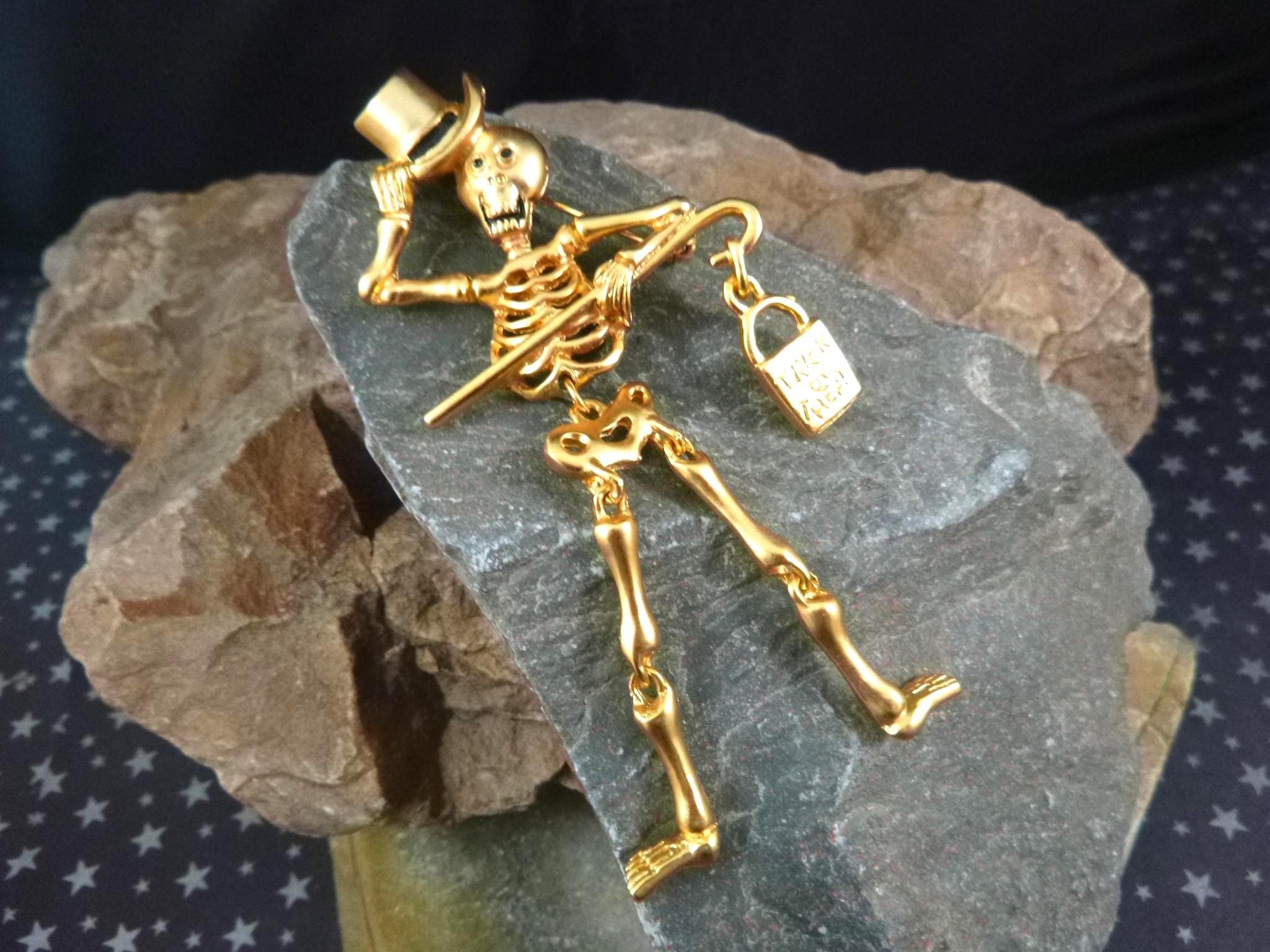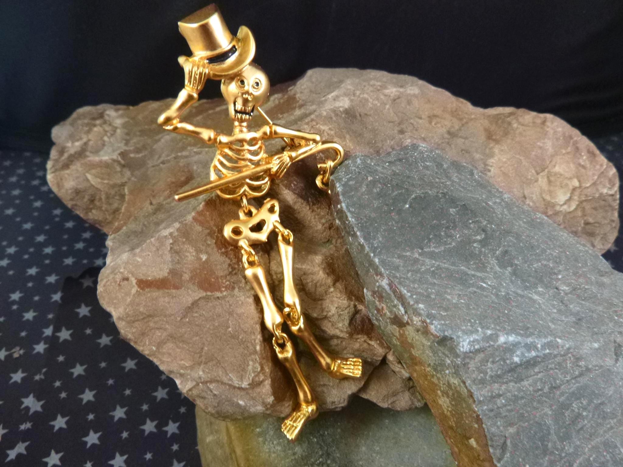 This articulated skeleton tipping his top hat and holding a bag which reads, “Trick or Treat” has great personality and presence. Set in a gold tone metal, he is a well-made, fun and a different kind of Halloween pin.