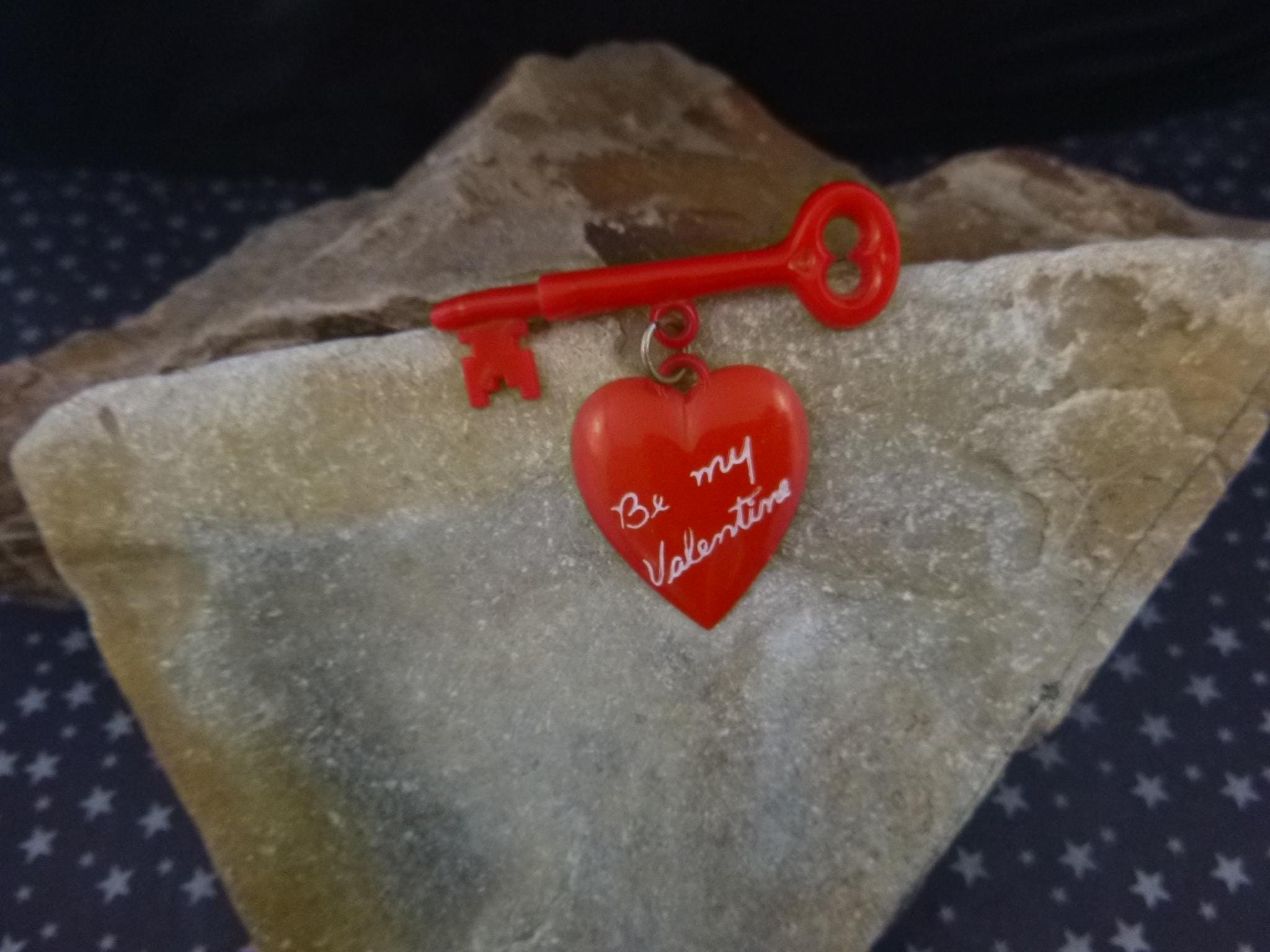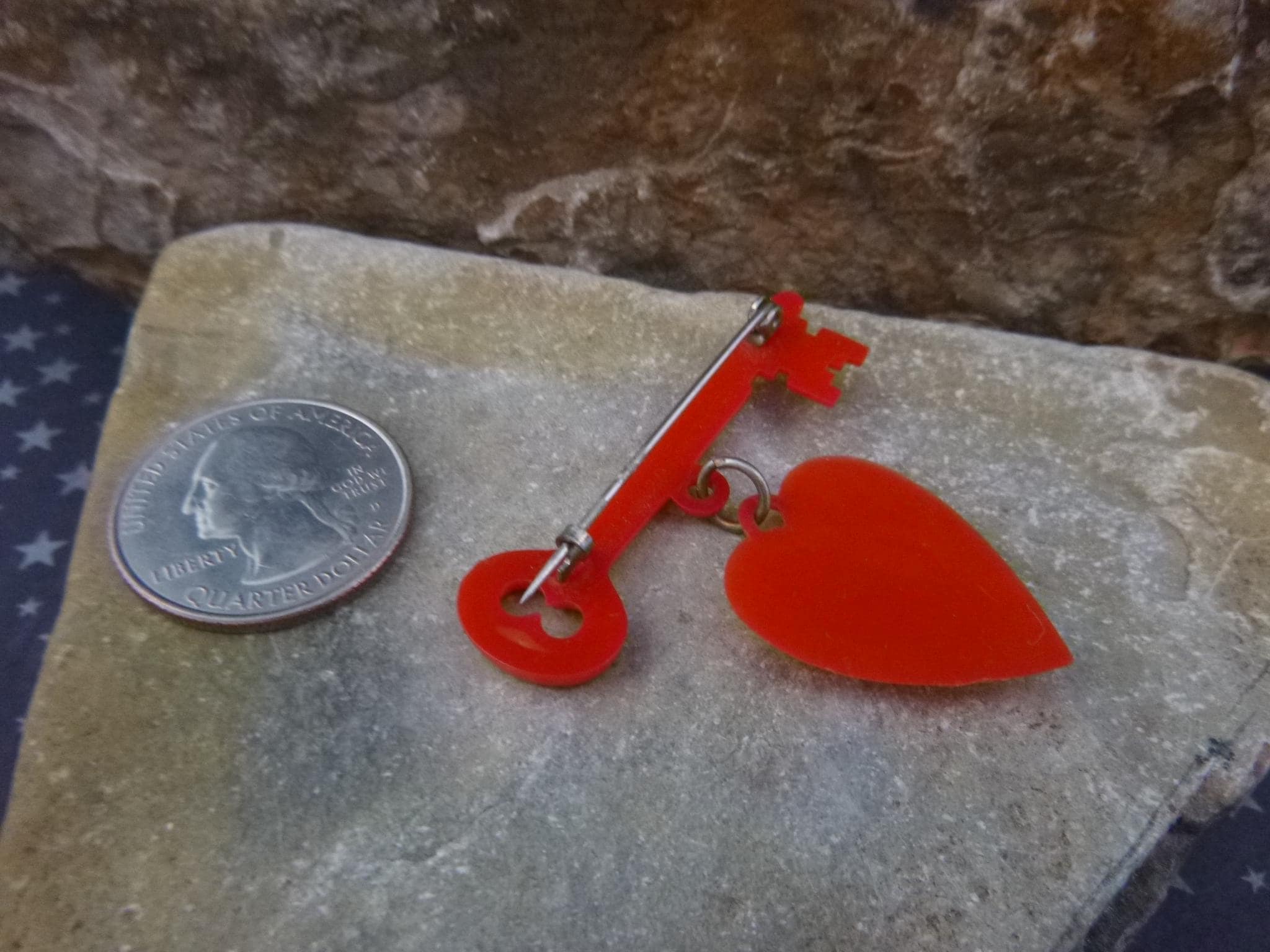 Made of mid-century thermoset vintage plastic, the pin measures 1.75” wide across the key and dangles 1.5” to the tip of the heart. The heart swings freely from the key. The red color is vibrant; the pin and fastener strong and secure. This little pin is a wonderful reminder of simpler times and a fun vintage piece.