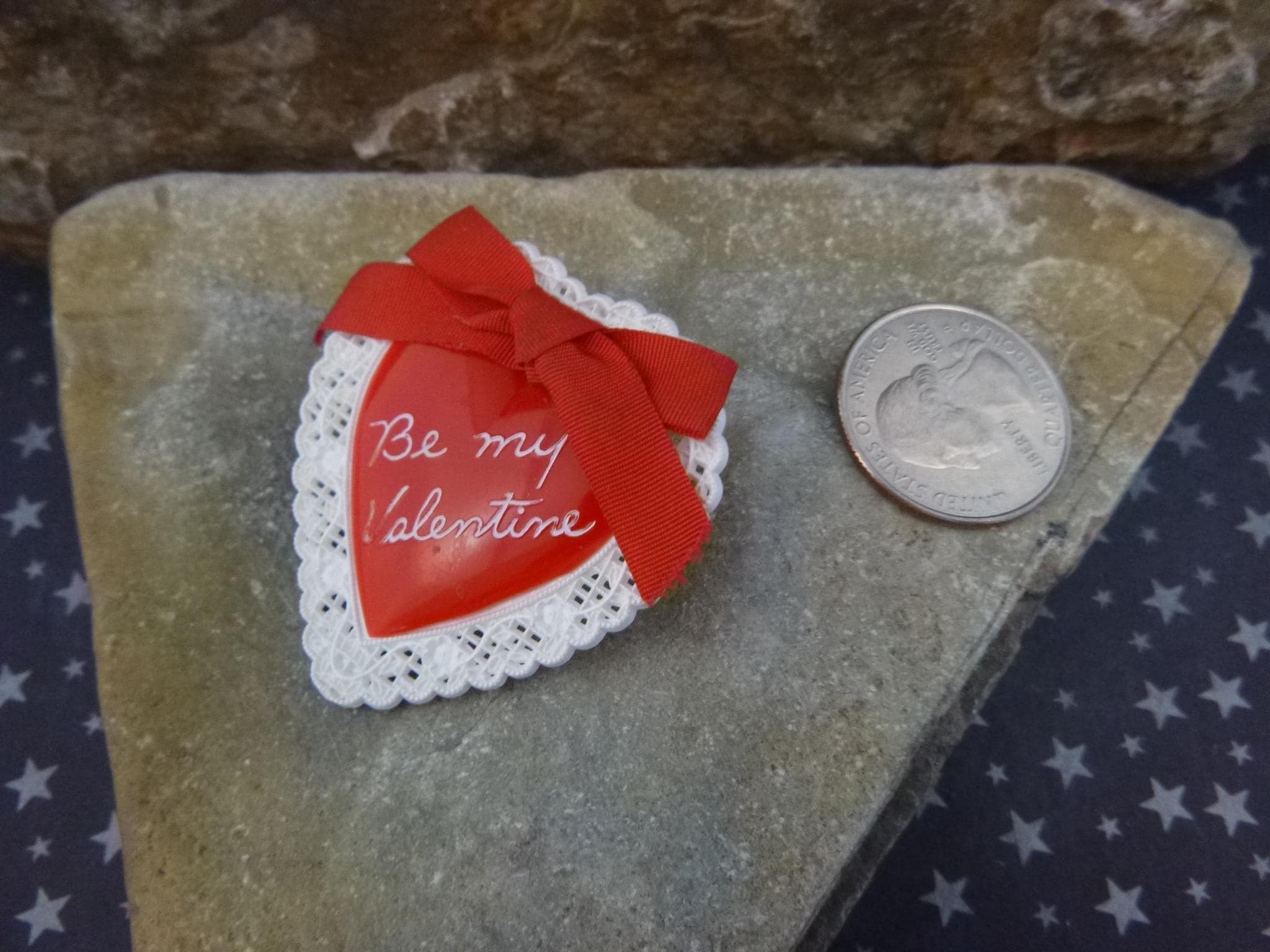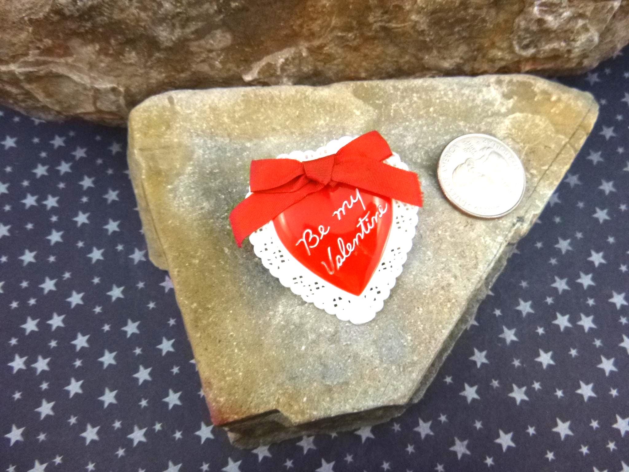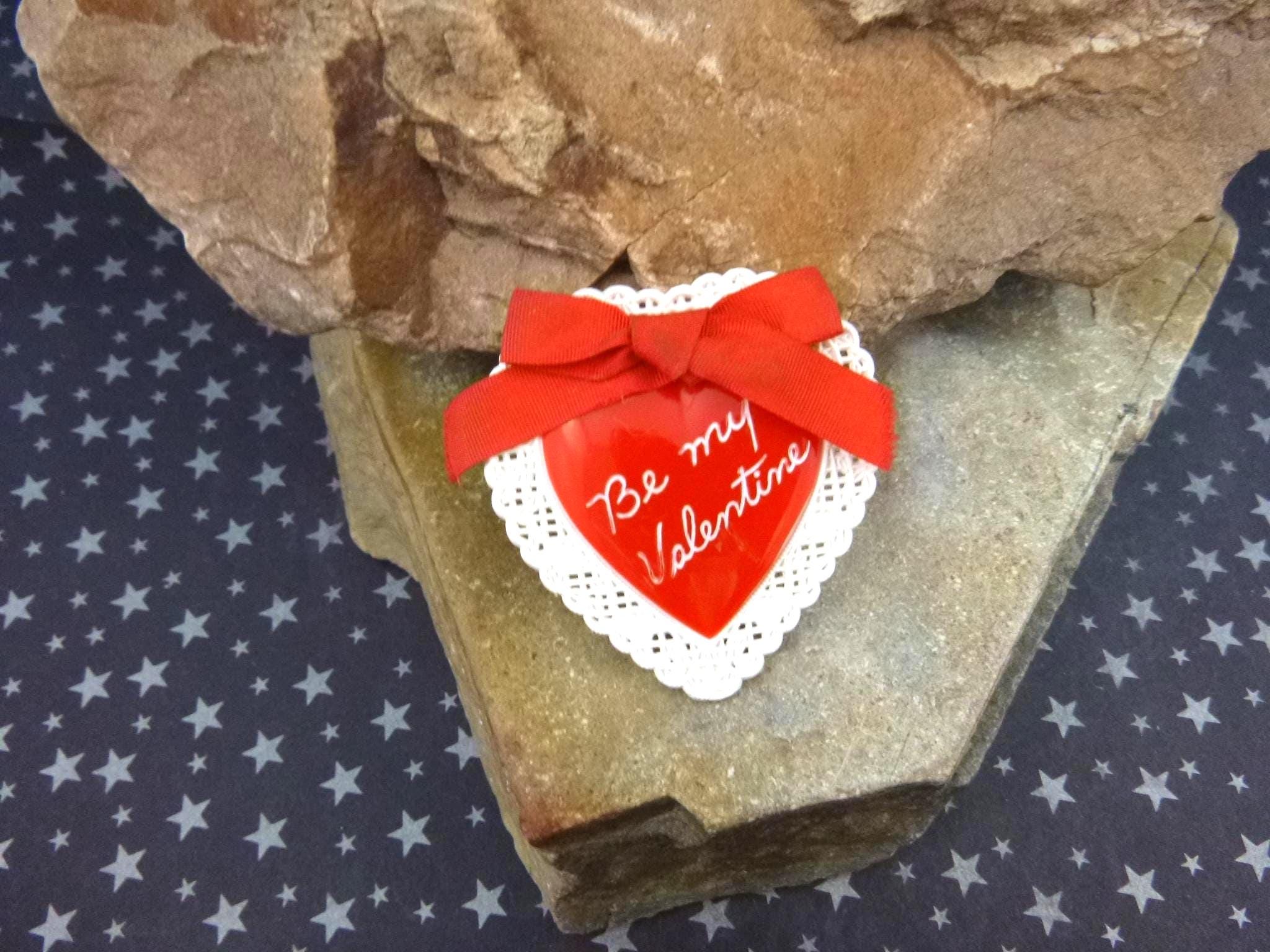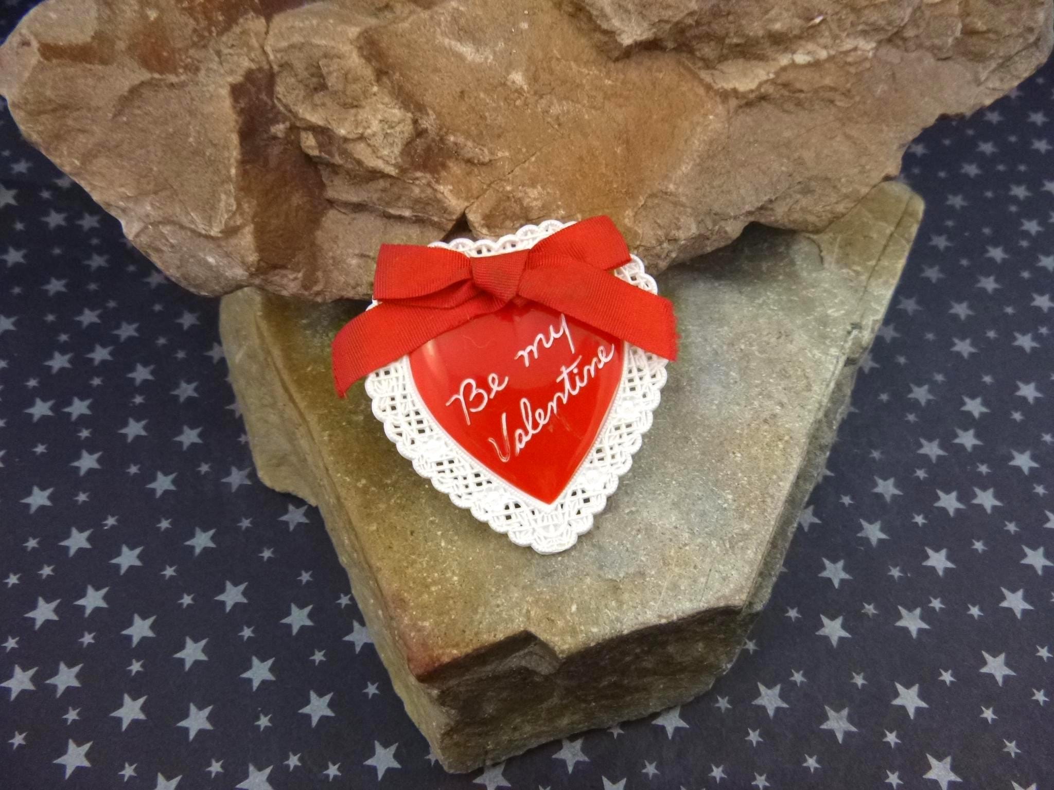 This 1950s pin is in very good vintage condition, meaning it shows better than average wear for its age. There are a few light scratches here and there, but the condition is quite wonderful after all these years. The red color is vibrant and the pin and fastener strong and secure. It’s made of a hard plastic and measures 1 5/8” wide and 1 ¾” tall, with a doily look border, Be My Valentine on the front, topped with a red ribbon bow.