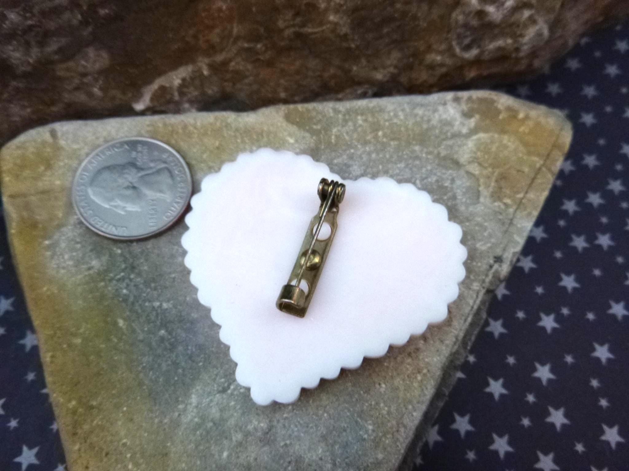 Overall, this heart pin is in very good vintage condition, measuring 2 by 1.75 and is perfect for Valentine’s Day. The pictures offer greater perspective on its vintage nature and happy love feeling.