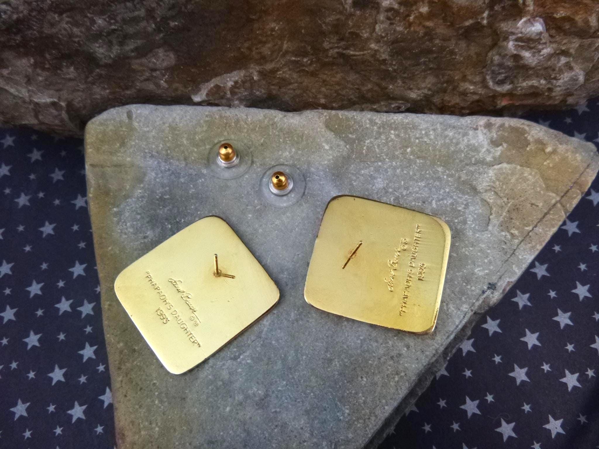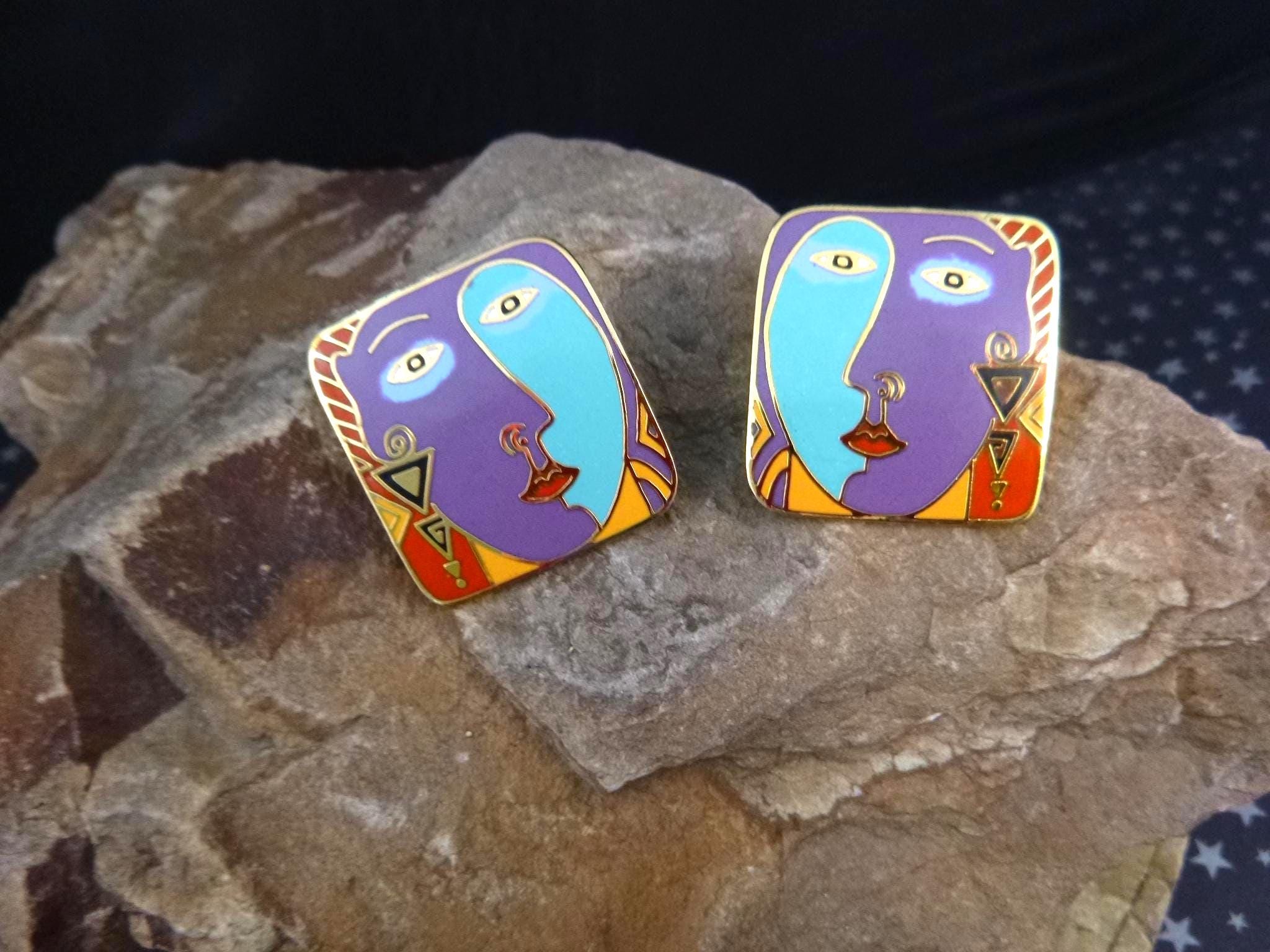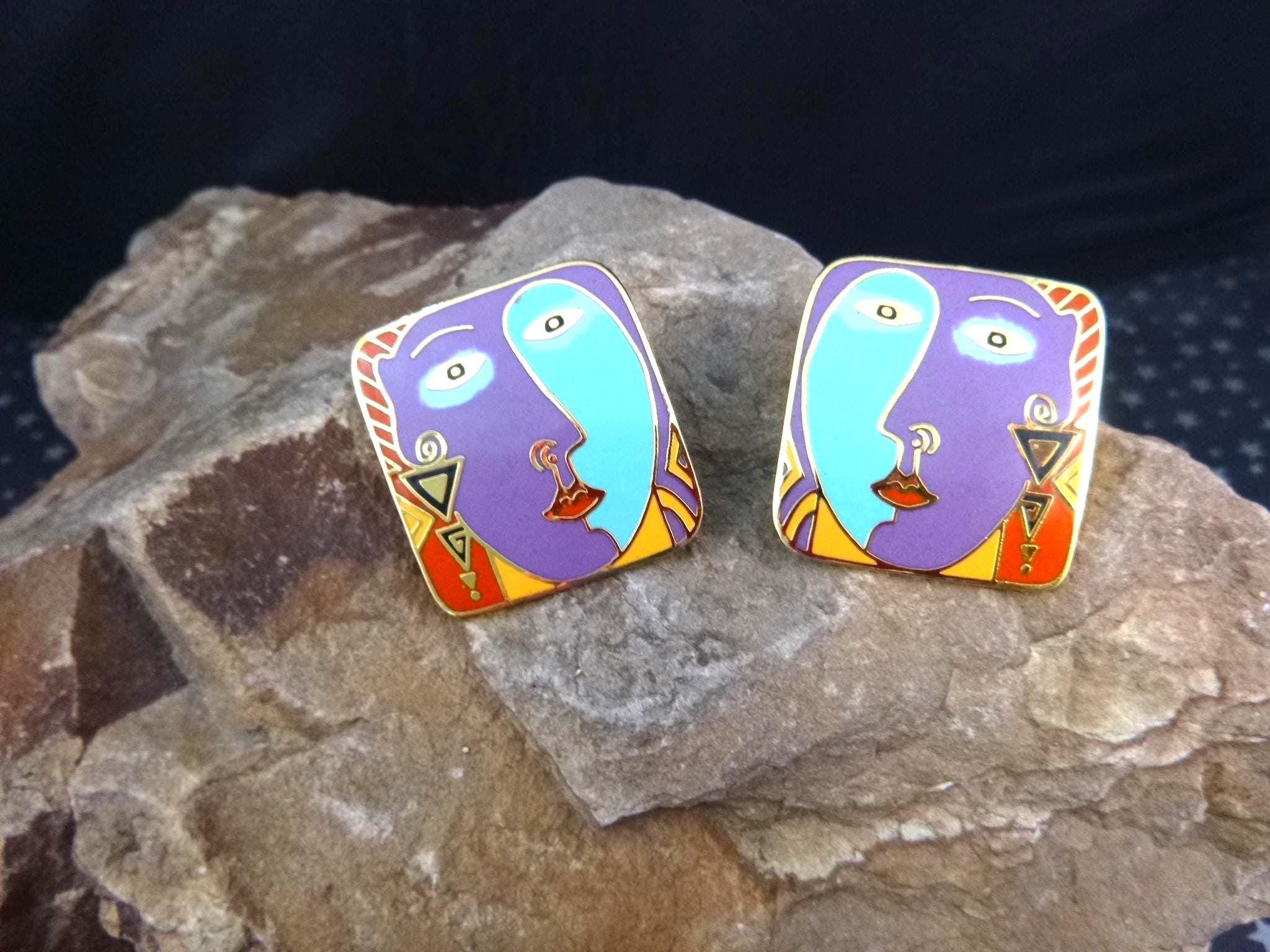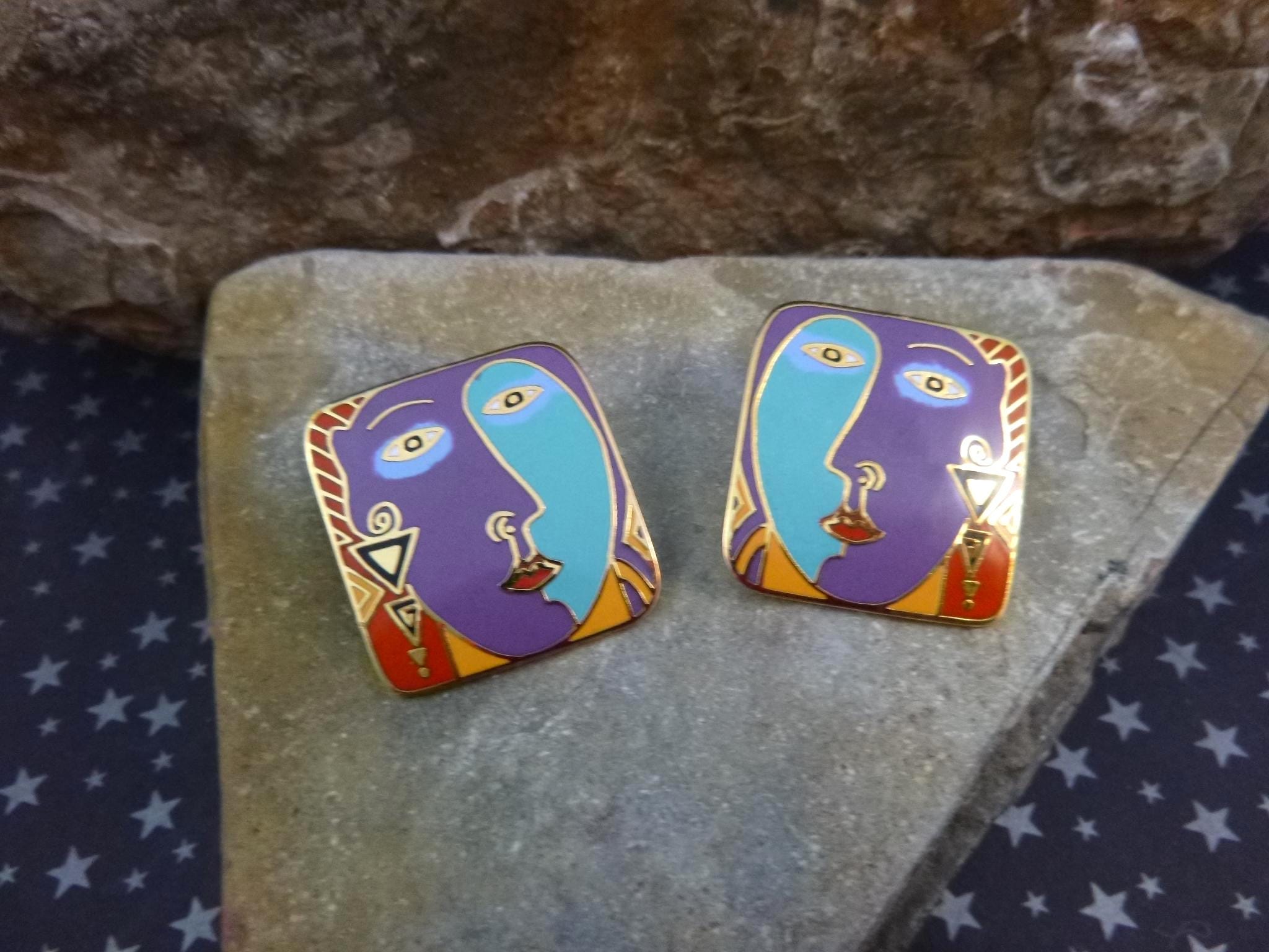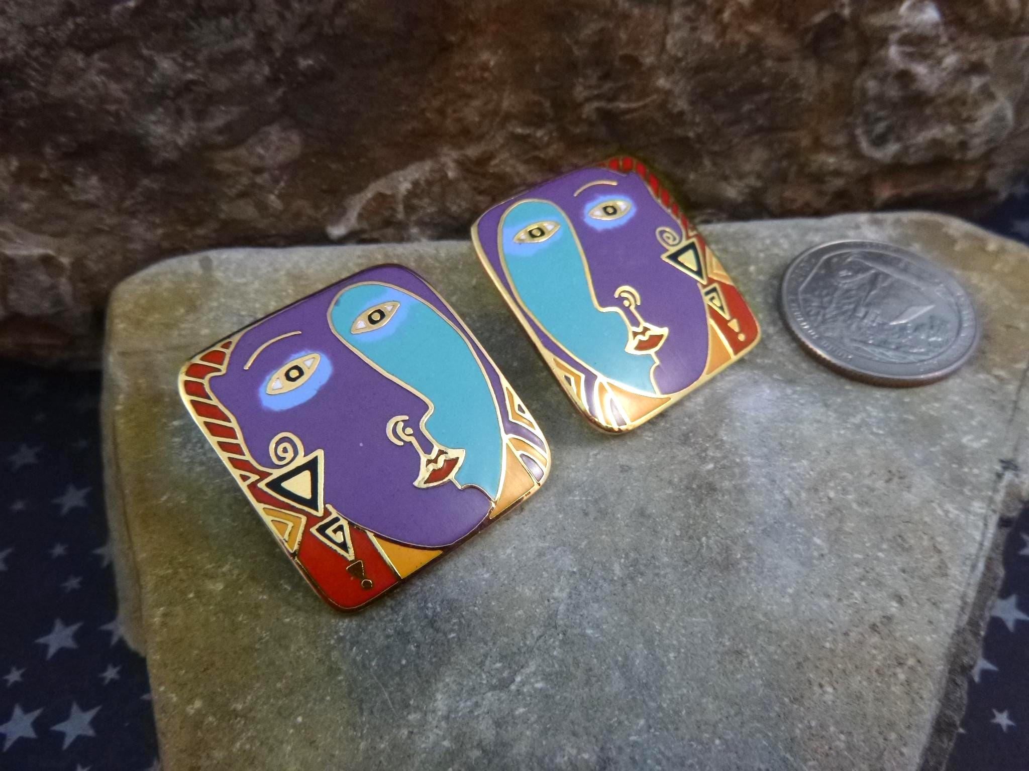 Bold. Unusual. Delightful. These vintage two-sided face motif, large earrings are classic Laurel Burch design – whimsical and fun. Her personal story is worth reading on her official website: laurelburch.com. According to her website, her work "was always about bringing different cultures together, and about our connection with the earth and all living things."
