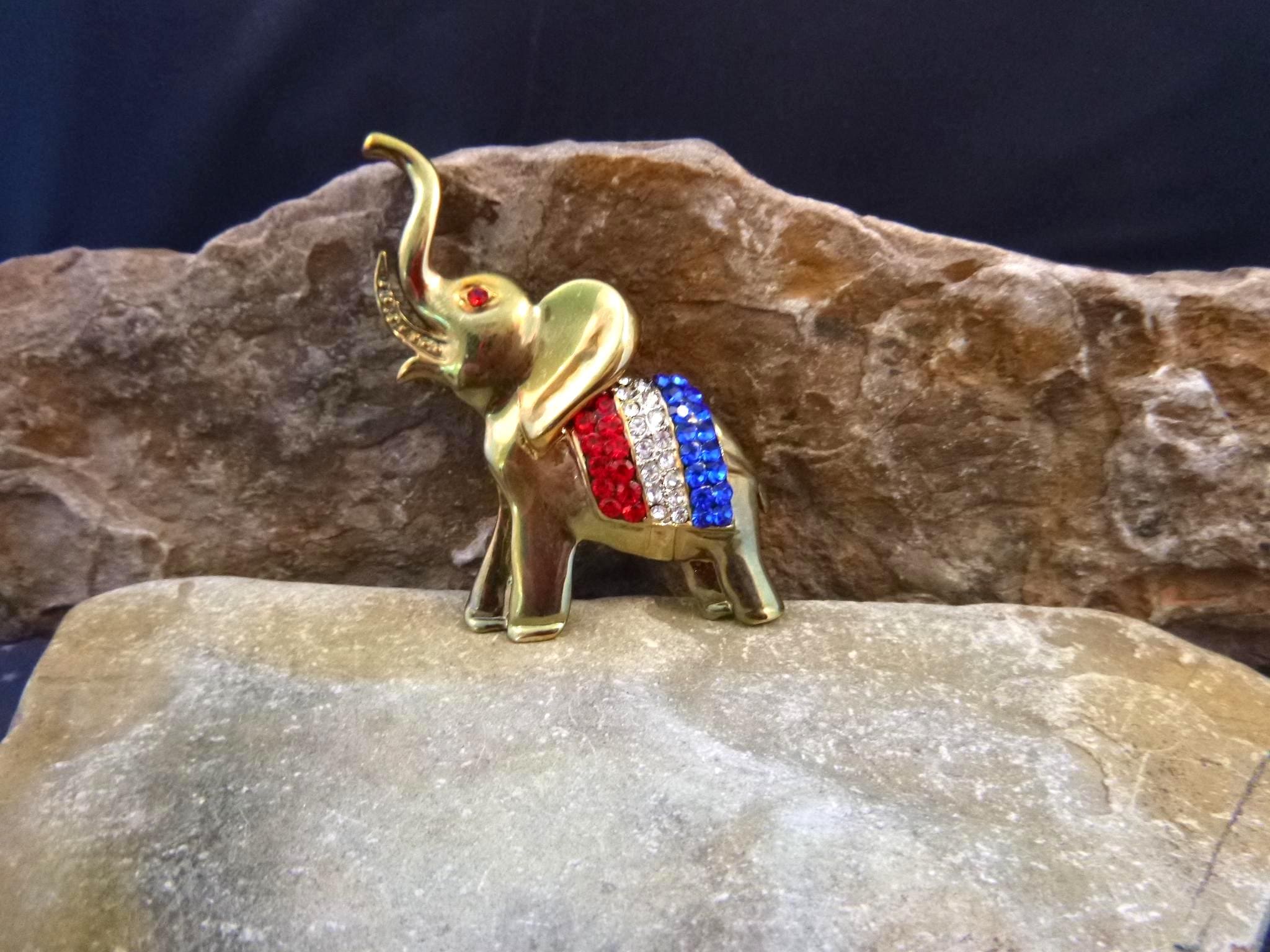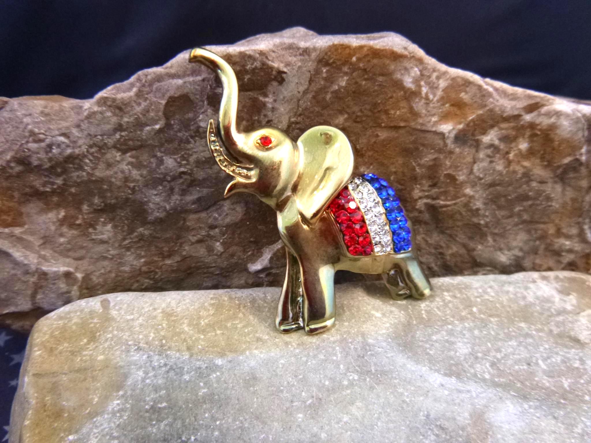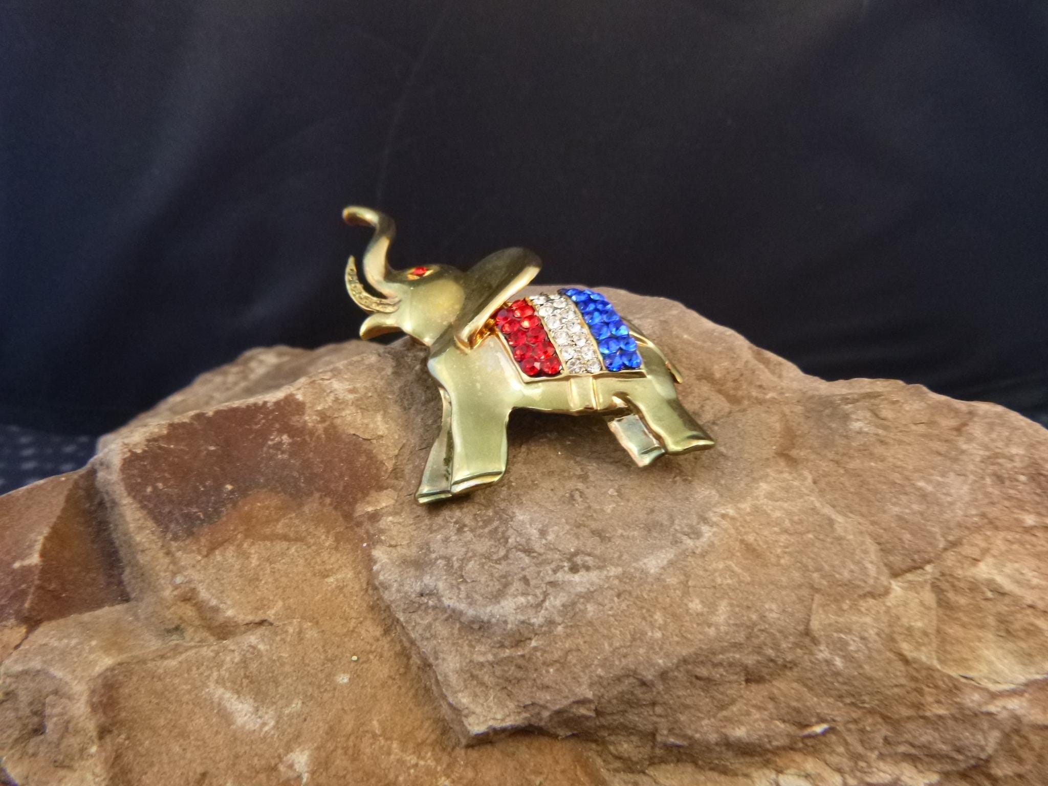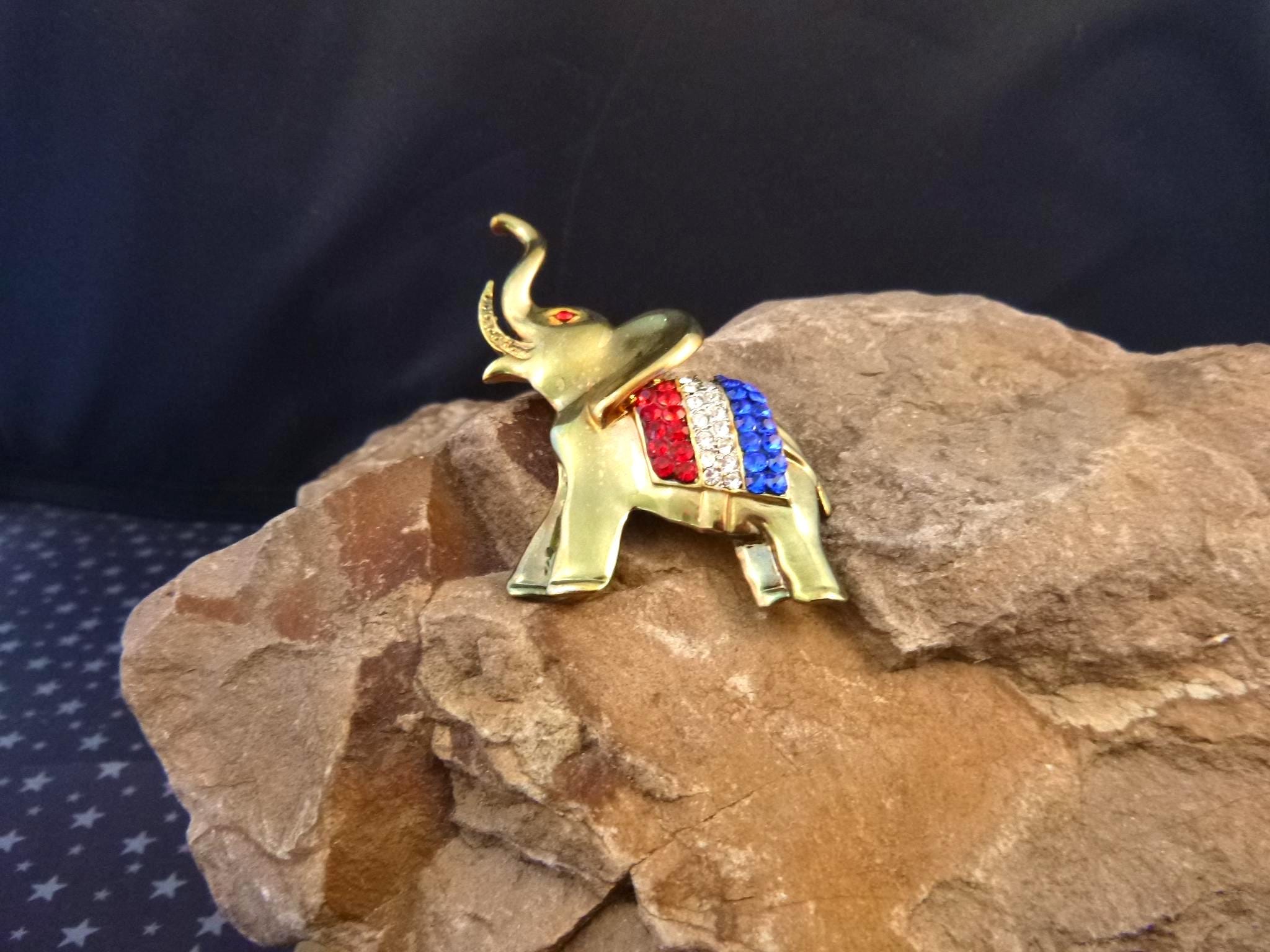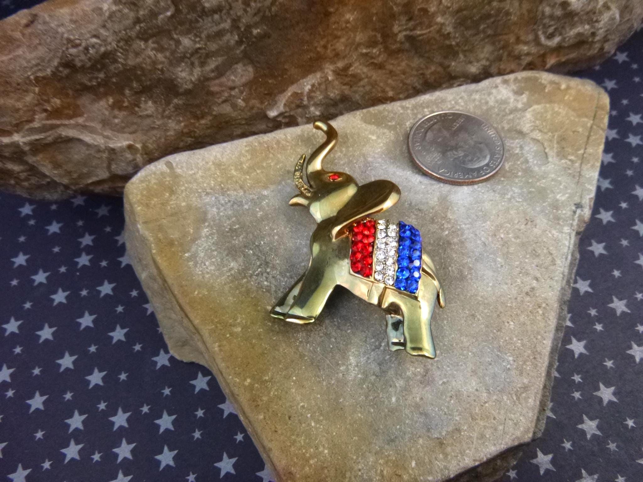 From Election Day to July 4th this elephant symbol of the Republican Party is perfect for those wanting to proclaim their affiliation with style. The pictures offer additional perspective on vintage condition and beauty of this red, white, and blue patriotic elephant brooch. (Note: I have a red camera and what you see on some pictures is its shadow; not metal discoloration).