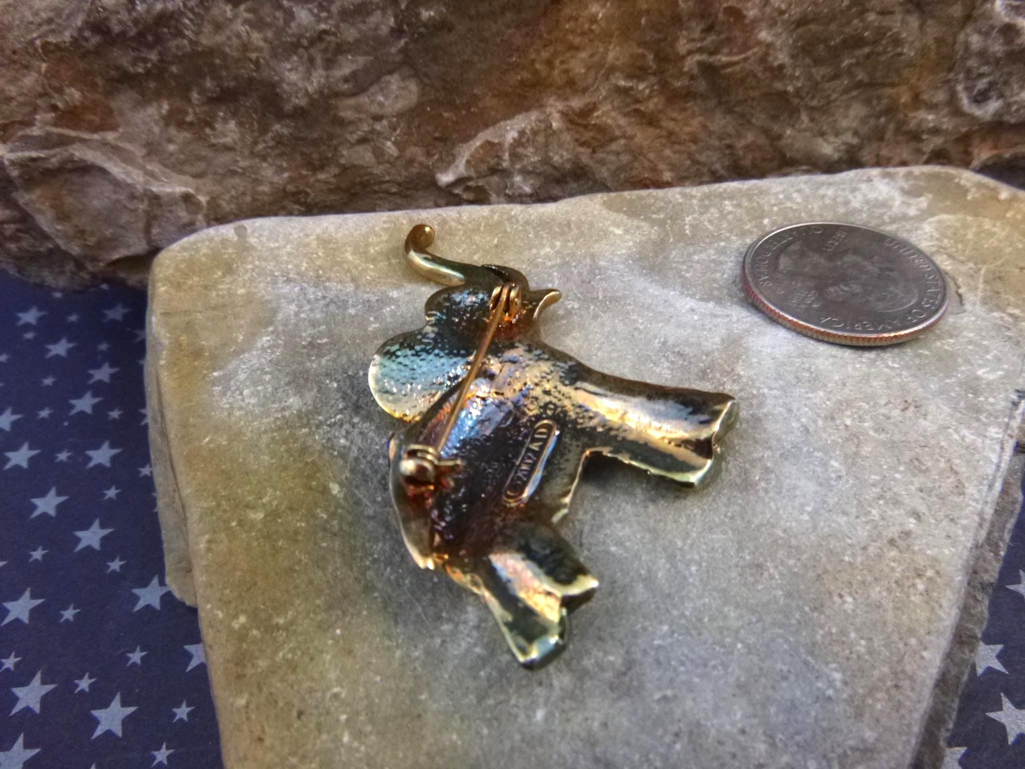 This Republican elephant figural, with his trunk up for good luck has red, white, and blue rhinestones draped on his back. On the back of this patriotic brooch is the maker’s mark and date in a rectangle: “© 2002 AD.”