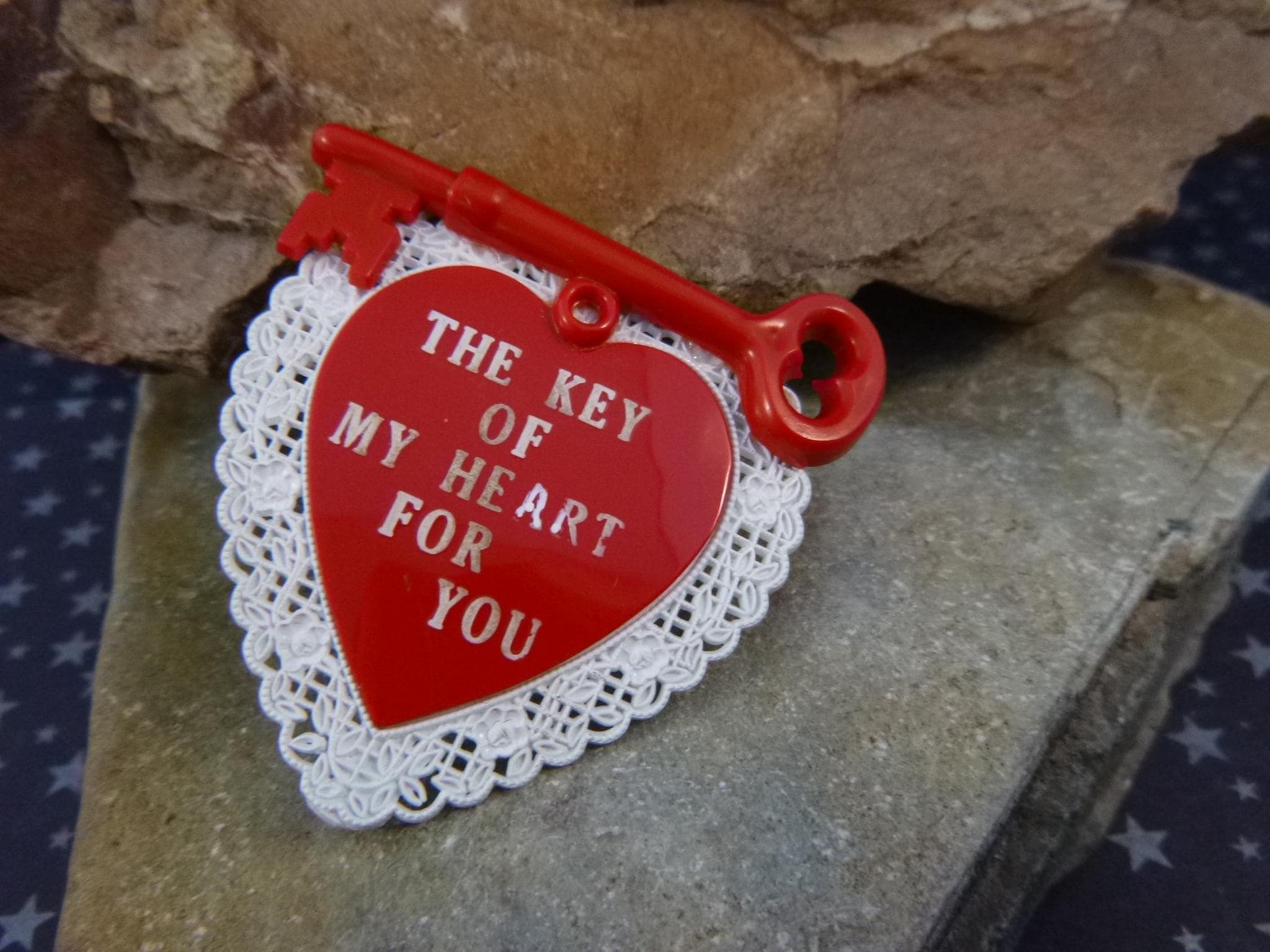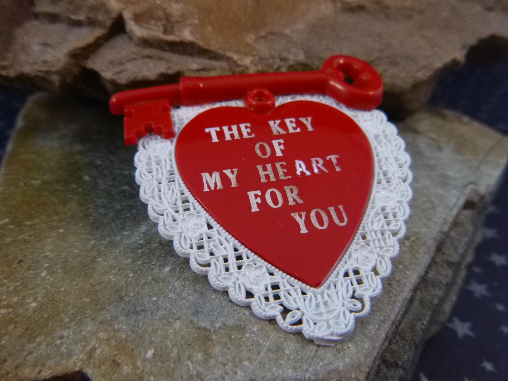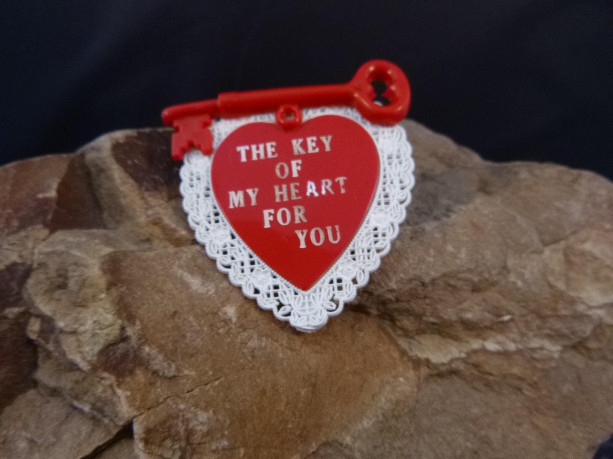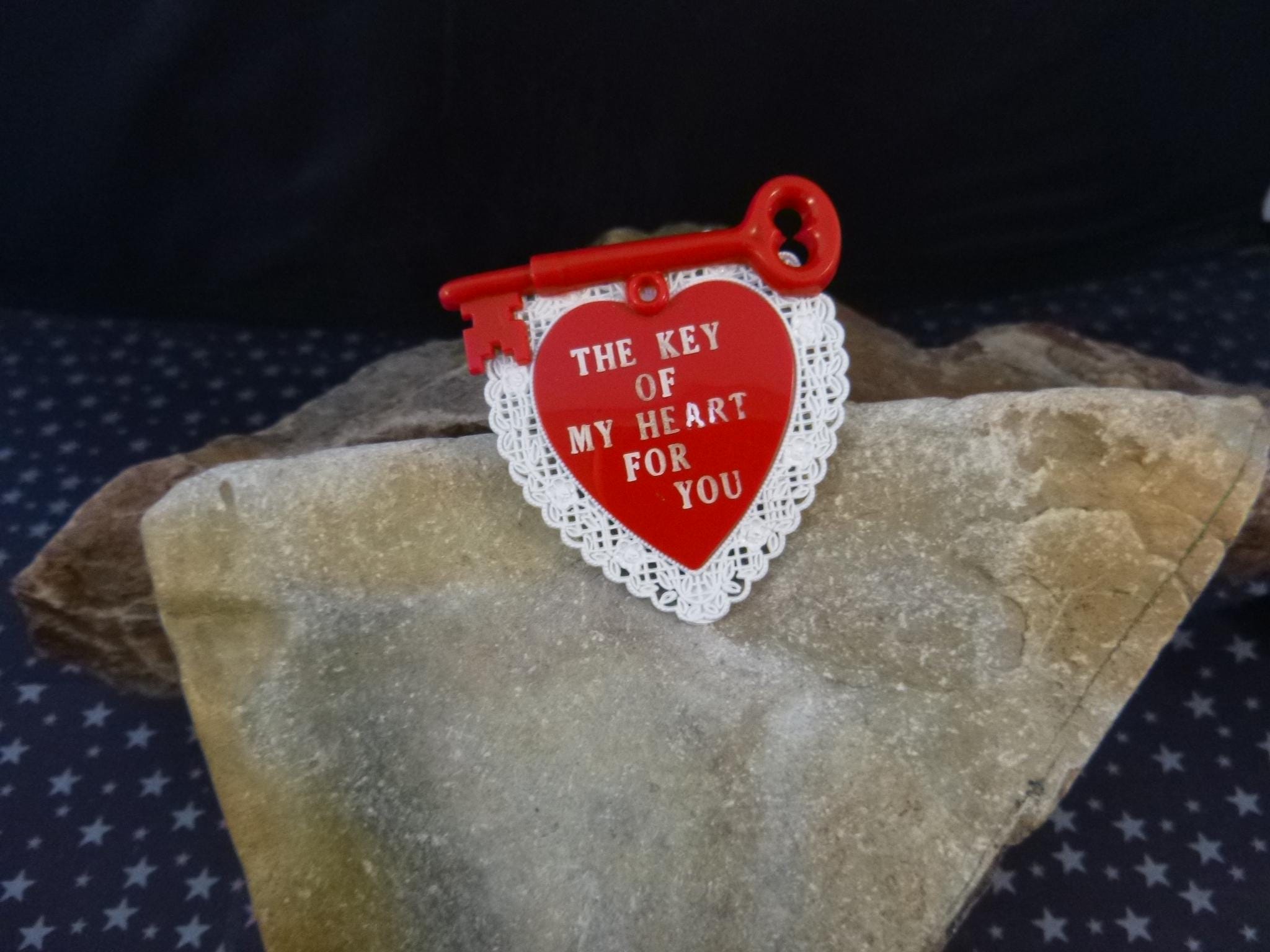 The pin is 1.75” wide and tall. The red heart and key are attached to a white lacey-looking heart. Overall, for its 60+ years of existence, this collectible heart pin is in good vintage condition, meaning it shows average wear for its age, including what appears to be a repair on the "R" letter in "heart" (see pictures). There is also some wear in the form of some light scratches to the plastic and wear on the letters. But generally, the red color is vibrant; the pin and fastener works fine and the brooch has been well cared for.