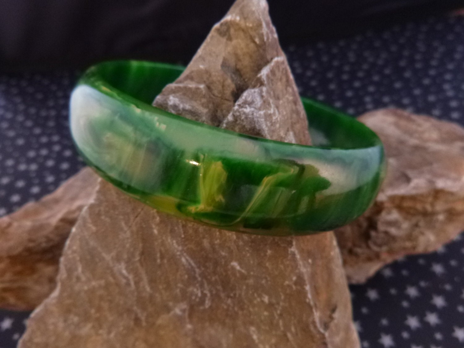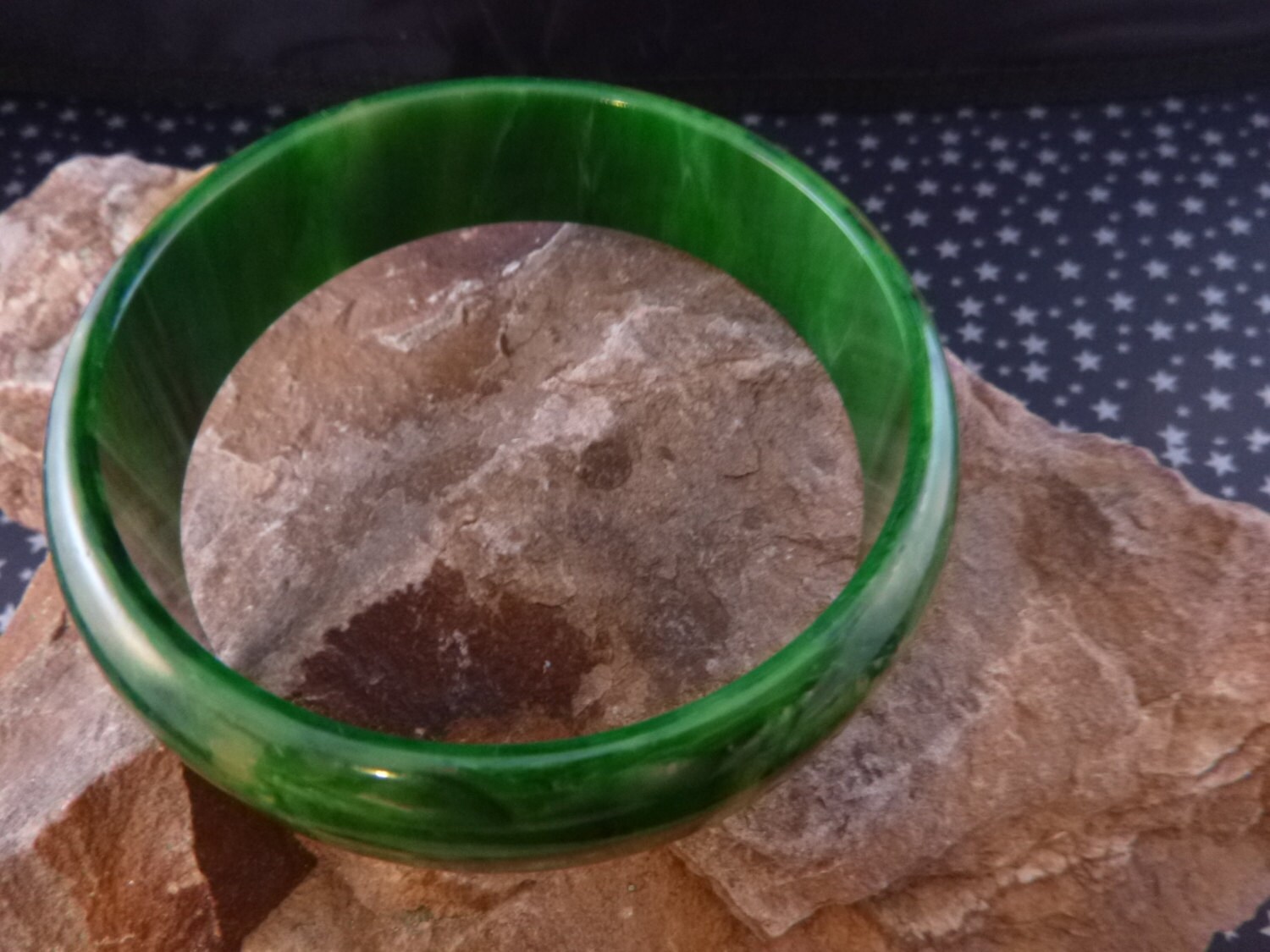 The bangle is a bracelet size 7.5-7.75” with an interior diameter of 2 5/8”. Typically it would fit a wrist that measures in the 6 – 7” range, depending on how you like your bangle to fit. The width of the bangle is .75” with interesting colors and a wonderful presence to it. The pictures offer greater perspective on the vintage charm of this beautiful Bakelite marbled green bangle.