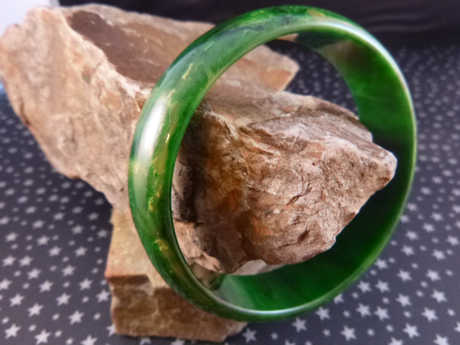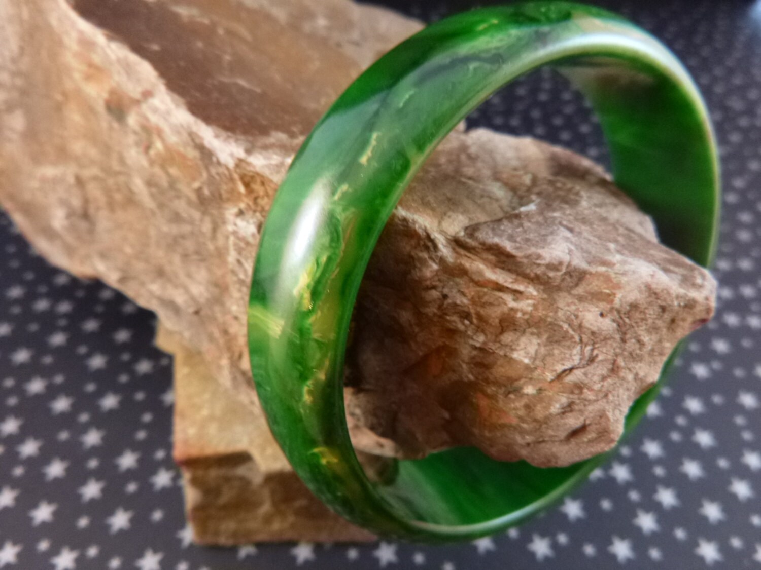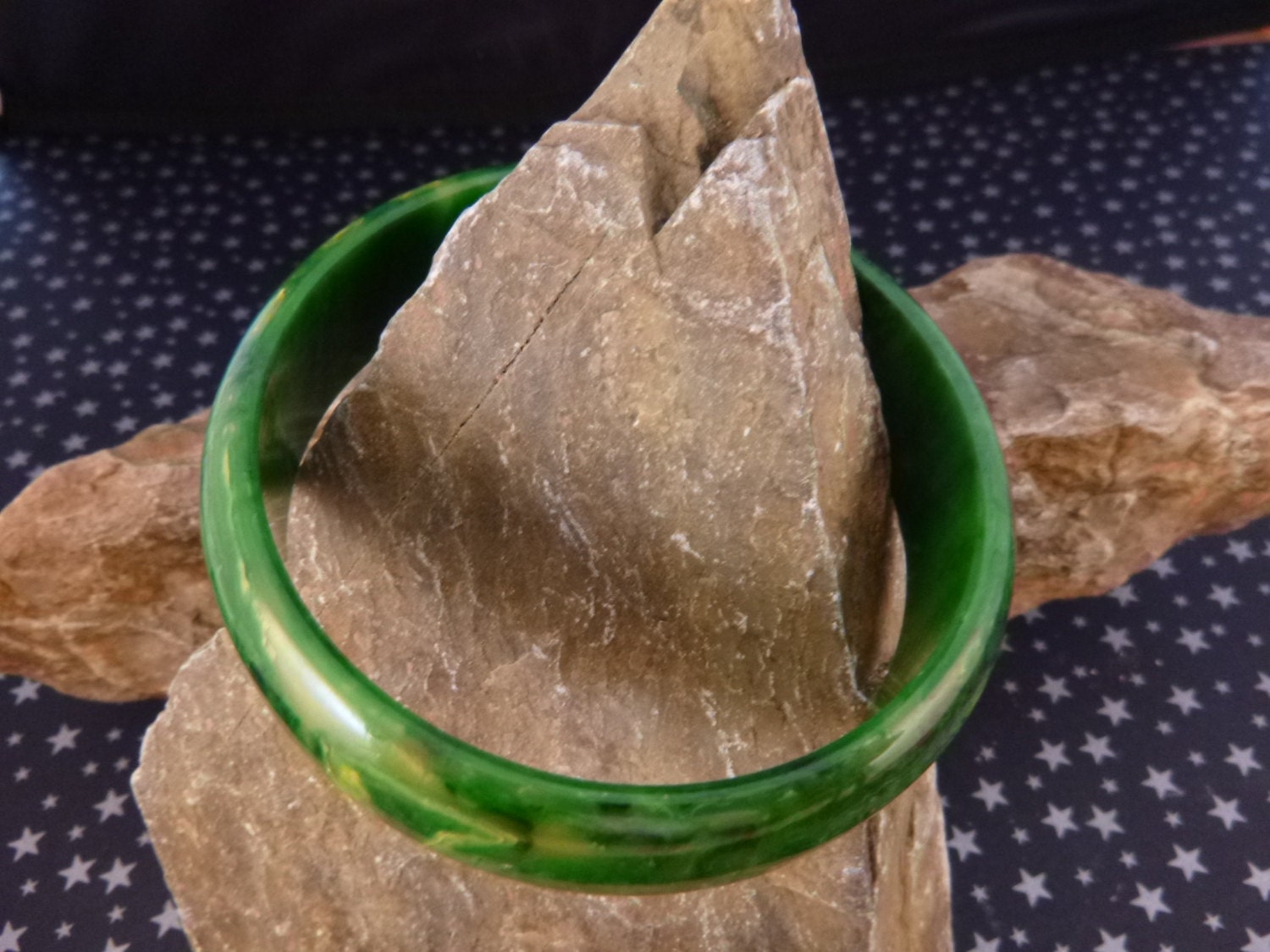 I suspected that this vibrant marble green bangle might be Bakelite when I spied it on an overcrowded seller’s table at the Mile High Flea Market in Denver. The first thing I did was to test it when I returned home using the Simichrome test. It come out positive, producing a yellow residue on a cloth.