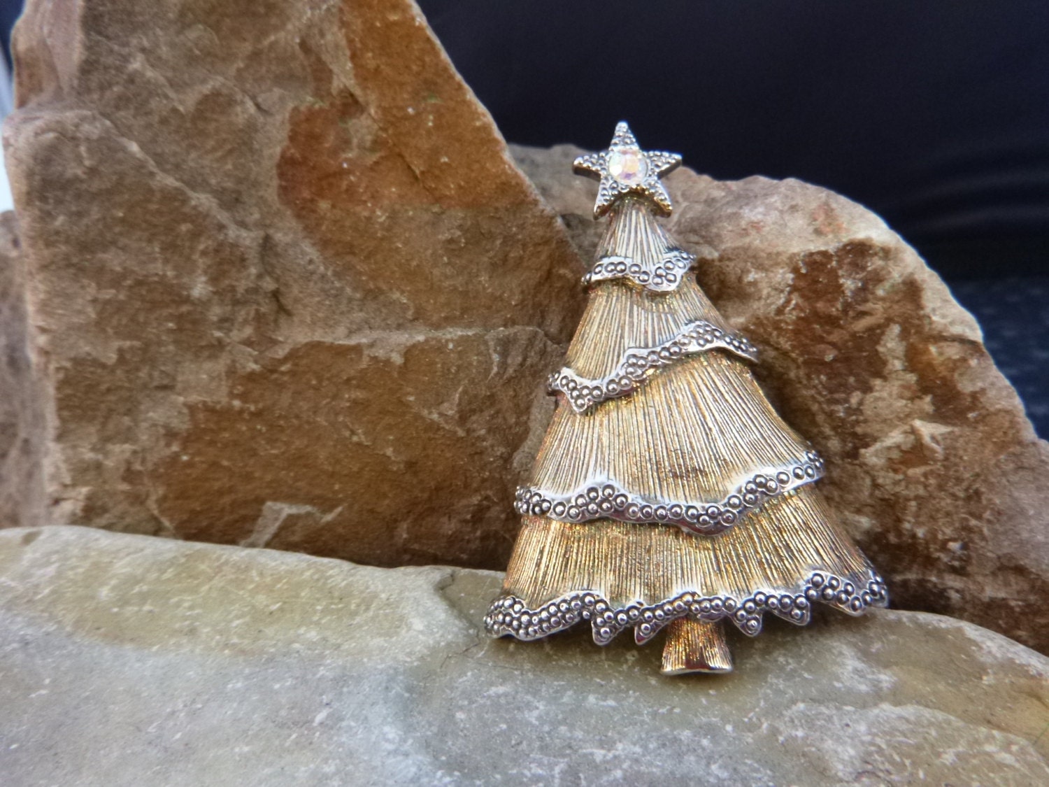 The simple styling of this Christmas tree pin adds a sense of tradition and elegance to it. Layered on the gold tone textured metal is a raised silver tone garland, topped with an aurora borealis rhinestone in the star. Over all the brooch is in very good vintage condition.