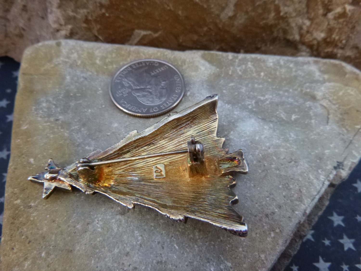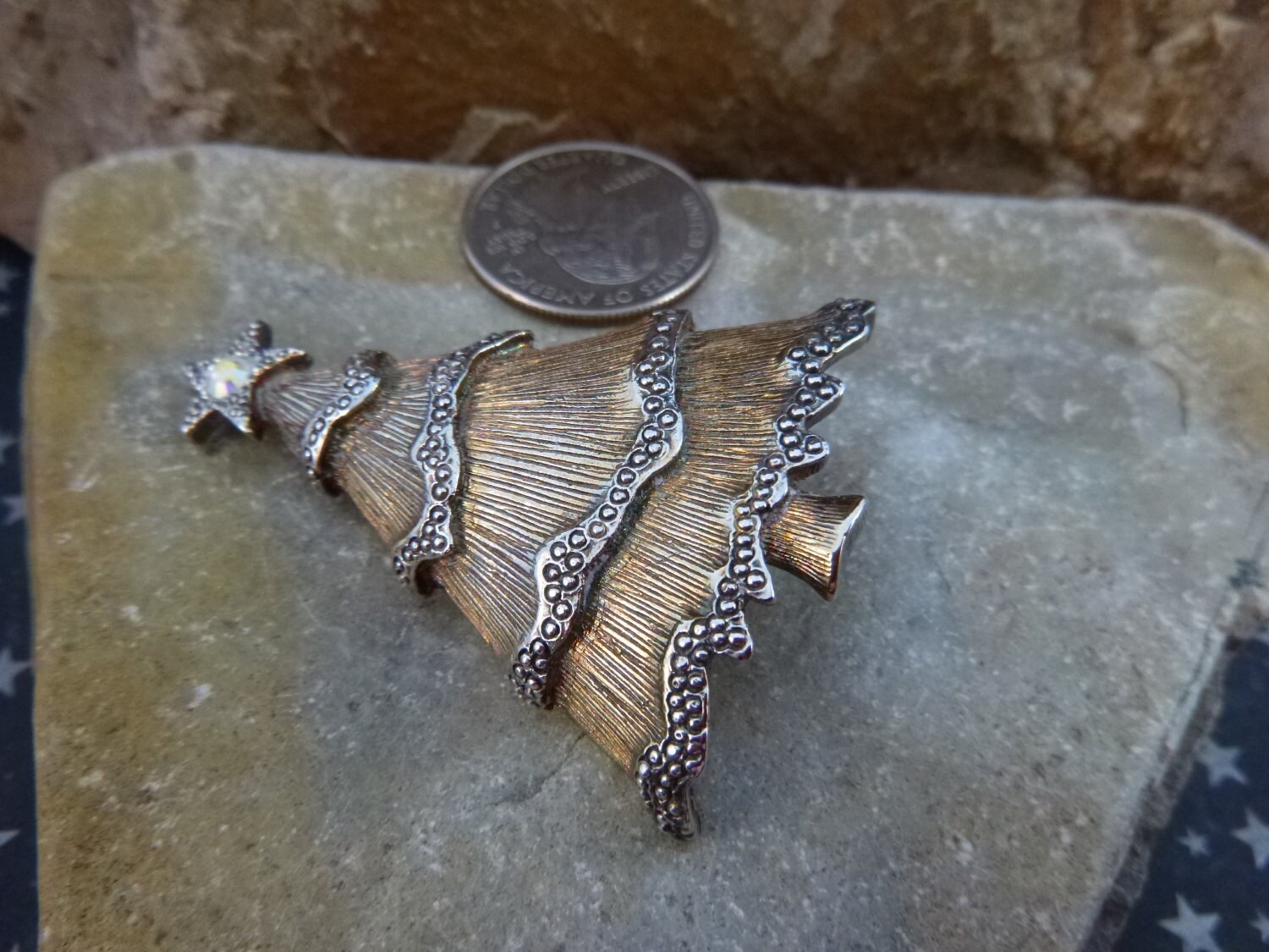 I spied this lovely two-tone Christmas tree pin in an antique mall in Idaho while on vacation. On the back is the marker’s mark “LC” in script in a square. This is one of the marks of Liz Claiborne, established in l976.