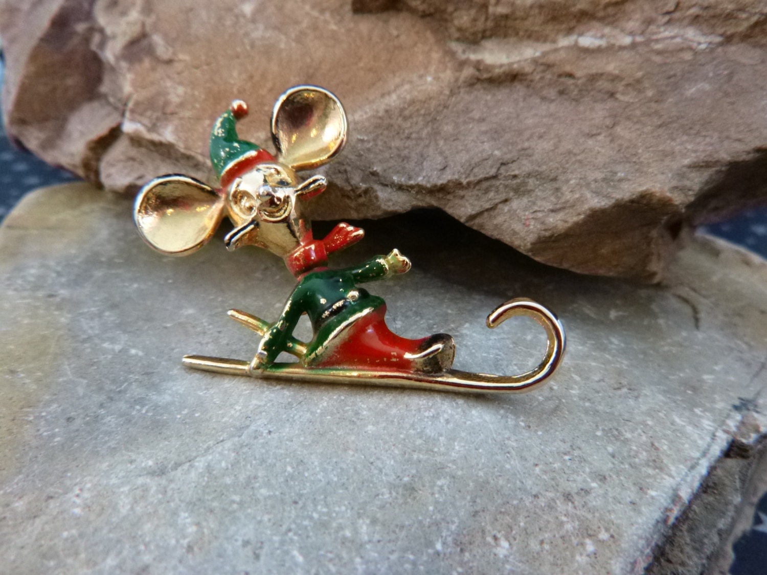 This festive little mouse is decked out in red and green and gleefully riding a toboggan with one hand. Set in a pale gold tone metal, overall, the pin is in good vintage condition, showing average wear for its 40 years of existence, including wear to the enamel (see pictures). Personally, I think that makes him even cuter. The pin measures 1.75” long and 1.25” tall.