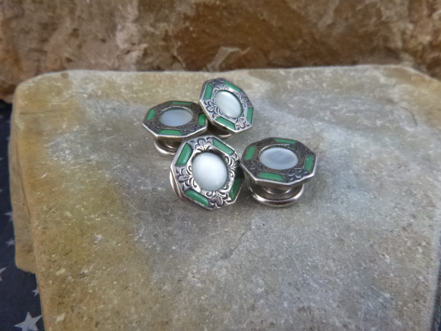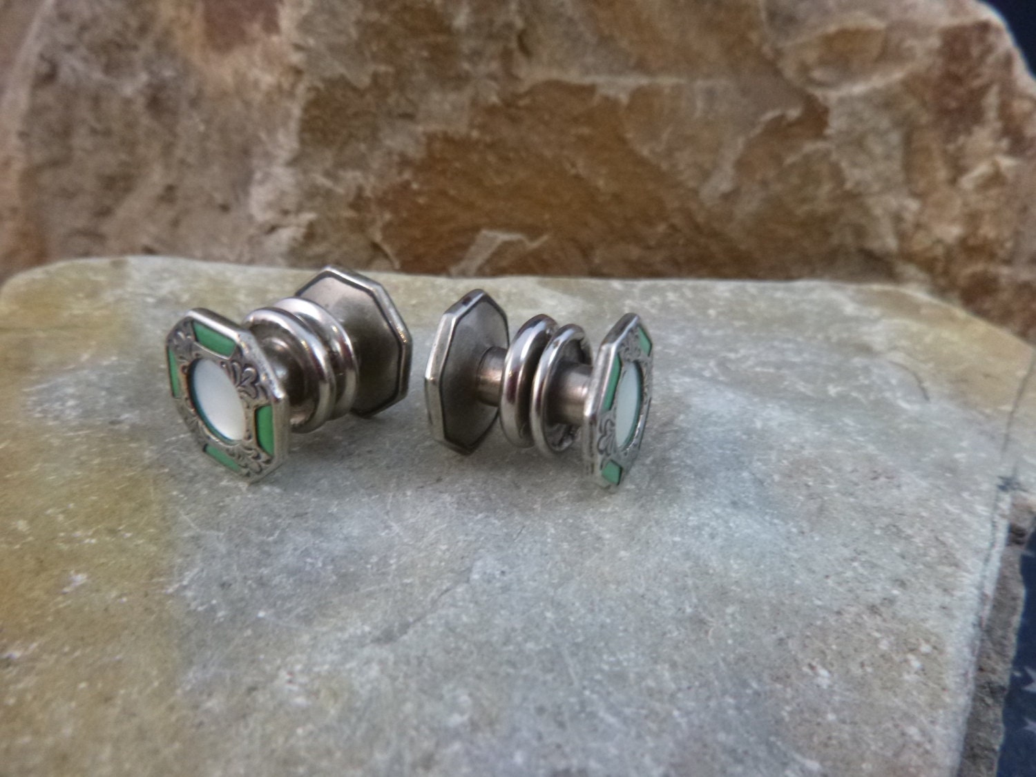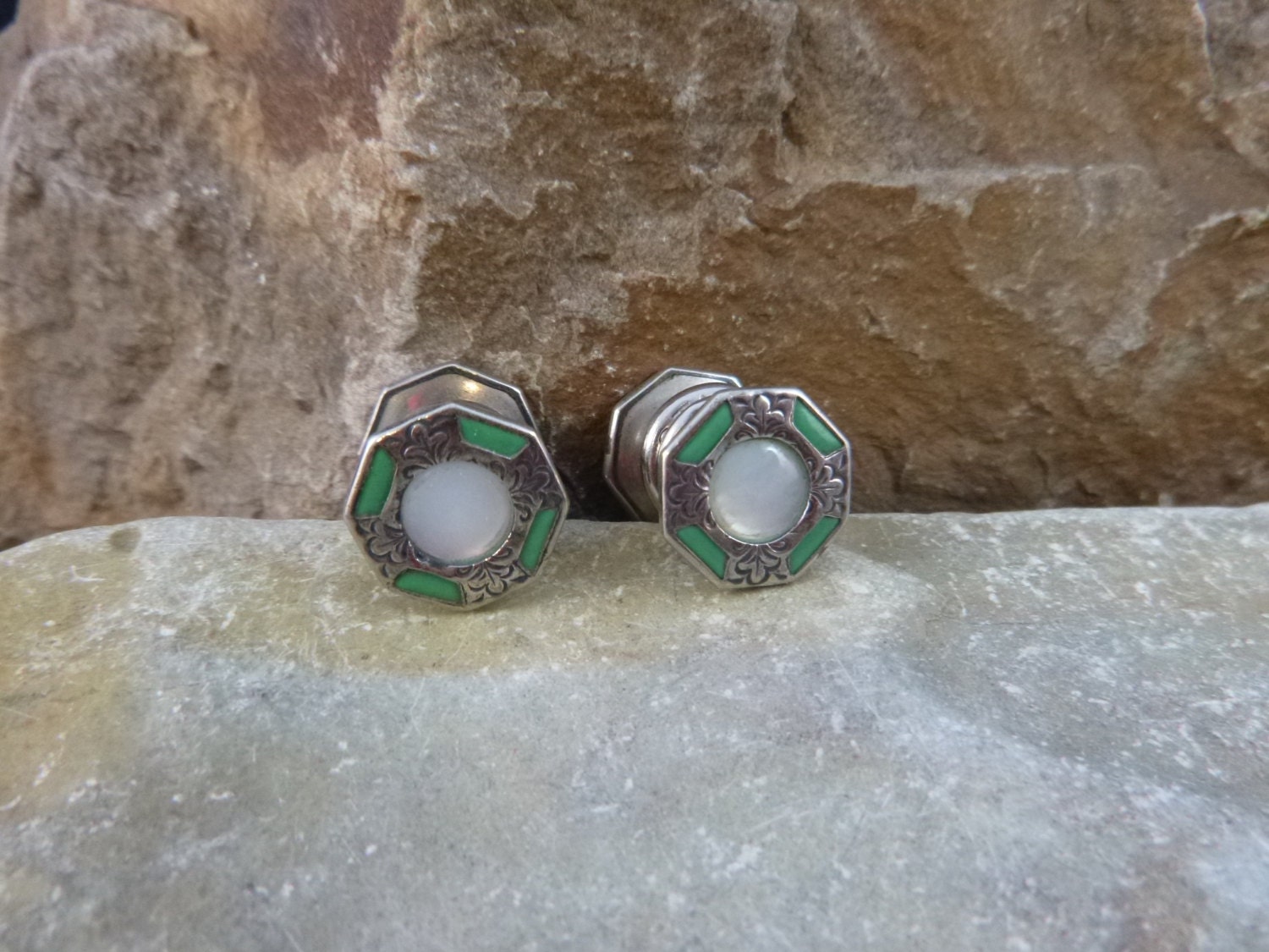 The face of the octagon shape is .5” in diameter; the face to face depth between sides is 5/8”. The green enamel is bright and the silver base has a warm patina which adds to their charm. The pictures add greater perspective on the vintage condition and charm of these l920s vintage snap cuff links.