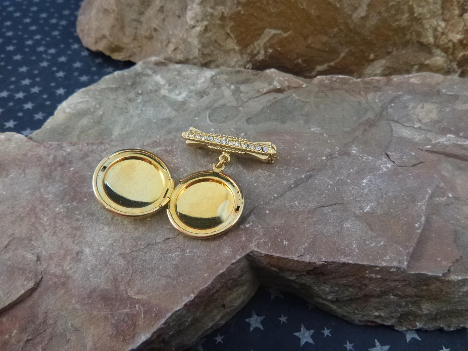 The locket measures .75” in diameter and dangles 1.25” from the top of the bar. There are two interior picture places measuring slightly more than .5”. Overall this Victorian style locket brooch is in very good vintage condition, with a few light scratches to the back metal and a light mark on the inside (see right side of picture 4). The rhinestones are bright and intact; the clasp and pin work fine; the locket fastener is tight.