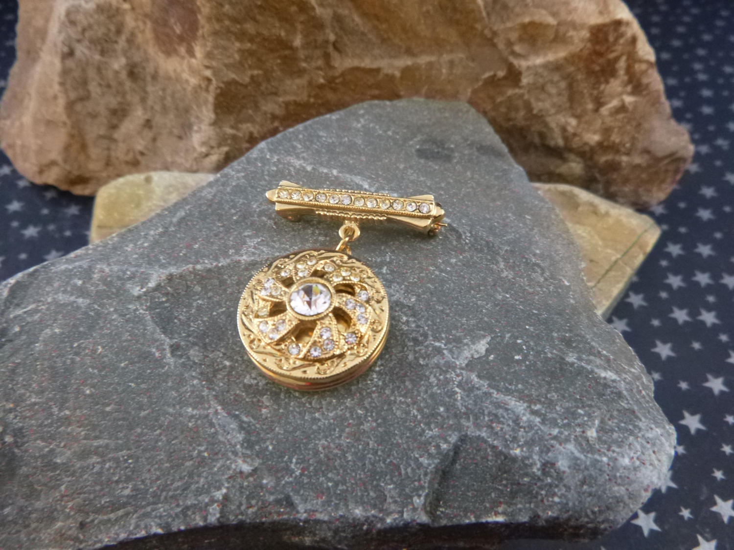 The lovely locket brooch dates from the l980s when Victorian Revival of jewelry designs were popular. The circle locket is made of a gold tone metal, with a center faceted large glass stone surrounded by rhinestones. It dangles from a small bar pin lined with rhinestones.