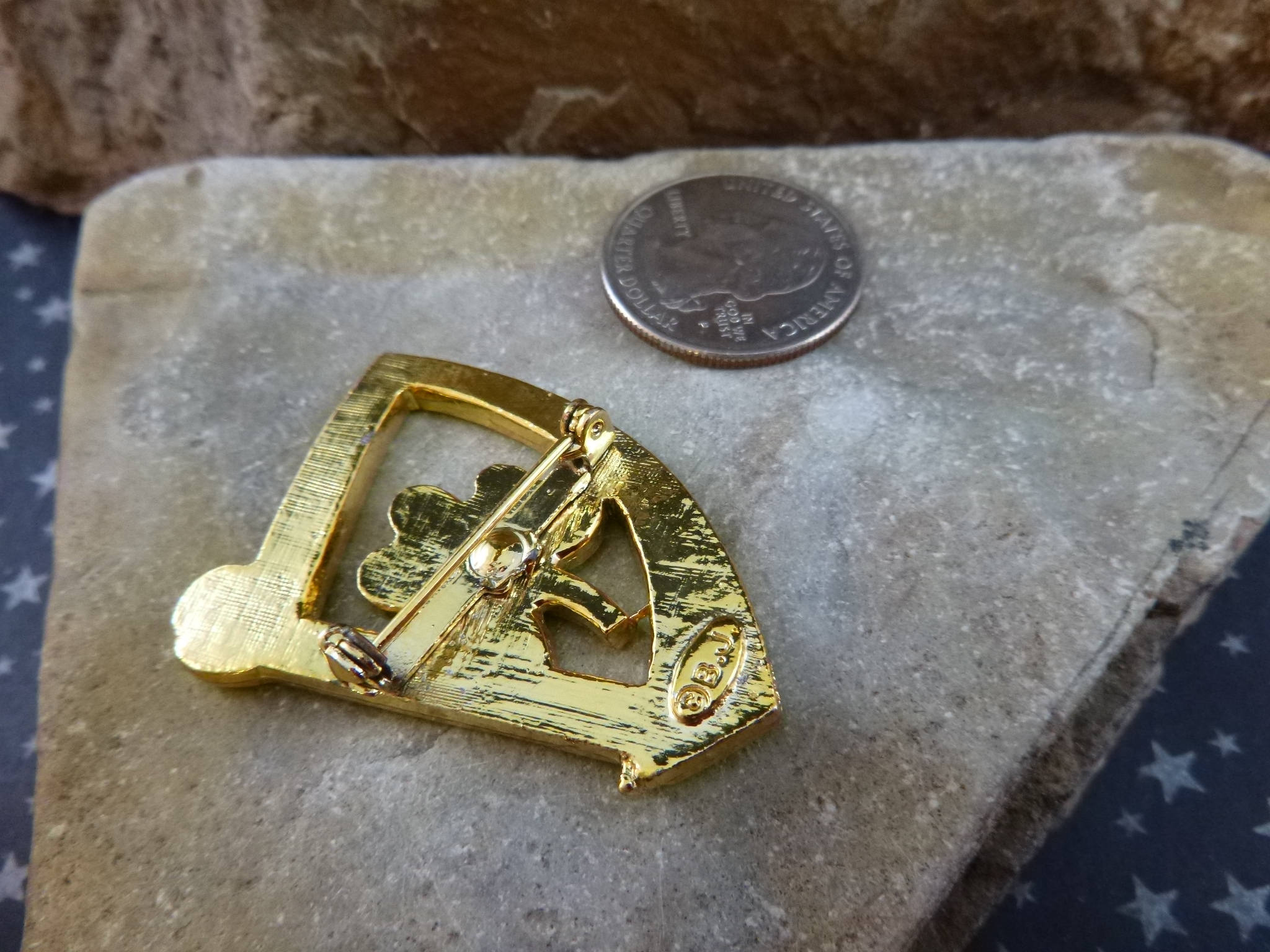 The maker’s mark on the back reads “© B. J.” which stands for “Beatrix Jewels.” Originally founded in l946, Beatrix Jewelry company was sold in l975 to Treasure Master and changed its name to B.J. using that mark from l975 until it closed in l983. This pin is from that time period.
