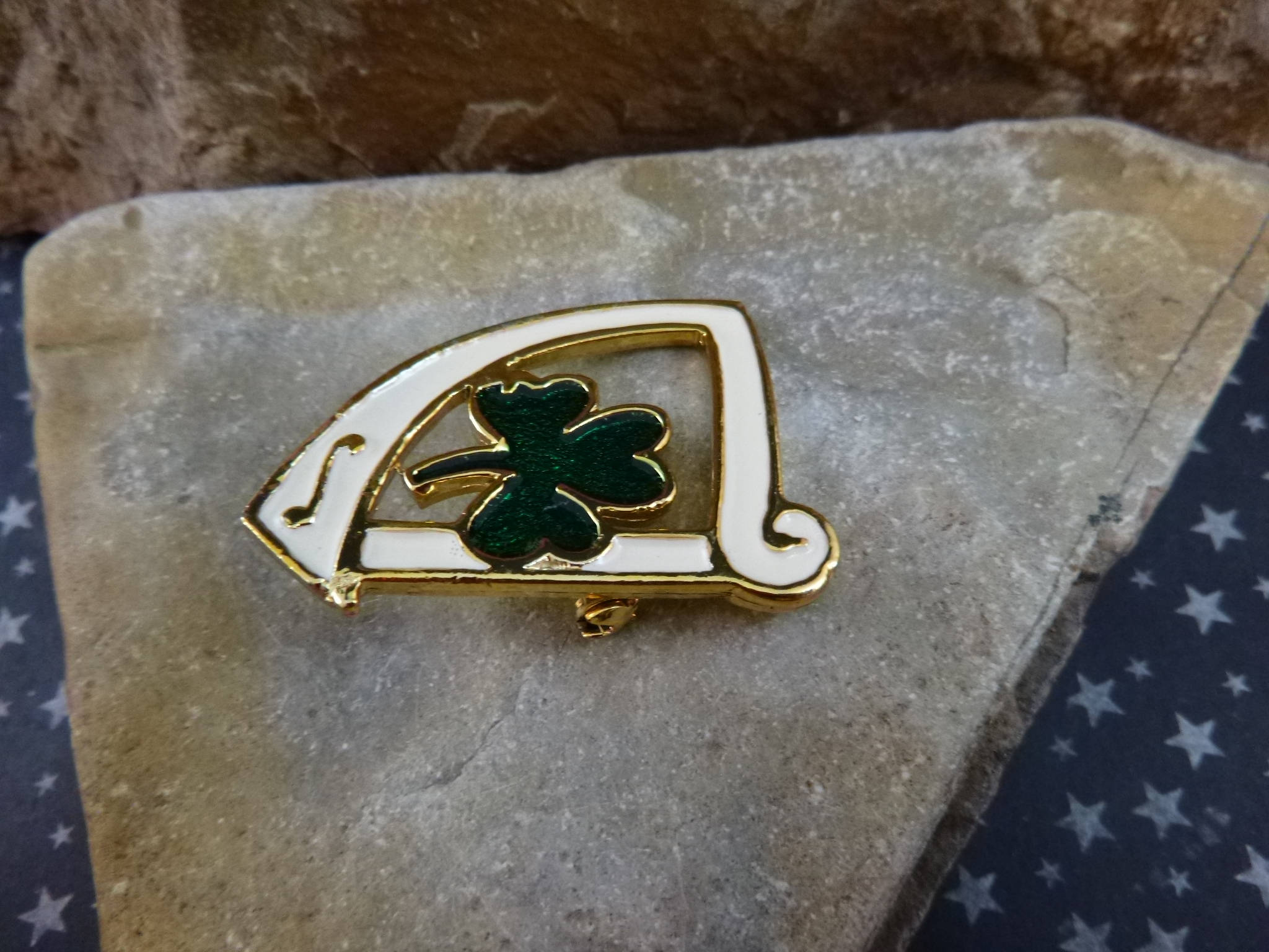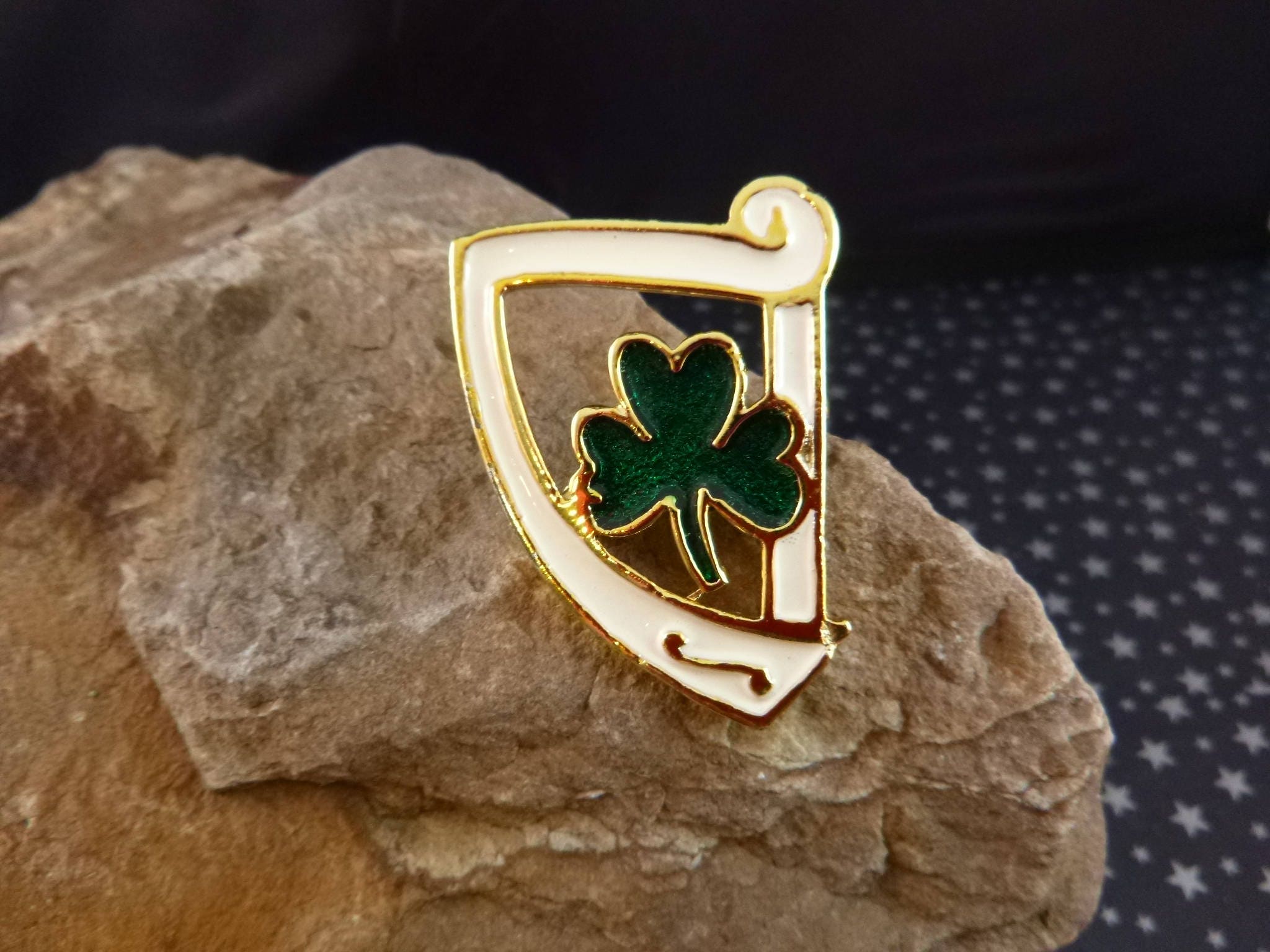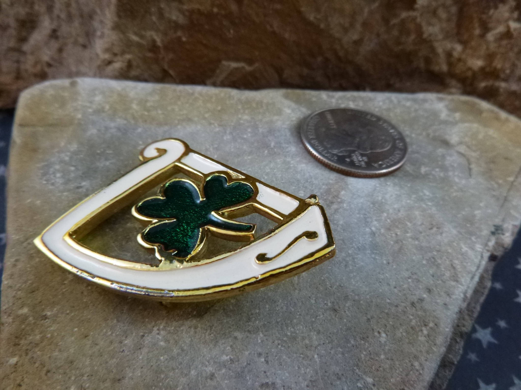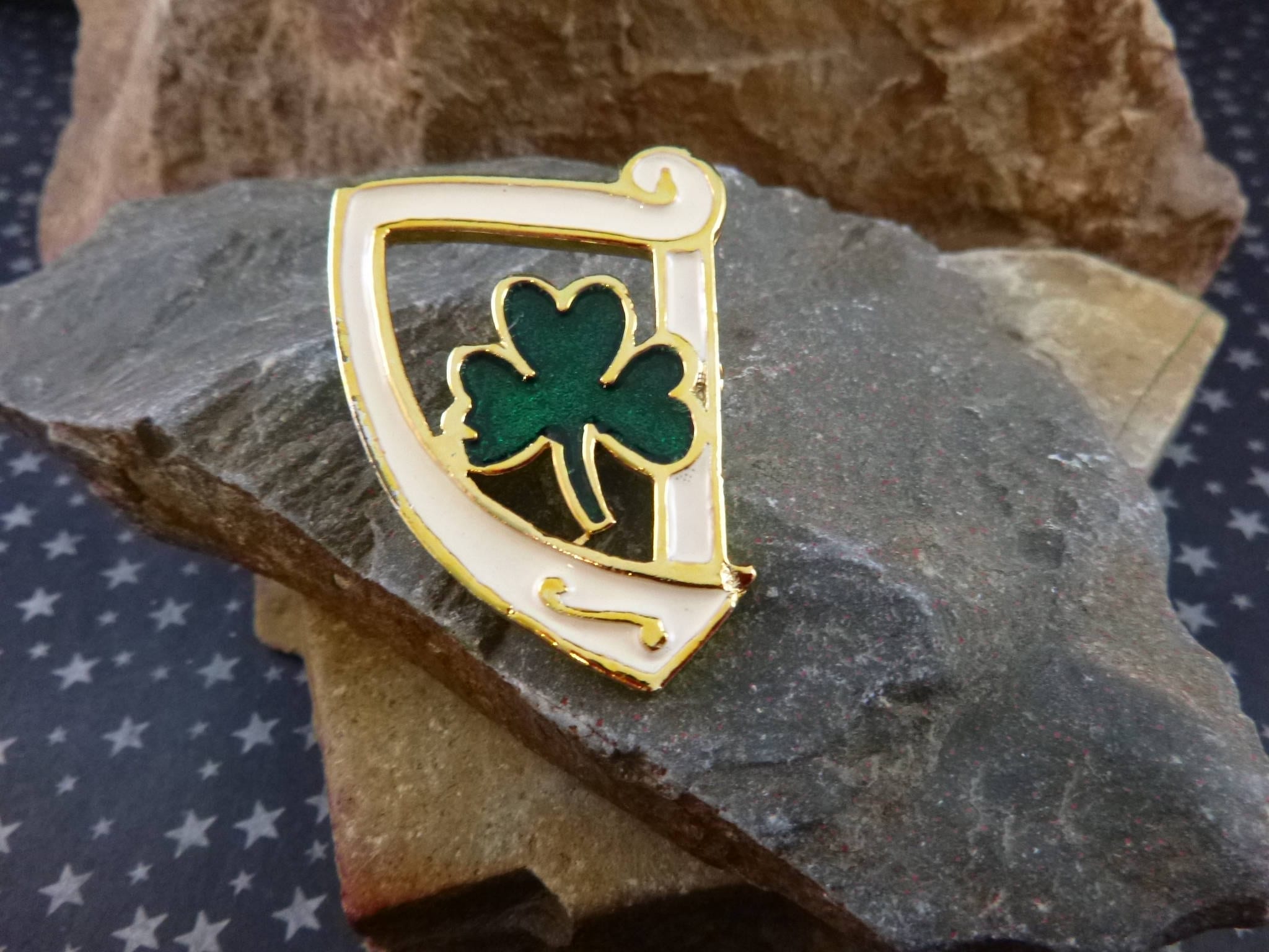 I learned about the importance of the harp to Ireland while I was there on vacation. It’s been part of the Celtic heritage since medieval times and a symbol on the coats of arms of the first Irish King. The harp and shamrock both symbolize Irish history and traditions. So, I was particularly excited to find them together on this lovely green and white enamel vintage brooch.