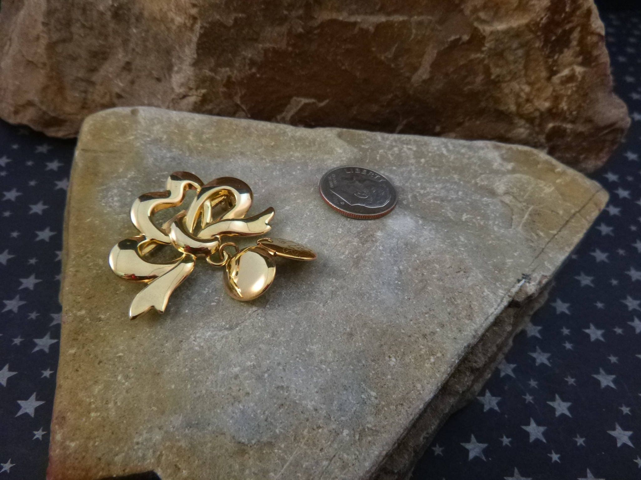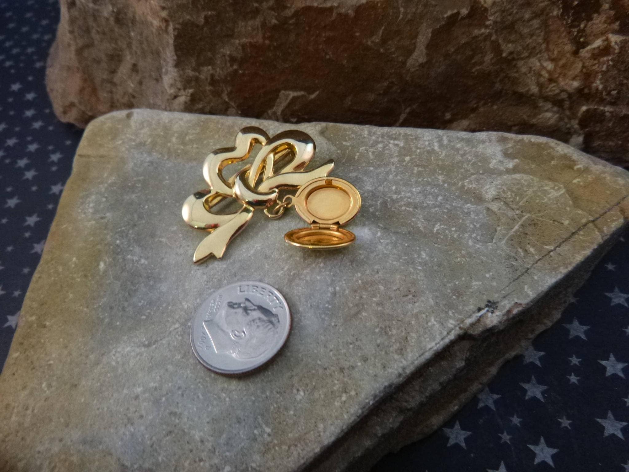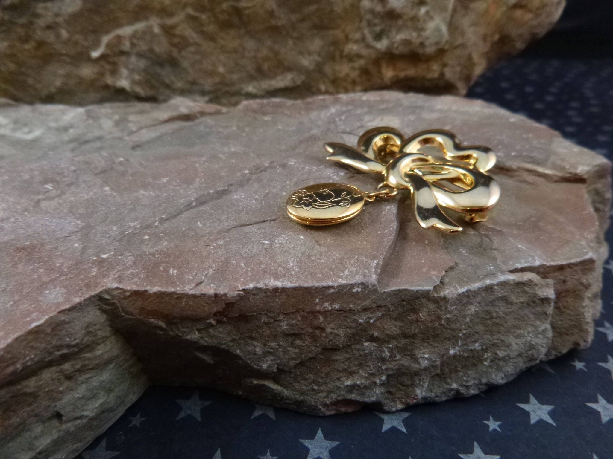 This vintage brooch is likely from the l970s when a Victorian revival in jewelry was popular. The oval locket measures just .5” when closed; the bow it hangs from is 1.5” long; and from the top of the bow to the bottom of the locket is 1.5”.