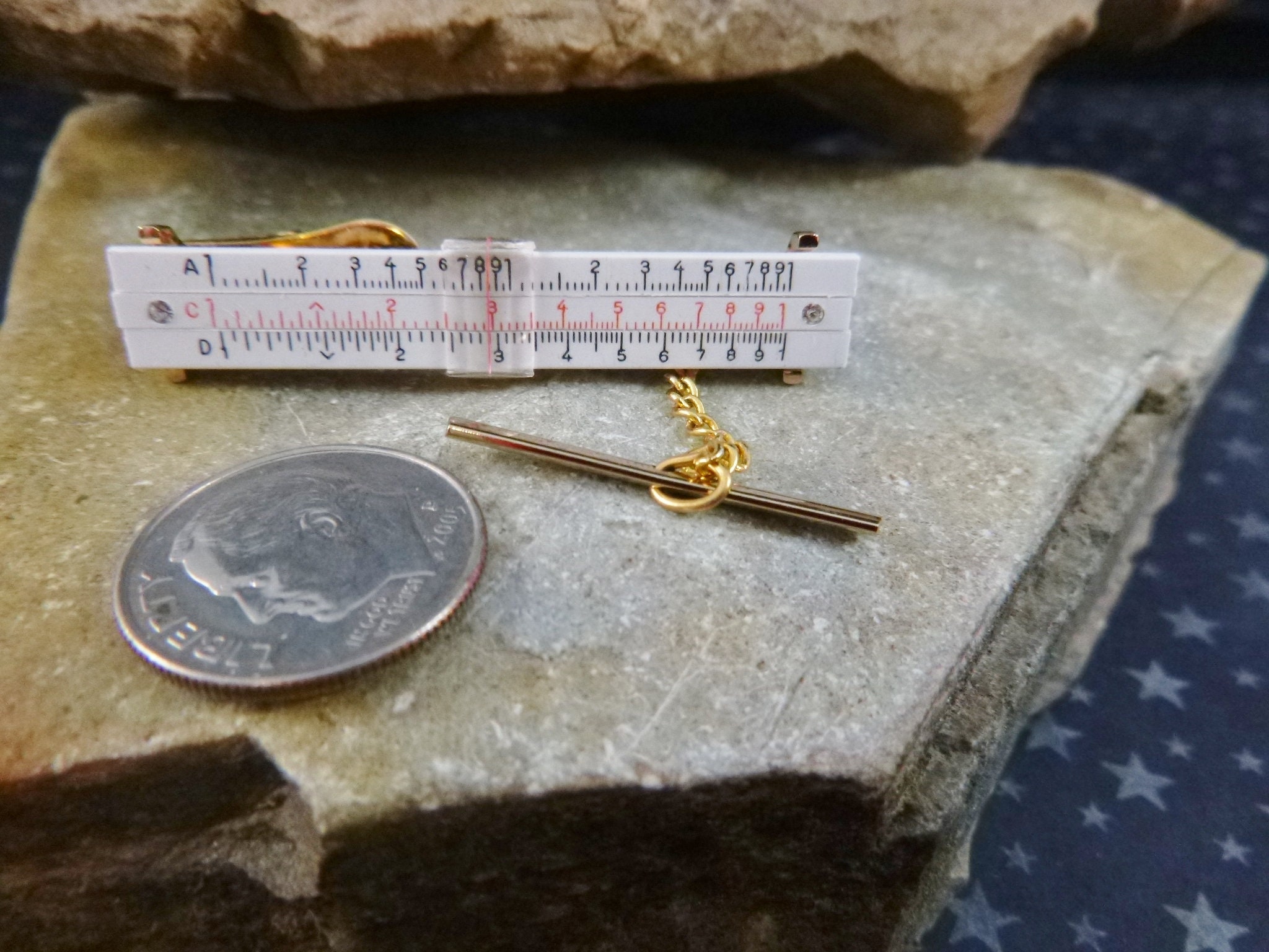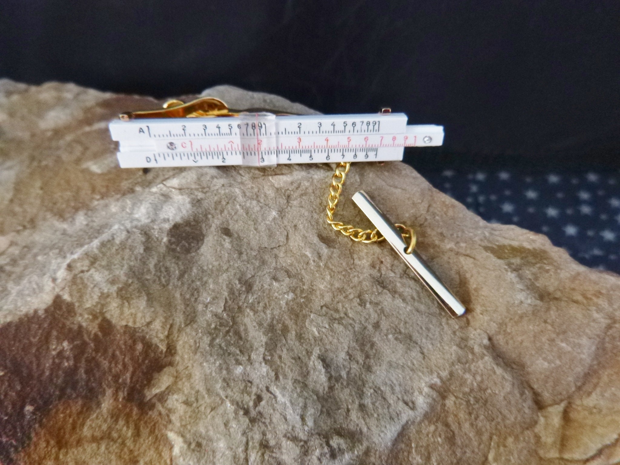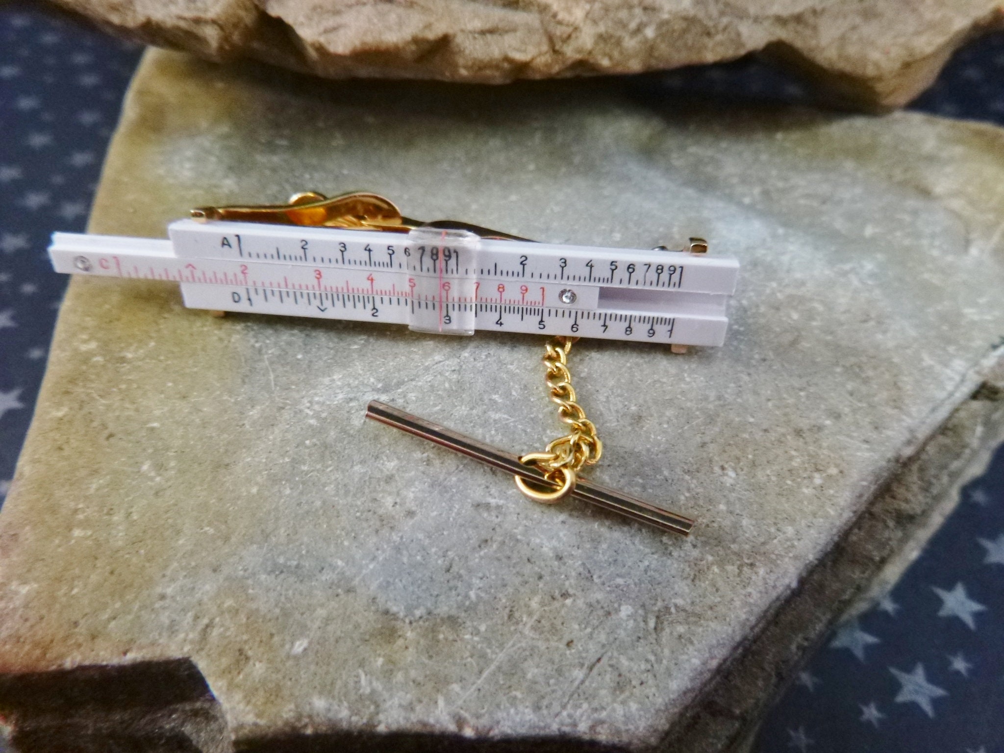 This 20th-century slide rule tie clasp is perfect for any 21st-century engineer, software developer, tech enthusiast, or mid century vintage lover. This miniature slide rule works and has a sliding middle bar which has two small rhinestones, one at each edge. It is quality crafted in gold tone metal with a well detailed plastic ruler that sits on top and is attached to the metal. There is also a slide dome which is stationary. And a chain linked shirt guard.